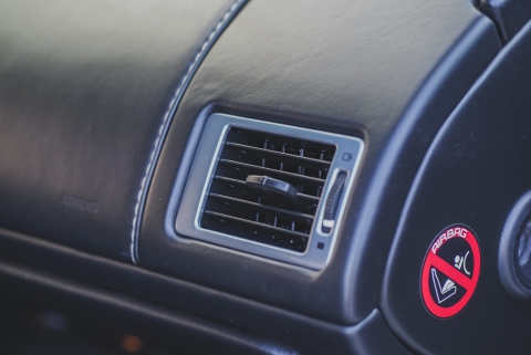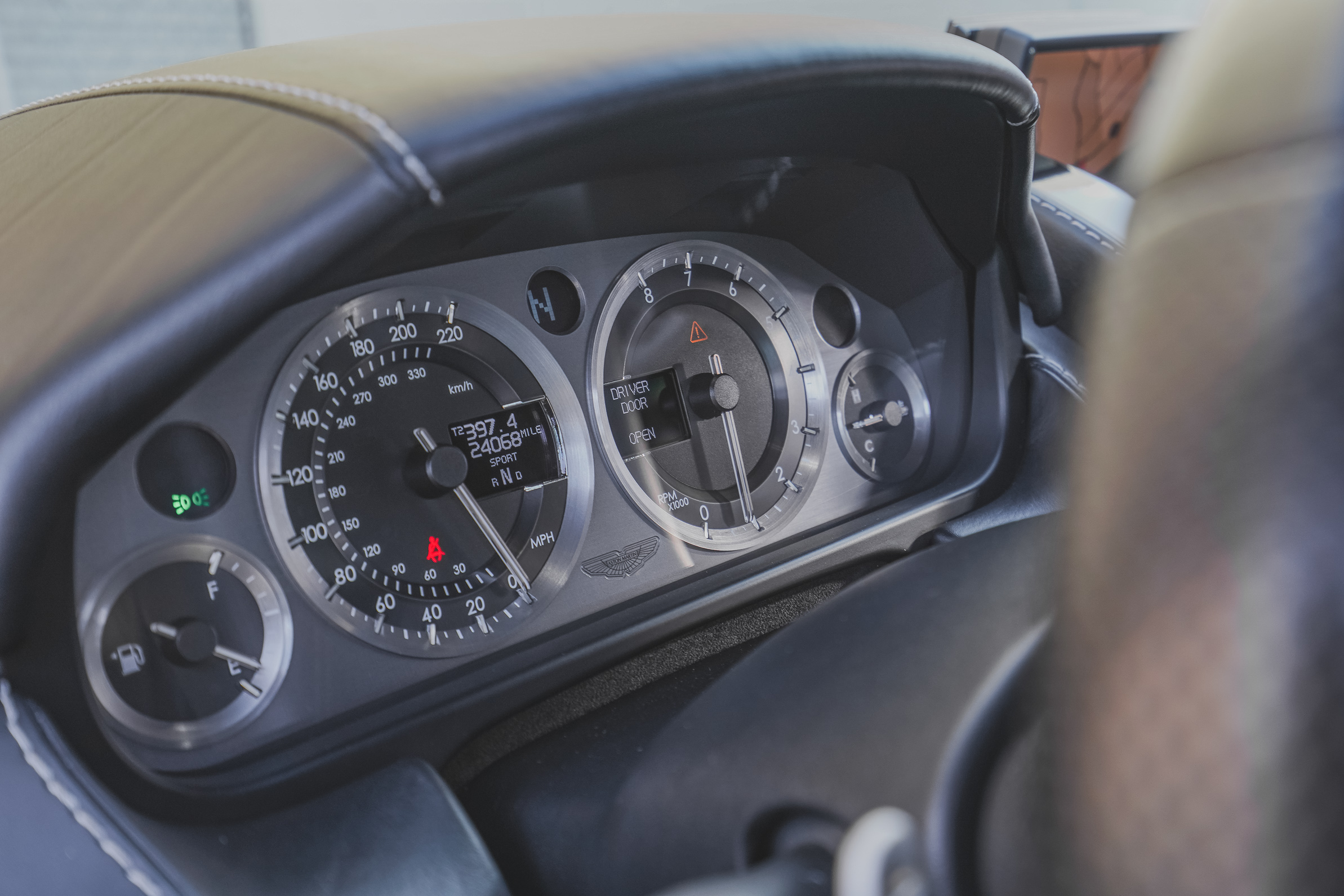 Instrumentation consists of a 220-mph speedometer and a reverse-sweep 8k-rpm tachometer, as well as gauges for fuel level and coolant temperature. The digital odometer has 24k miles.