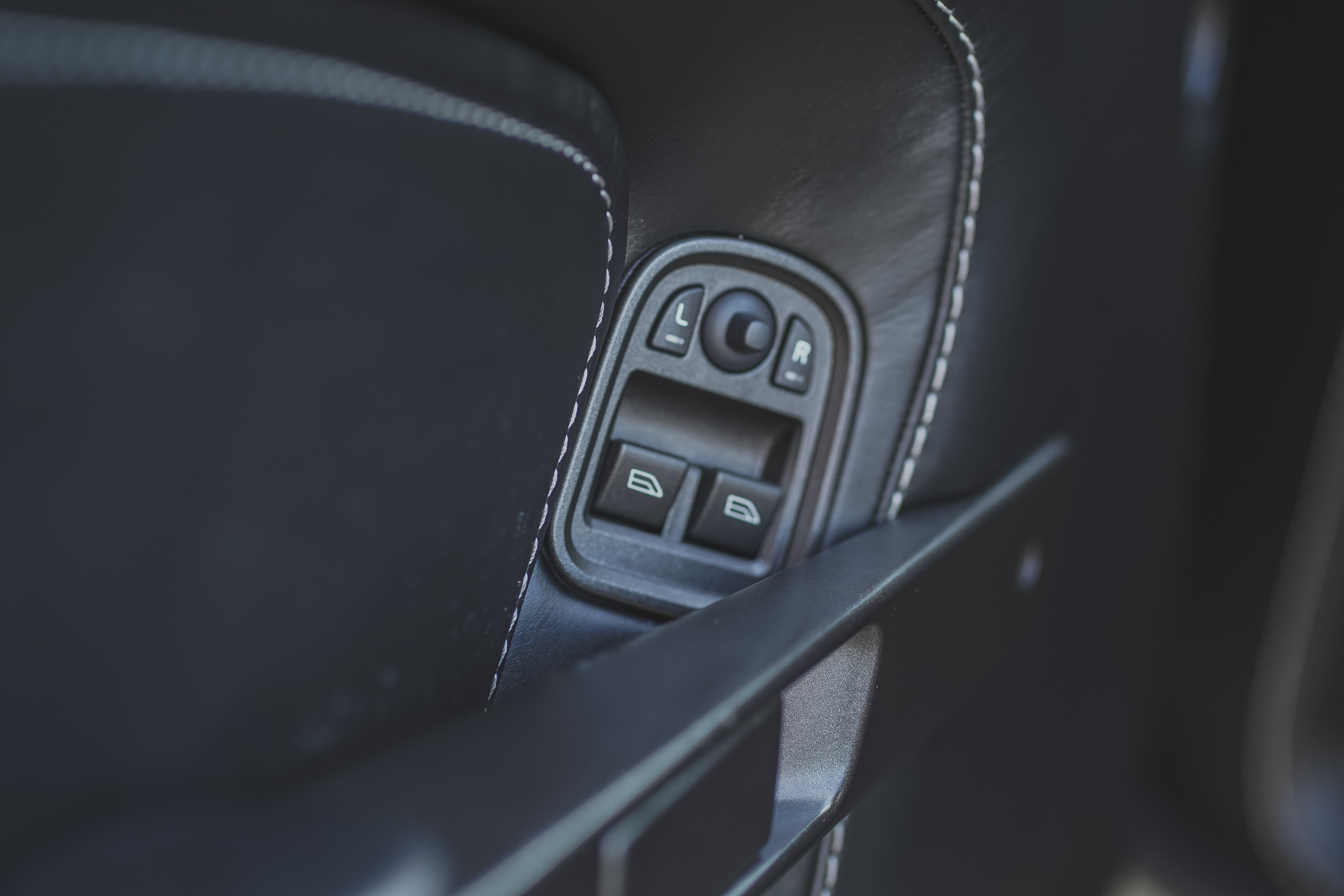 The cabin is trimmed in Obsidian Black leather with white stitching. Amenities include automatic climate control, heated and power-adjustable front seats with memory, a premium CD stereo, Bluetooth capability, and a pop-up navigation screen. The driver’s seat bottom shows wear.