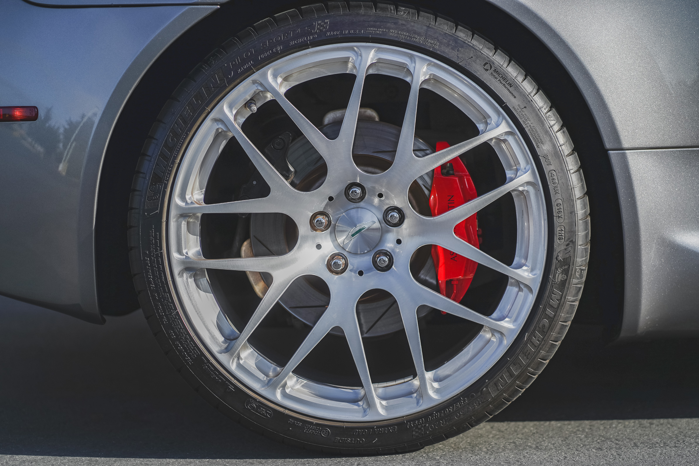 Staggered-width 20? aftermarket wheels wear Michelin Pilot Sport 4S tires showing a mix of 2017 and 2018 date codes. Braking is handled by red calipers and slotted discs at all four corners.