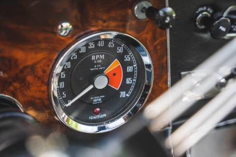 The banjo-style steering wheel frames Smiths black-dial instrumentation consisting of a 140-mph speedometer, a 7k-rpm tachometer, a fuel-level gauge, and a combination gauge displaying oil pressure and water temperature. The five-digit odometer shows 43k miles, approximately 2k miles of which were added under current ownership.