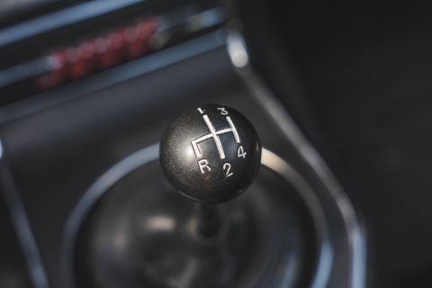 The two-plus-two cabin features bucket seats trimmed in Black Ambla vinyl, and interior appointments include a center console, a locking glovebox, wood trim, and a passenger-side grab handle.