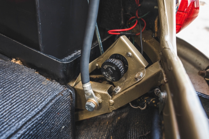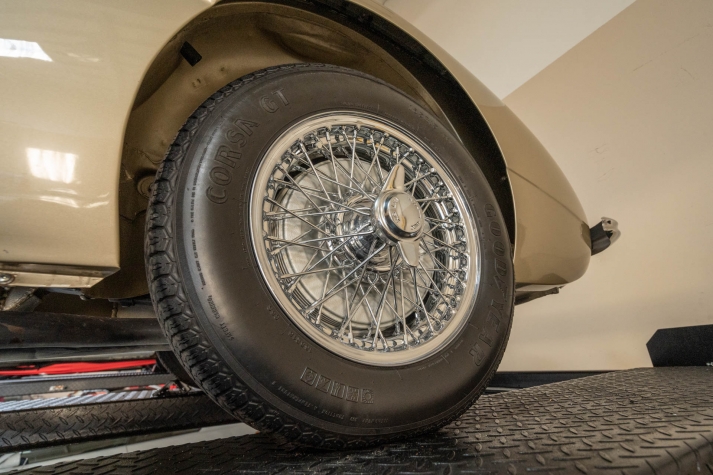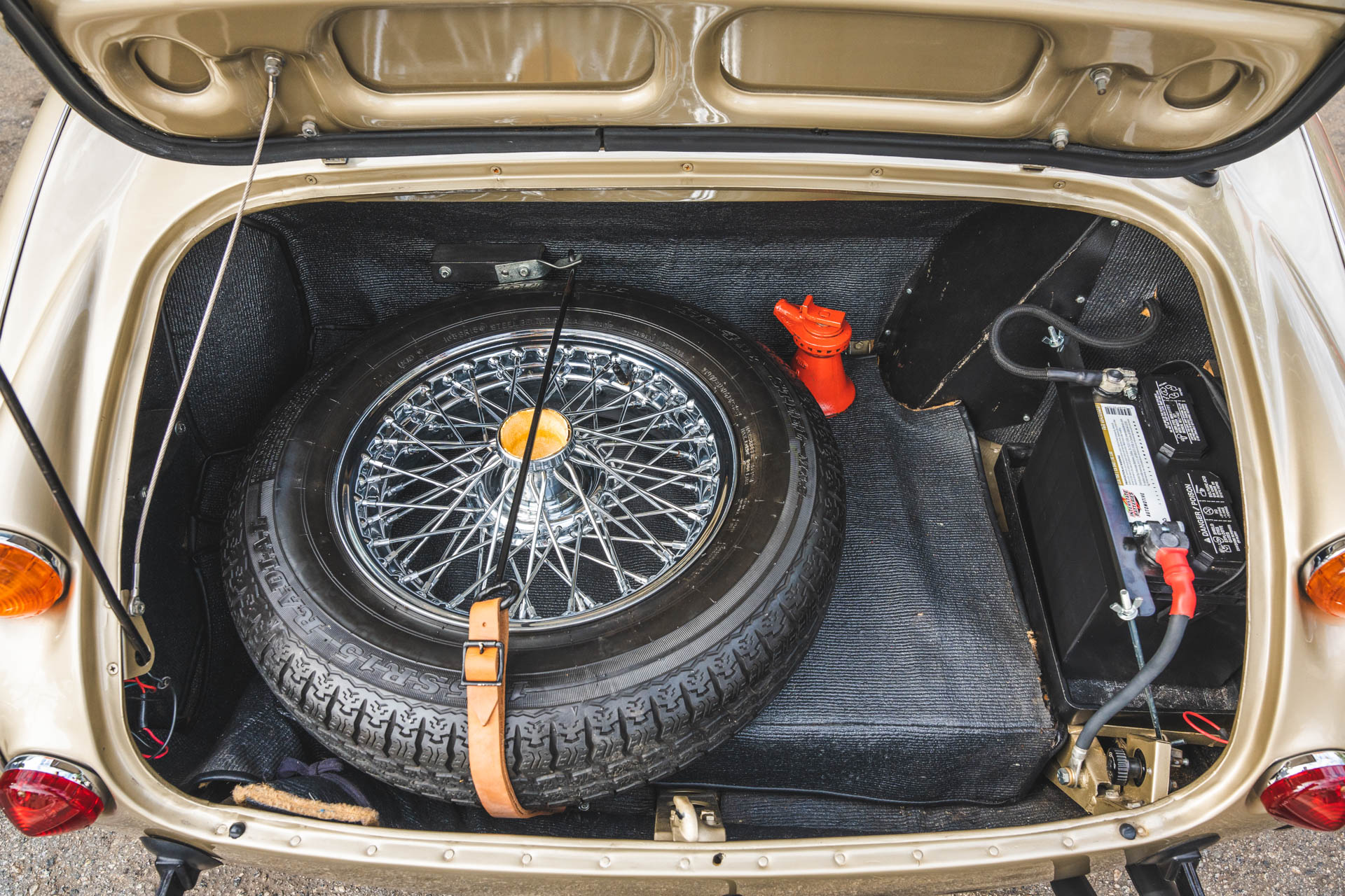 The 15? knock-off wire wheels are mounted with 165R15 Goodyear Corsa GT tires. Braking is handled by front discs and rear drums.