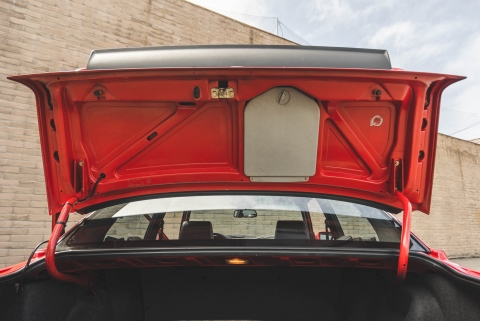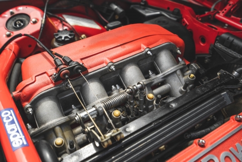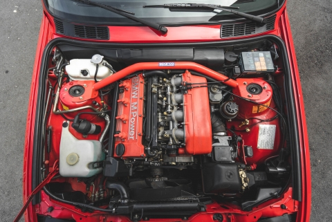 The 2.3-liter S14 inline-four features red-finished valve covers and was factory rated at 192 horsepower and 170 lb-ft of torque. A Sparco strut-tower brace has been installed along with Evo II-specification ignition wires.