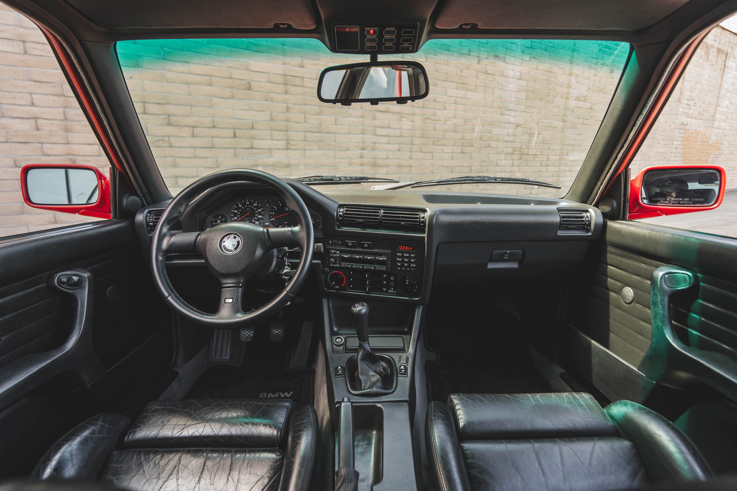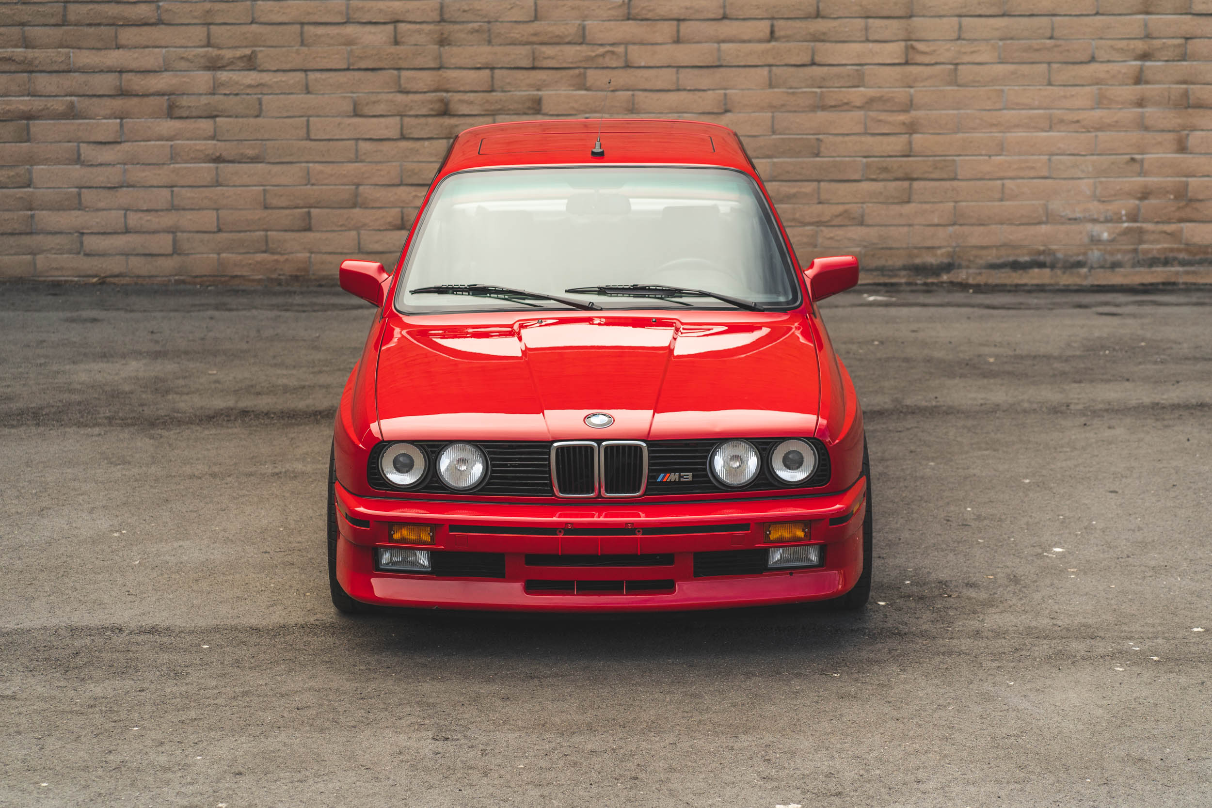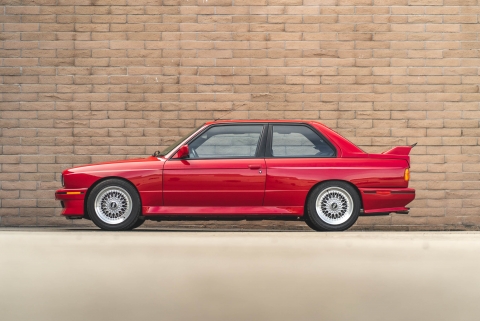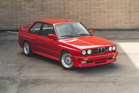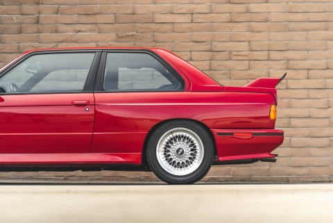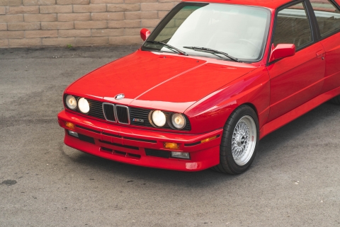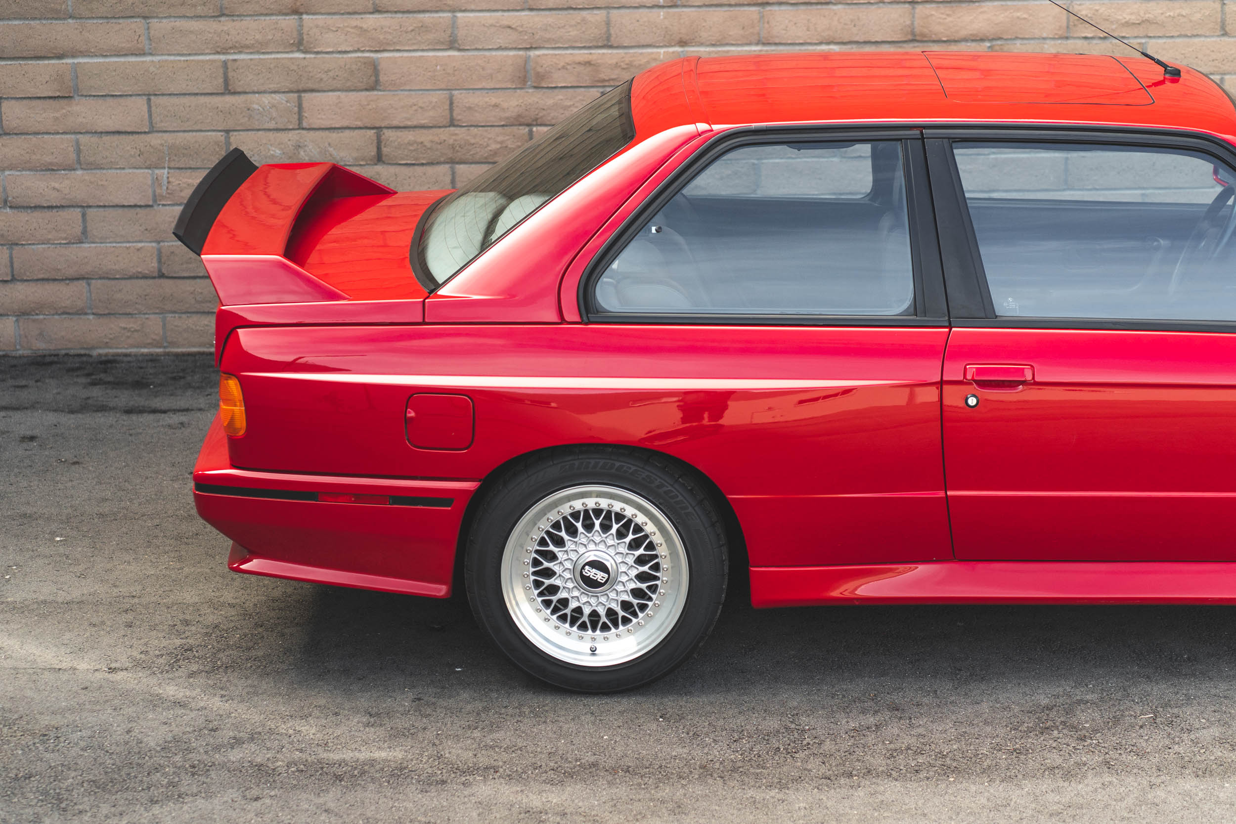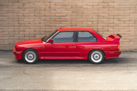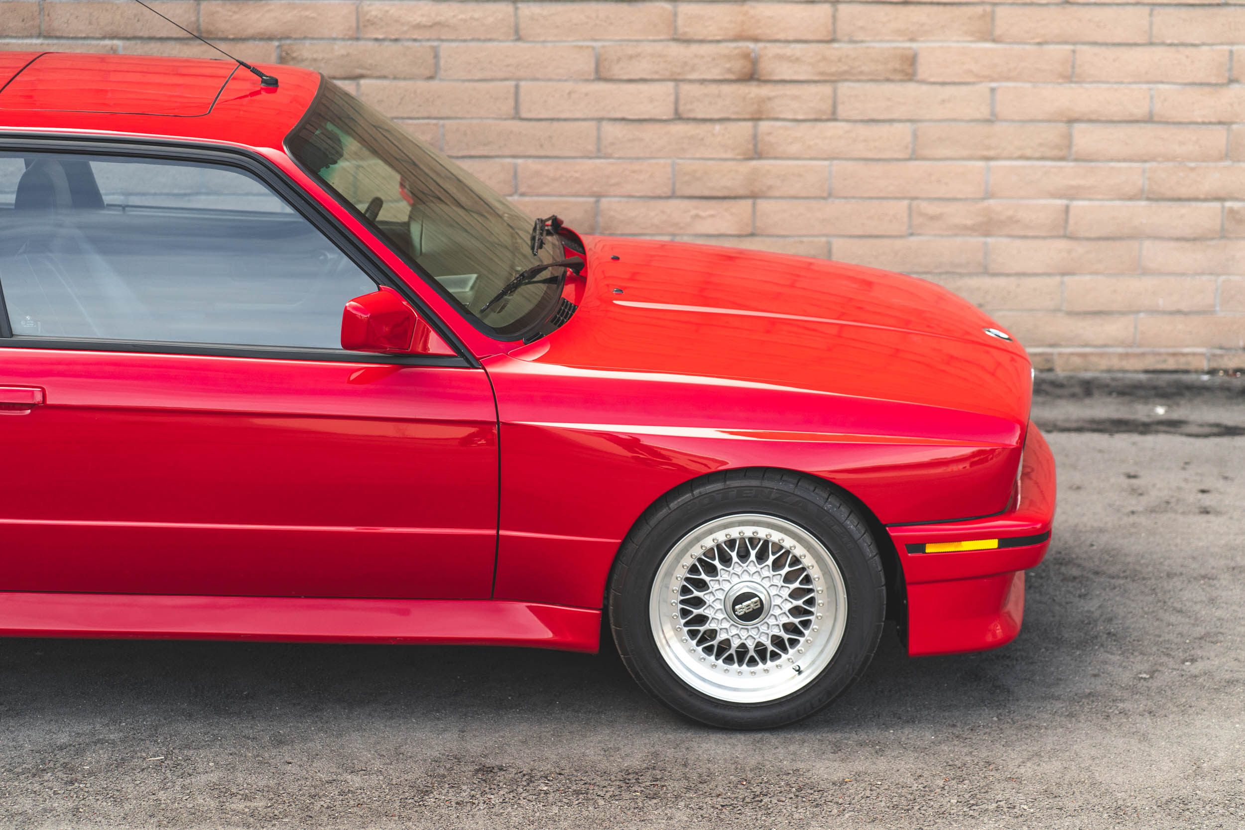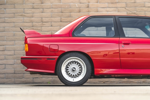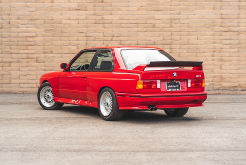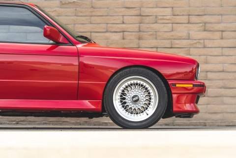 This 1988 BMW M3 is powered by a 2.3-liter S14 inline-four paired with a five-speed manual transmission and a limited-slip differential, and it is finished in Cinnabar Red over black leather. Equipment includes 16? BBS basketweave wheels, a strut-tower brace, a sunroof, an extended rear spoiler, fog lights, front sport seats, a CD stereo, air conditioning, and an onboard computer. The car was first registered in Oklahoma, and it also spent time in Georgia and Minnesota prior to its acquisition in August 2014 by the seller, who relocated it to California. This E30 M3 shows 198k miles and is now offered on dealer consignment with literature and a California title.