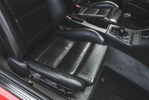 The cabin features manually adjustable front sport seats upholstered in black leather along with a matching dashboard and gray carpets. Amenities include an onboard computer, a CD stereo with an M-logo badge, air conditioning, cruise control, and power windows, mirrors, and locks. The driver’s seat shows signs of wear.