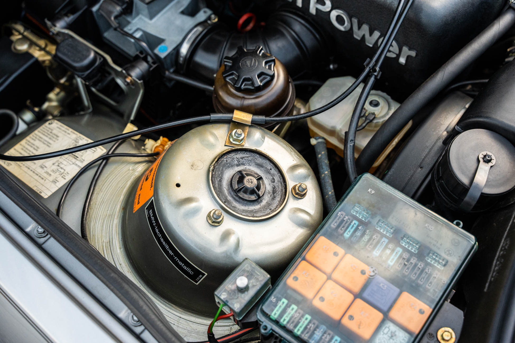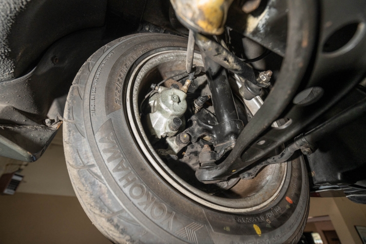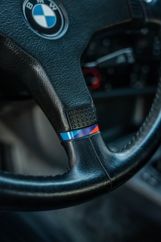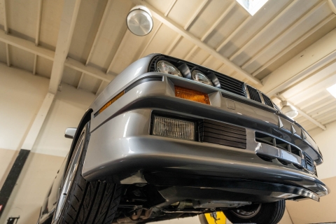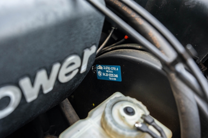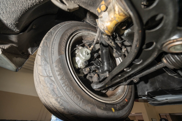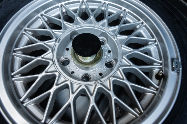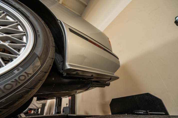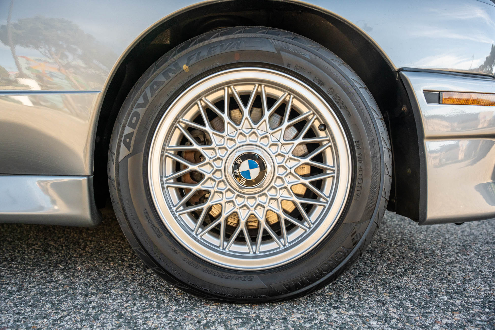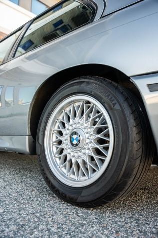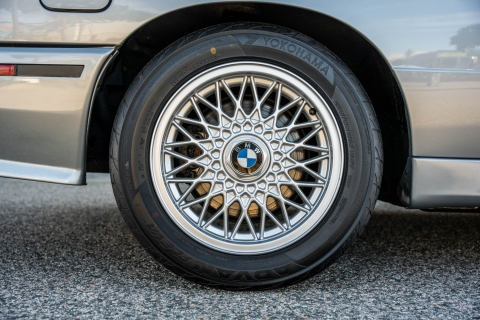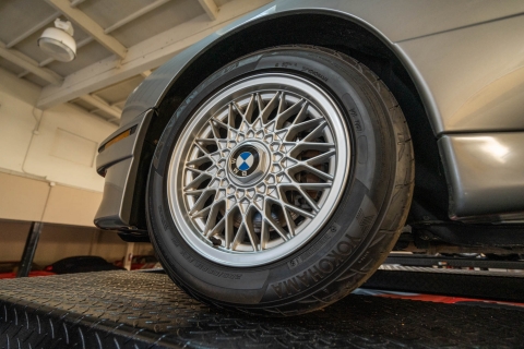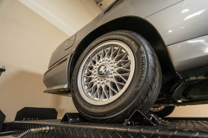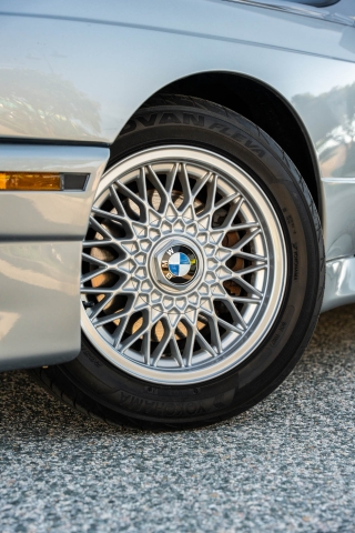 The 15? basketweave wheels feature BMW center caps and are wrapped in 205/55 Yokohama Advantage Fleva tires. A Turner Motorsports front subframe reinforcement kit was installed in April 2021, and the MacPherson strut/semi-trailing arm suspension was revised for the M3 with a thicker rear anti-roll bar as well as shorter and stiffer springs. The brake fluid was flushed in June 2024.