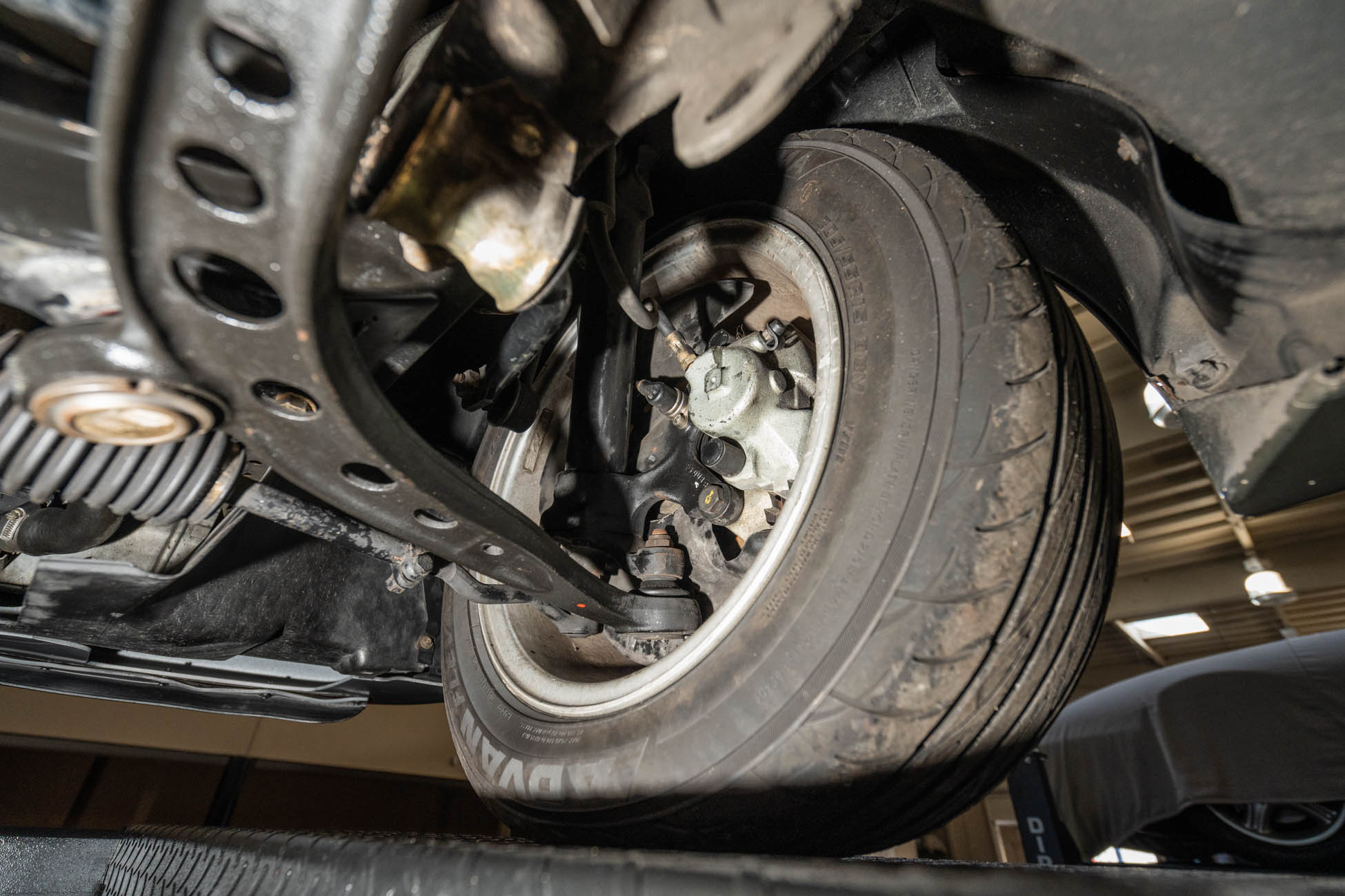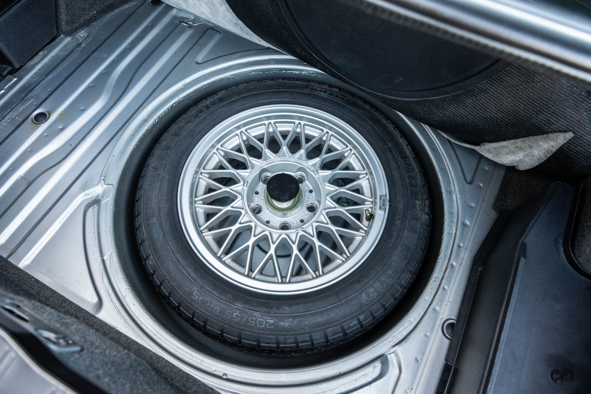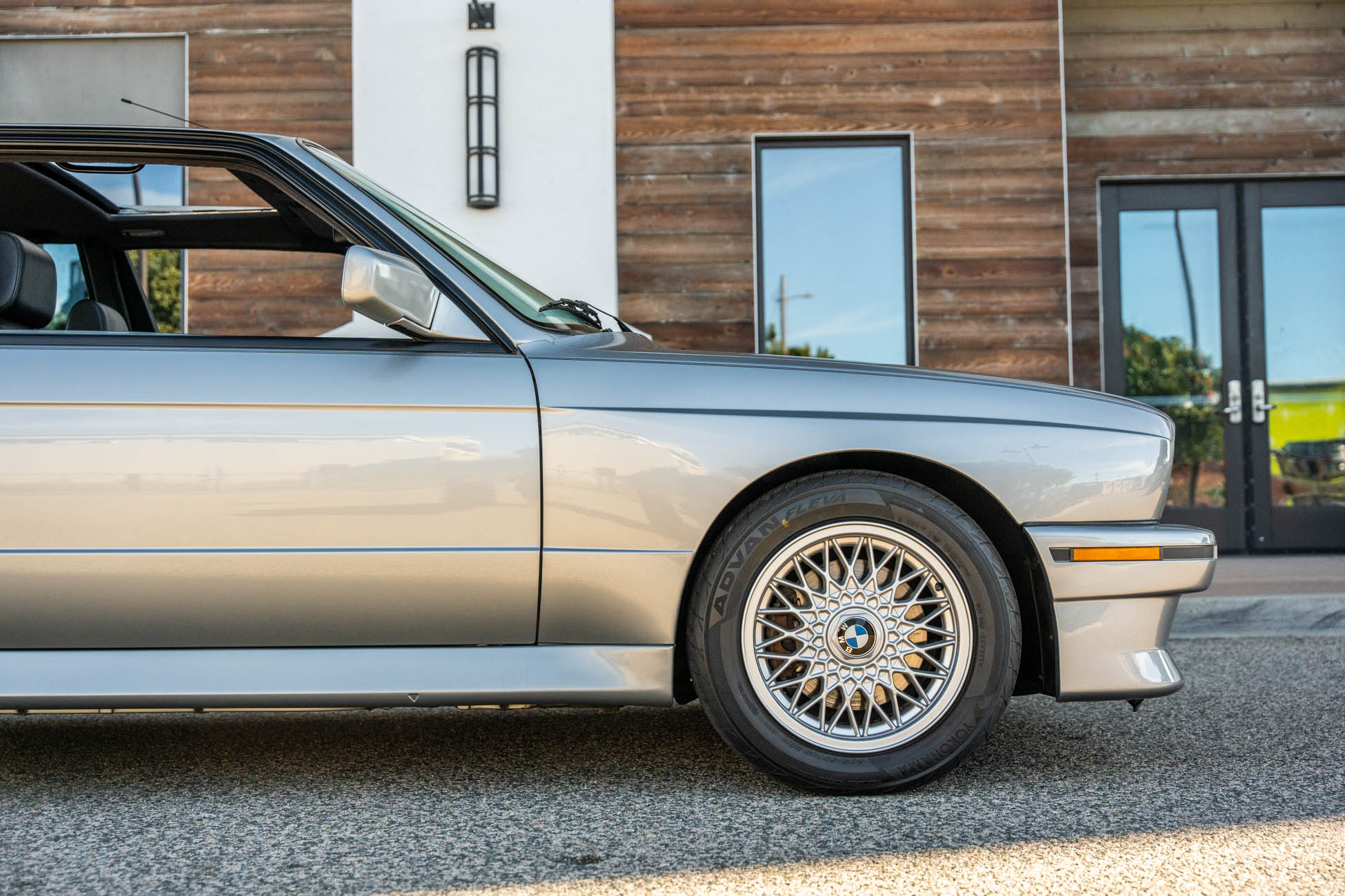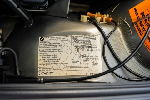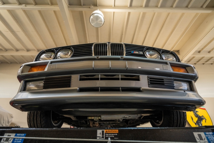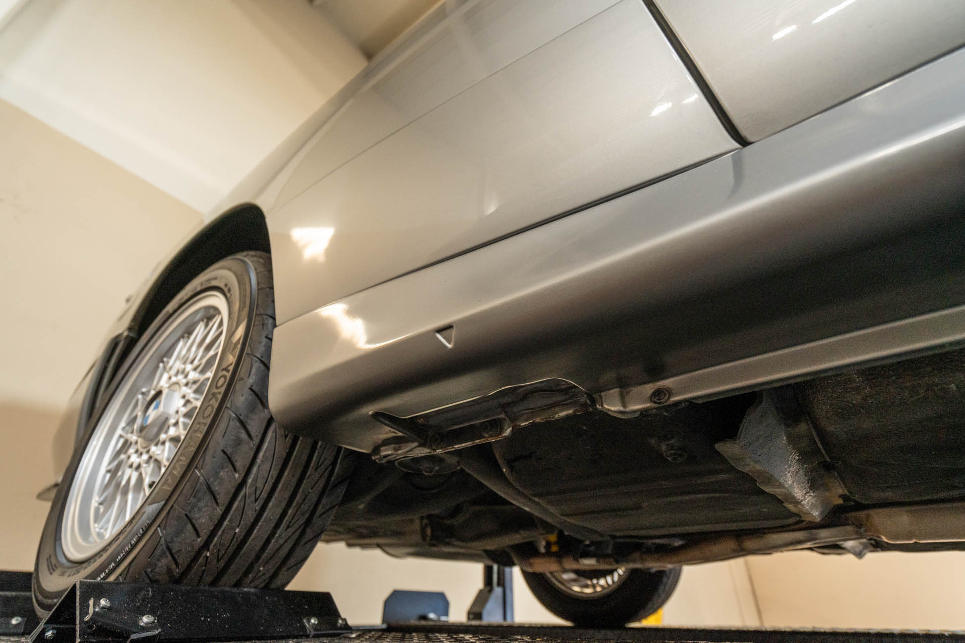 The 15? basketweave wheels feature BMW center caps and are wrapped in 205/55 Yokohama Advantage Fleva tires. A Turner Motorsports front subframe reinforcement kit was installed in April 2021, and the MacPherson strut/semi-trailing arm suspension was revised for the M3 with a thicker rear anti-roll bar as well as shorter and stiffer springs. The brake fluid was flushed in June 2024.