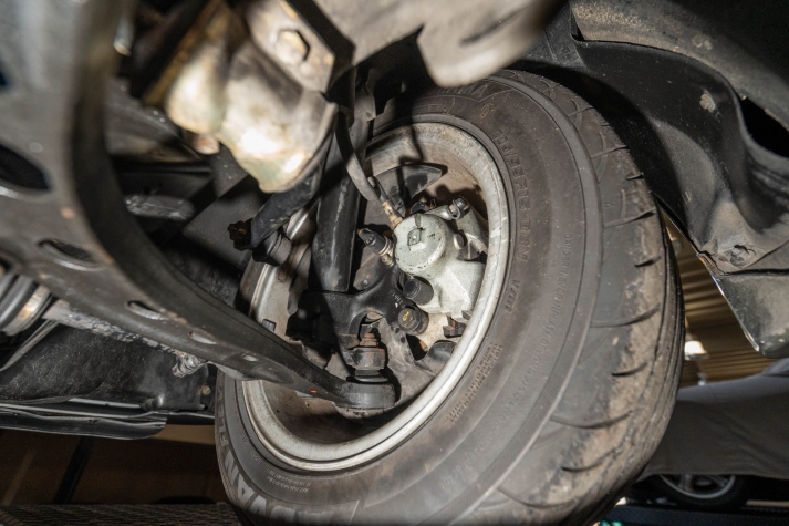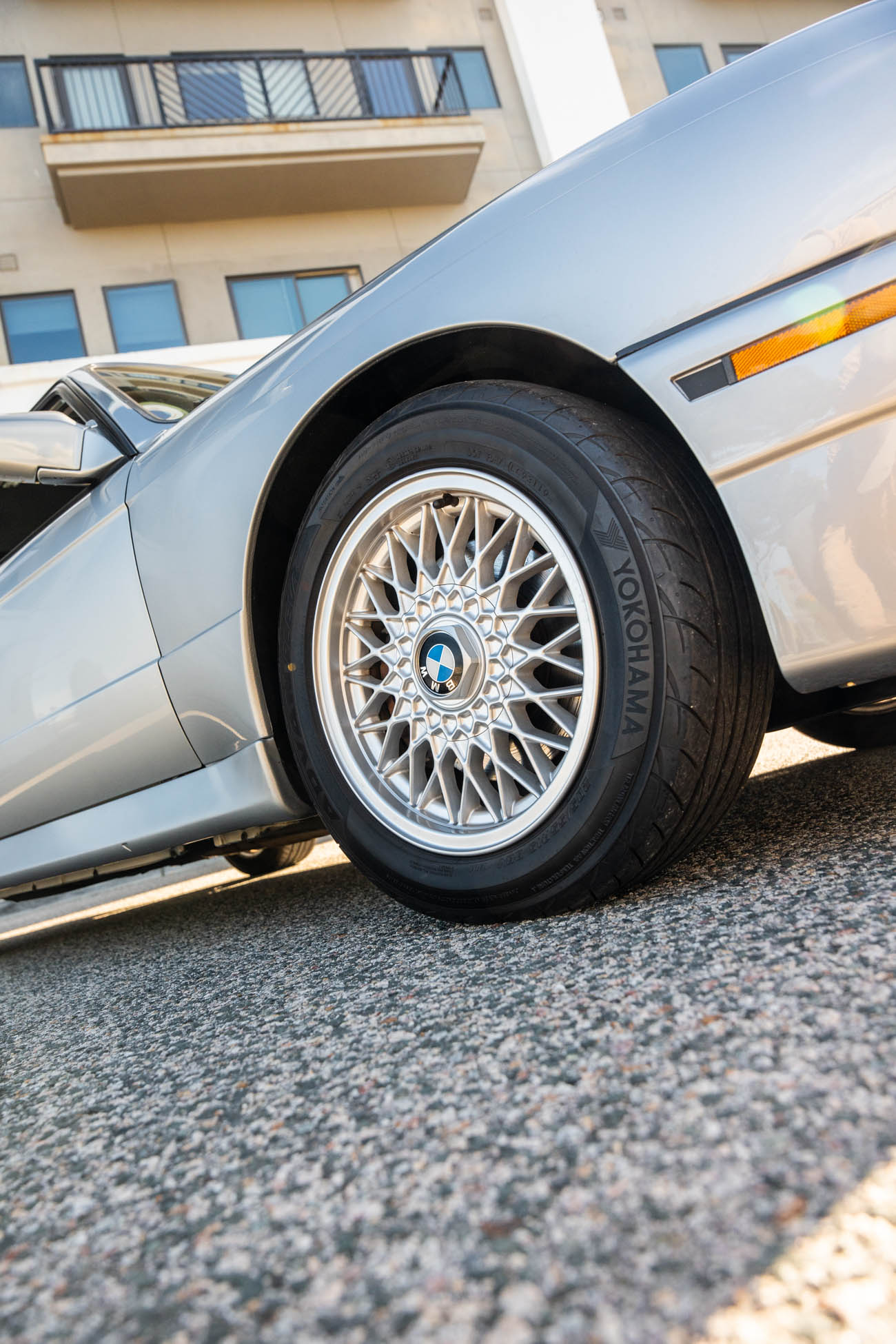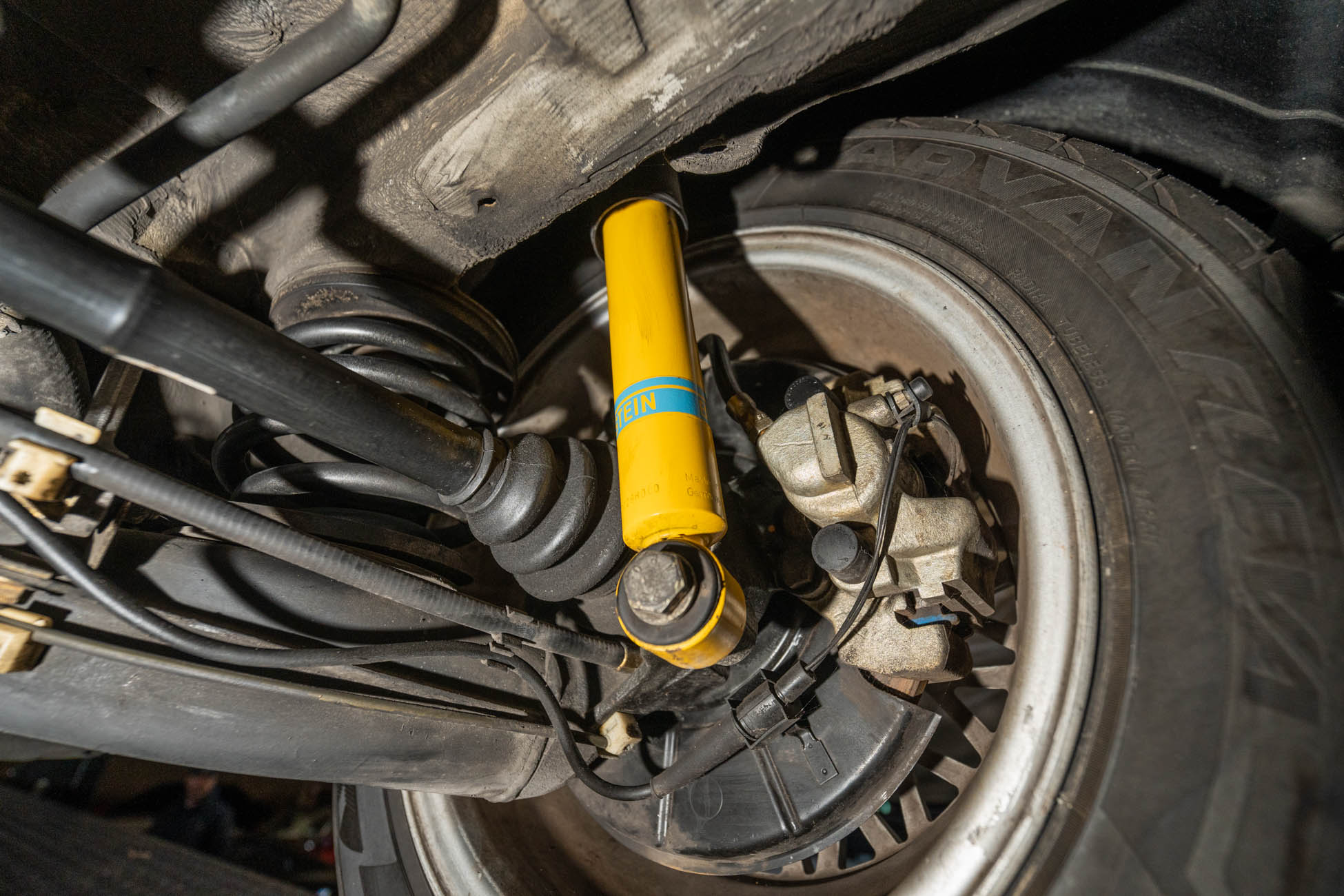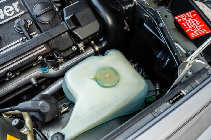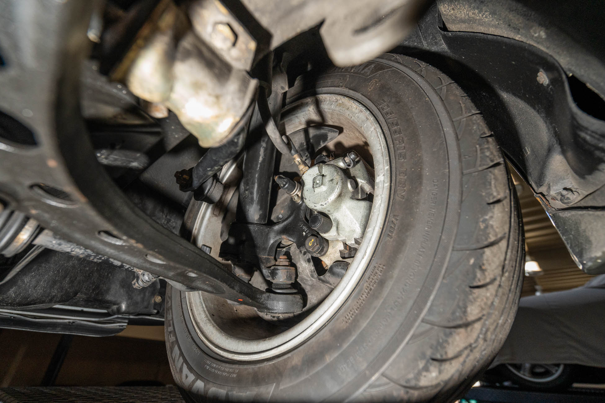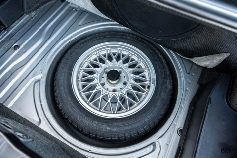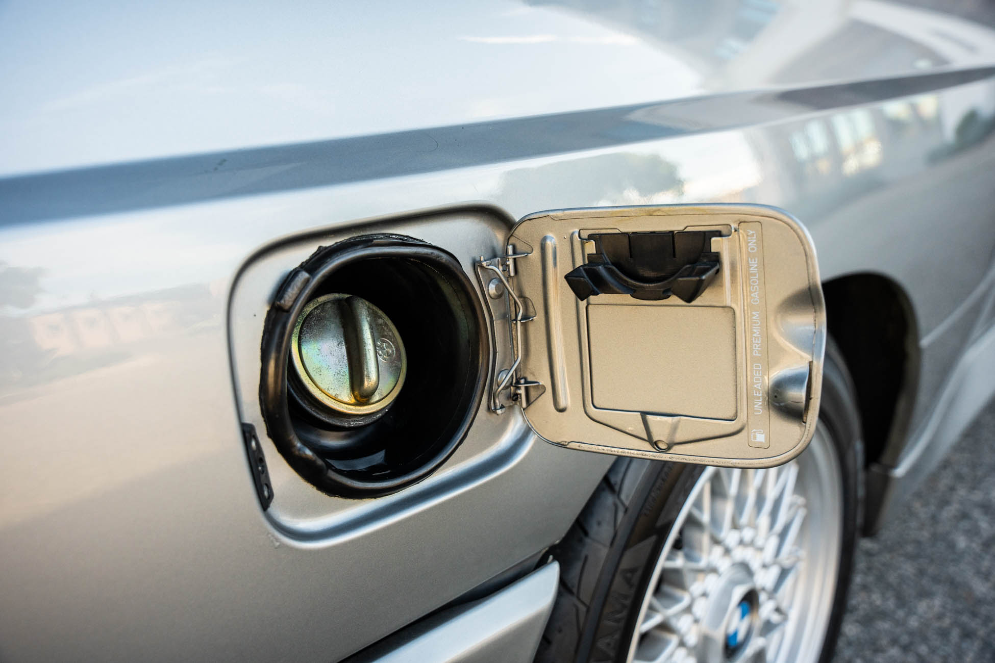The 15? basketweave wheels feature BMW center caps and are wrapped in 205/55 Yokohama Advantage Fleva tires. A Turner Motorsports front subframe reinforcement kit was installed in April 2021, and the MacPherson strut/semi-trailing arm suspension was revised for the M3 with a thicker rear anti-roll bar as well as shorter and stiffer springs. The brake fluid was flushed in June 2024.