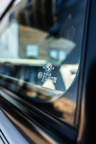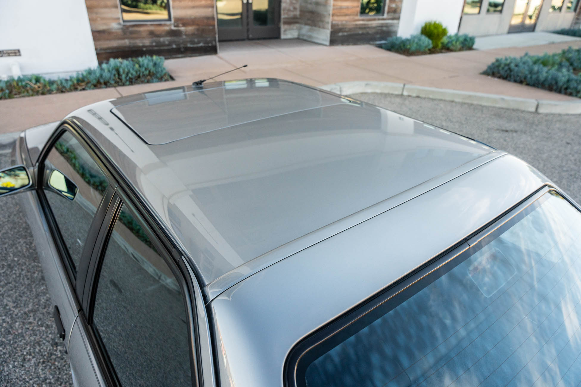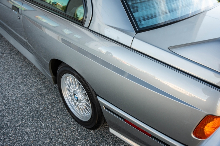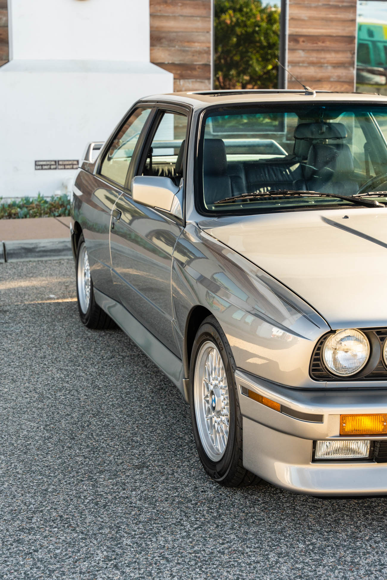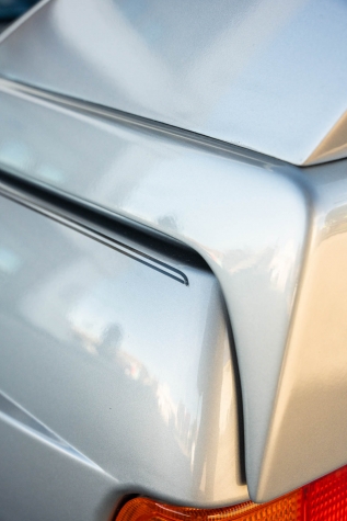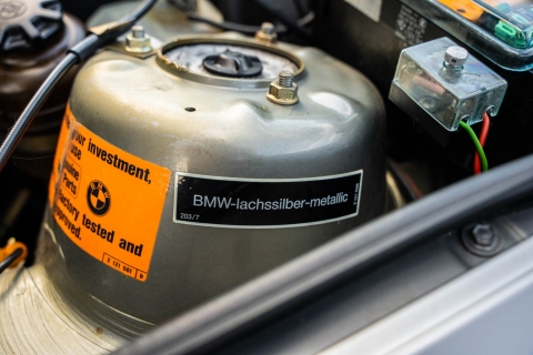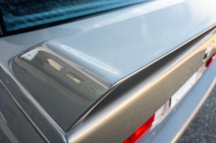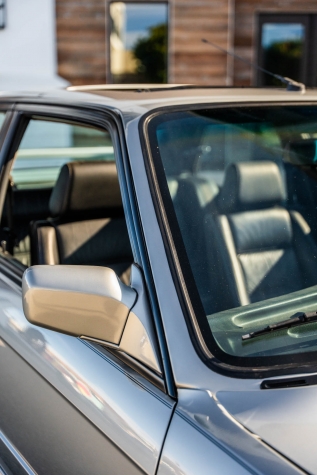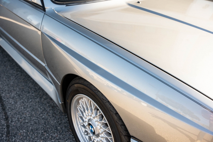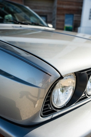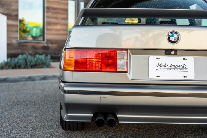 The car is finished in Salmon Silver Metallic (203) and features a replacement electric sunroof that was fitted in April 2021. Further details include a rear spoiler, fog lights, painted mirror caps, twin exhaust outlets, and wider fenders compared to the standard E30. Photos of paint meter readings are viewable in the gallery below.