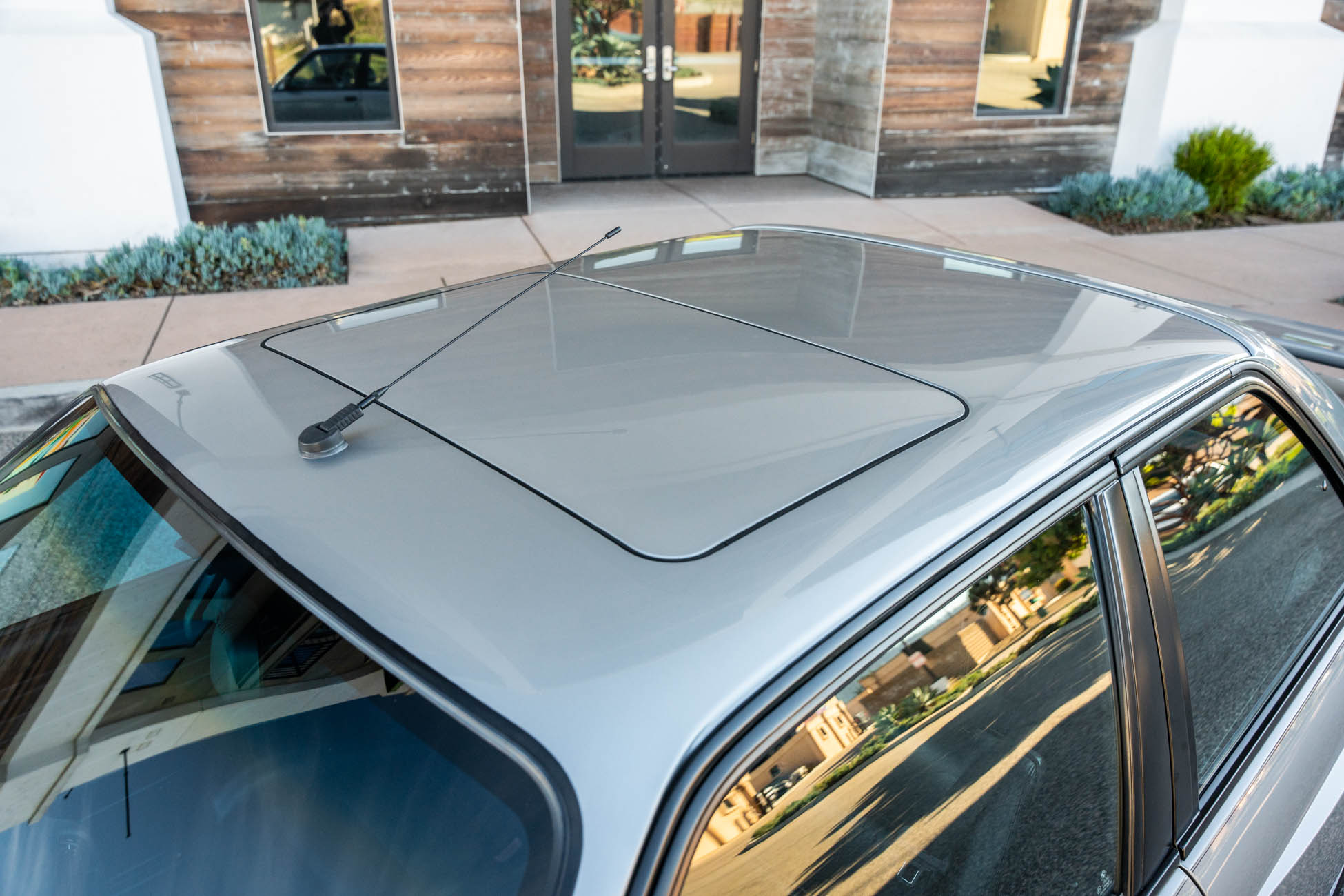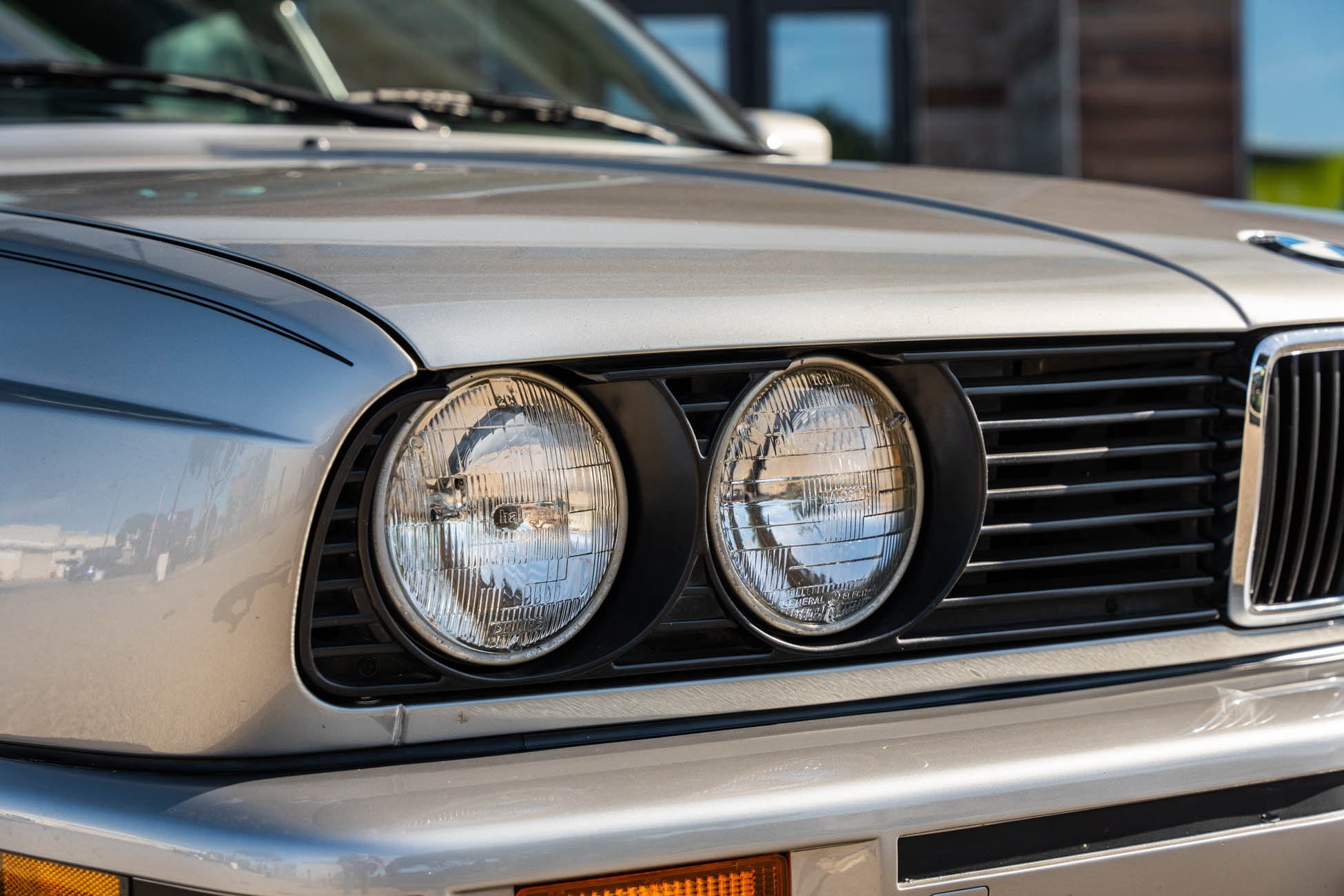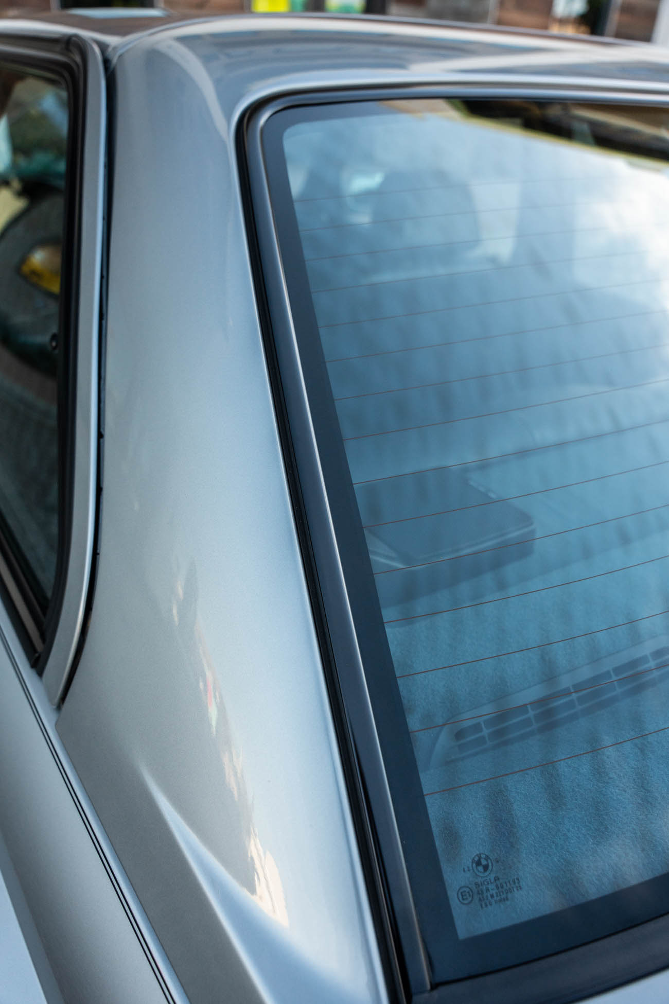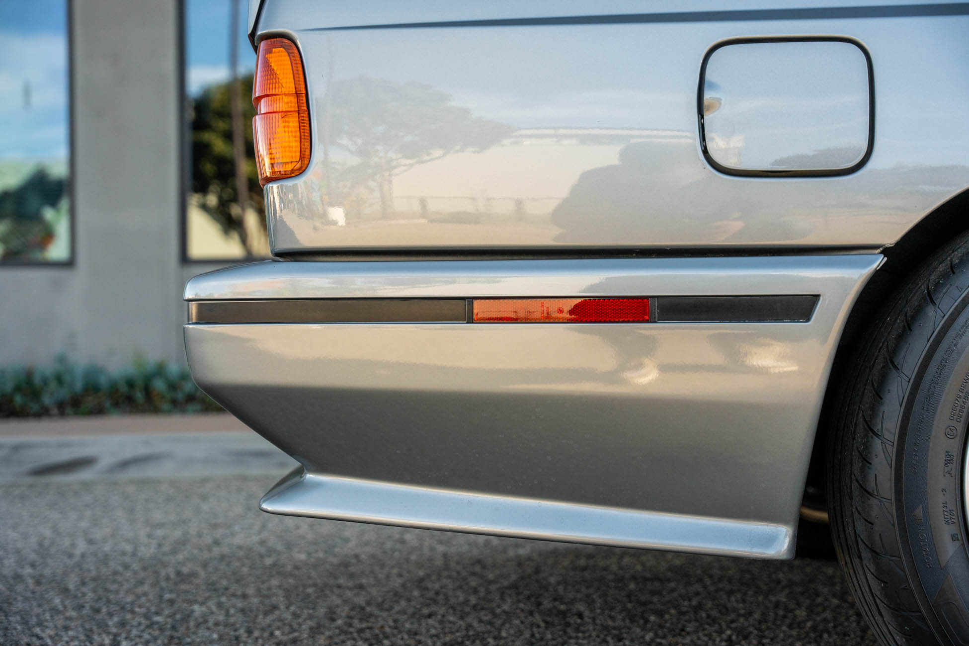 The car is finished in Salmon Silver Metallic (203) and features a replacement electric sunroof that was fitted in April 2021. Further details include a rear spoiler, fog lights, painted mirror caps, twin exhaust outlets, and wider fenders compared to the standard E30. Photos of paint meter readings are viewable in the gallery below.