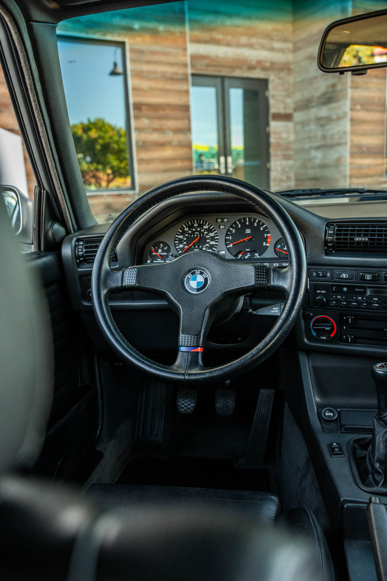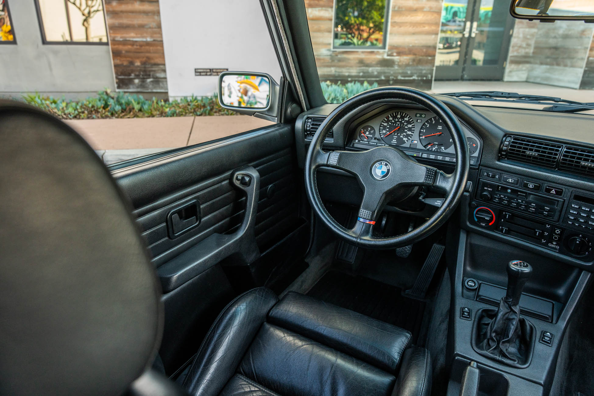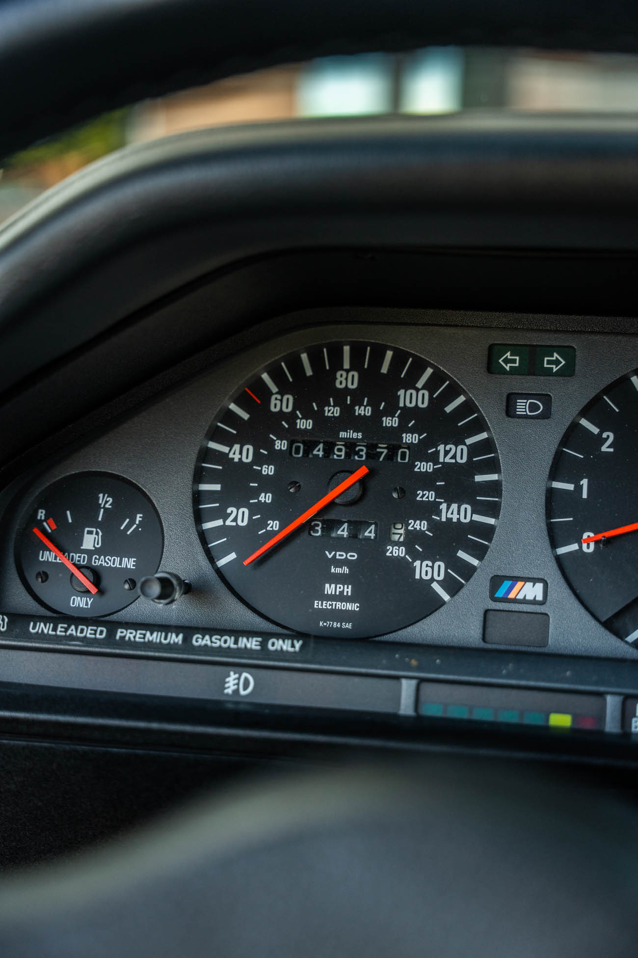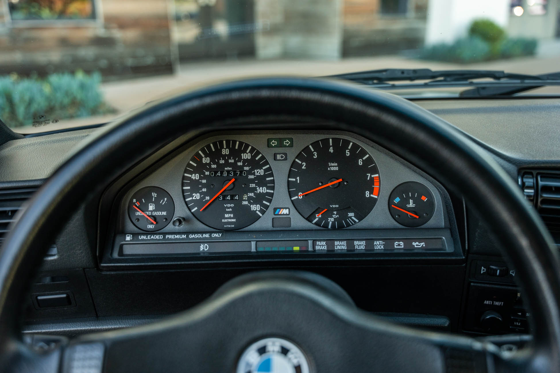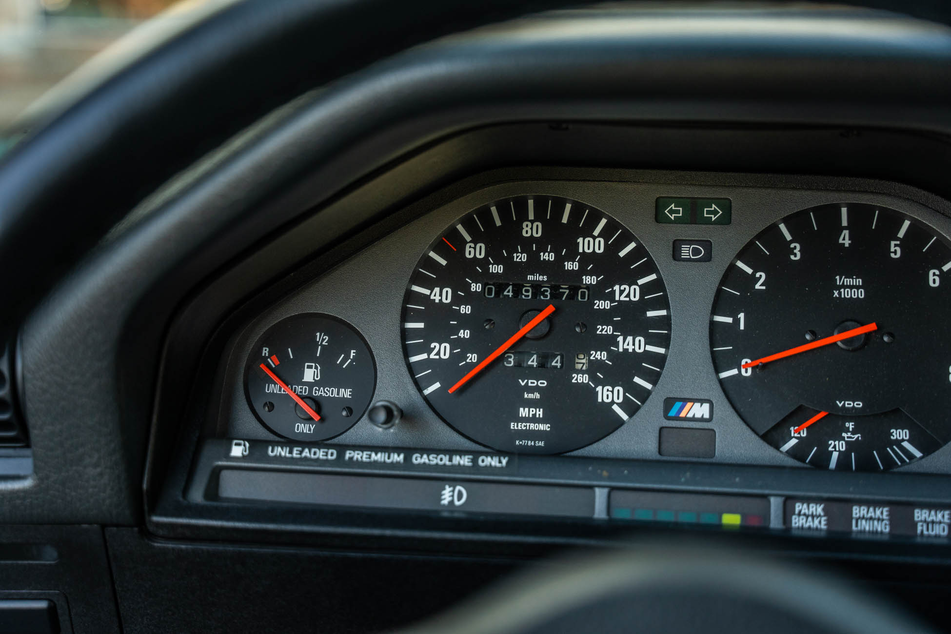 The three-spoke M-Tech I steering wheel fronts VDO instrumentation including a 160-mph speedometer and an 8k-rpm tachometer alongside gauges for oil temperature, coolant temperature, and fuel level. The six-digit odometer shows 49k miles, approximately 500 of which have been added under current ownership.