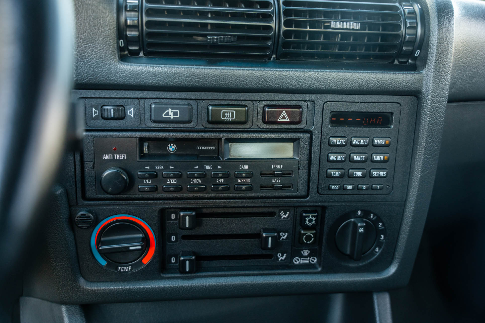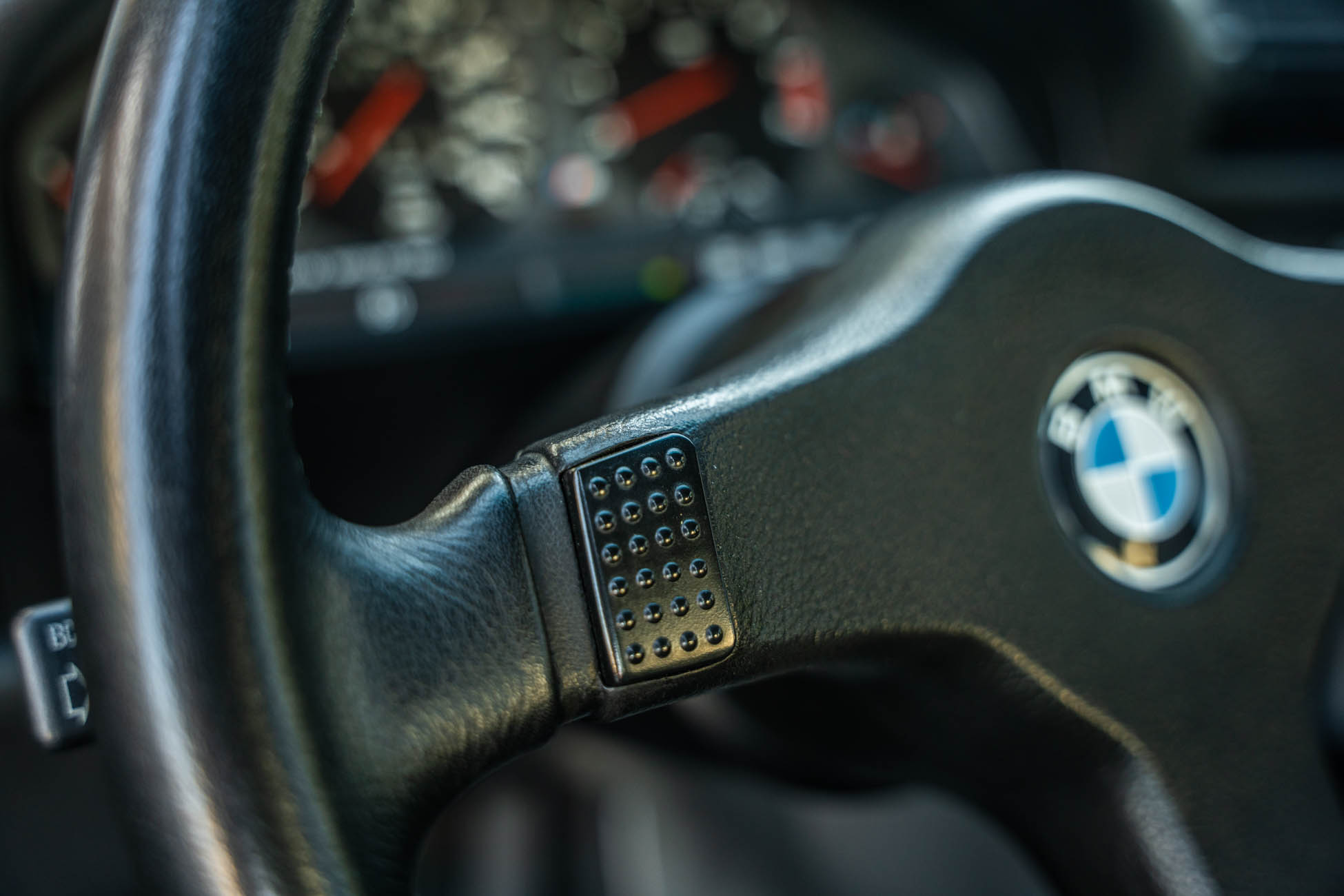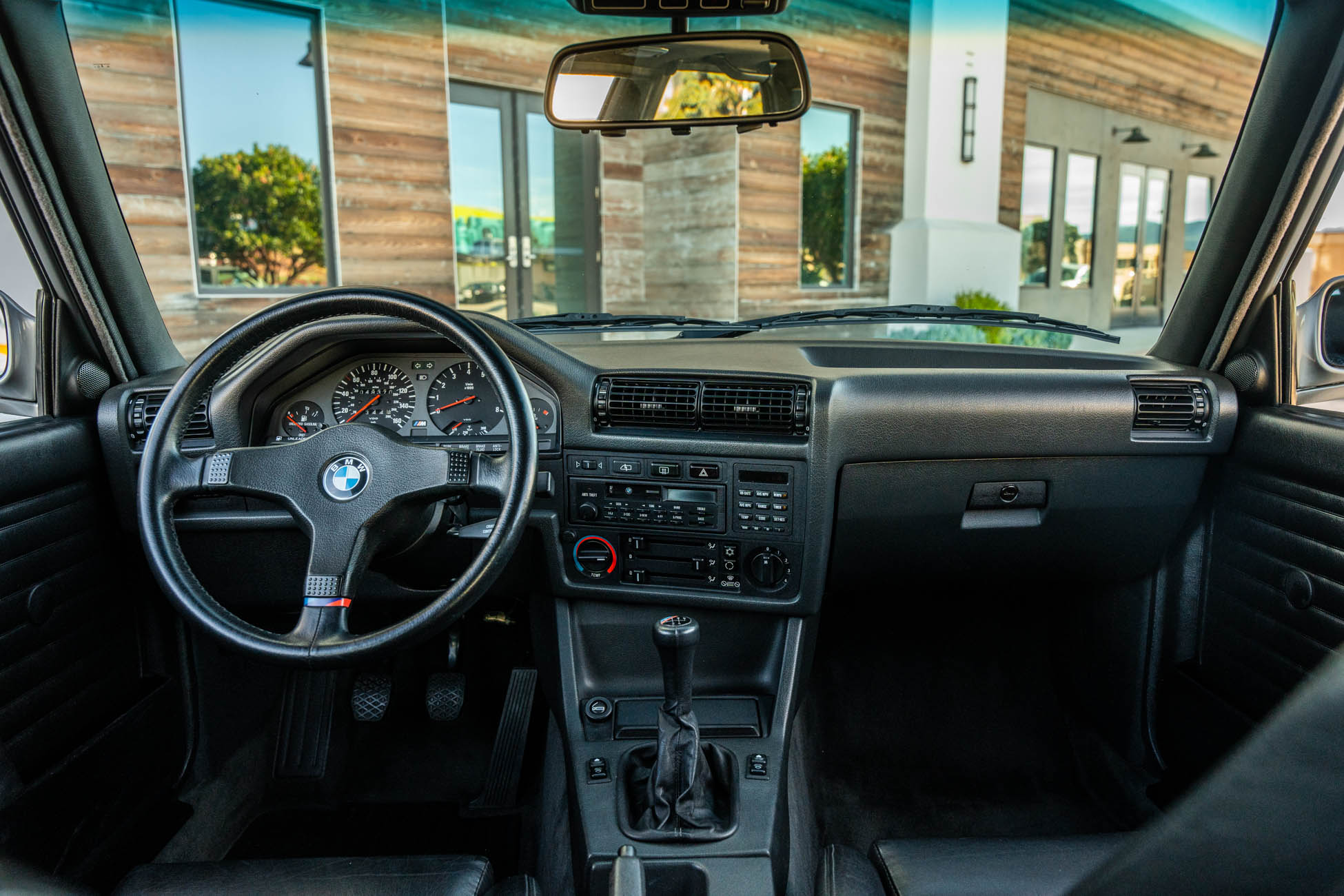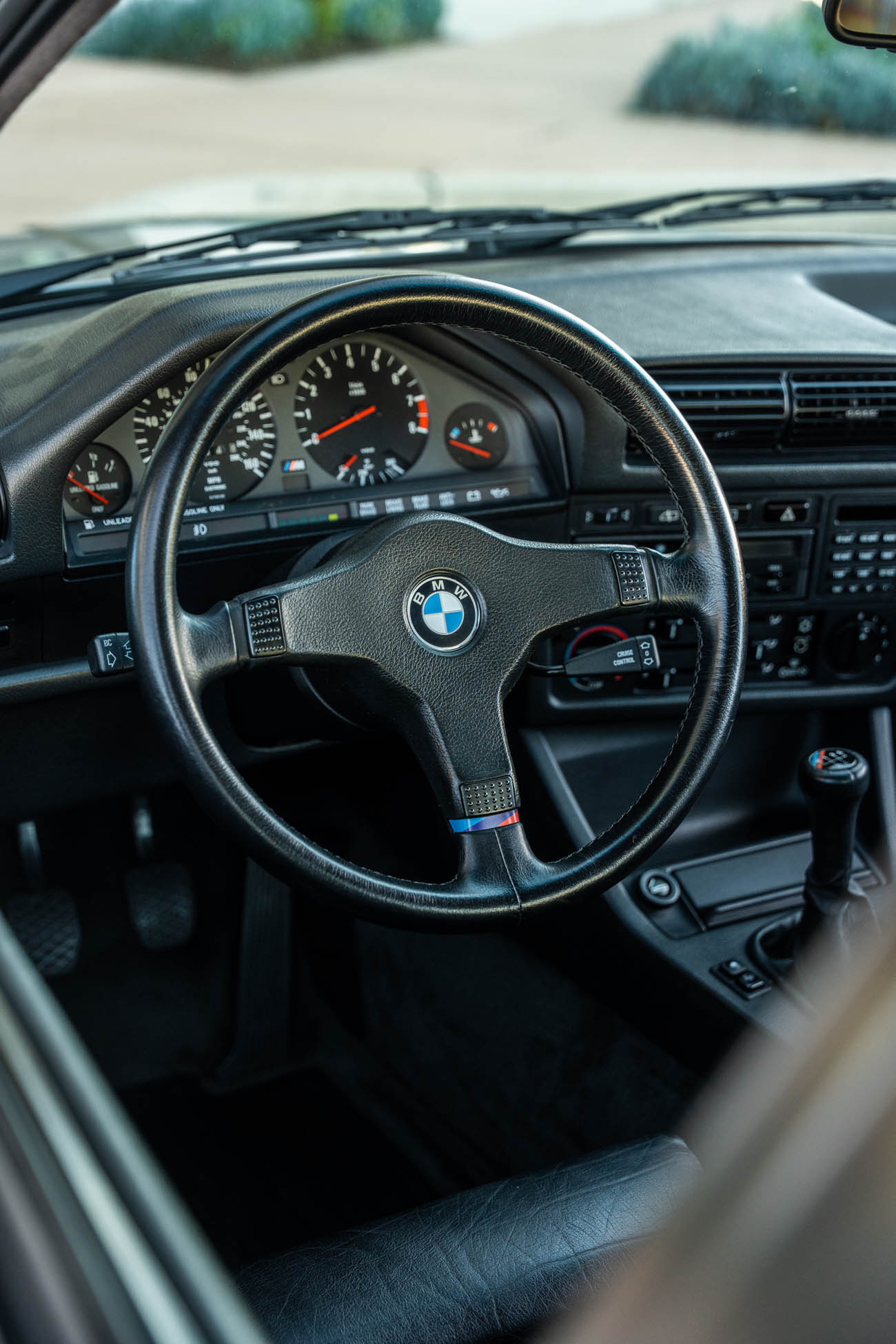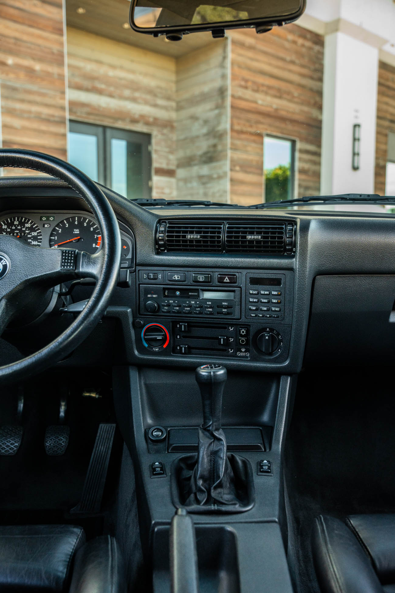 The three-spoke M-Tech I steering wheel fronts VDO instrumentation including a 160-mph speedometer and an 8k-rpm tachometer alongside gauges for oil temperature, coolant temperature, and fuel level. The six-digit odometer shows 49k miles, approximately 500 of which have been added under current ownership.