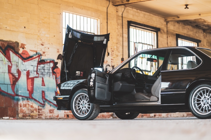 The car was reportedly refinished in its factory black color during previous ownership. Equipment includes front fog lights, an air dam, body-color bumper corner trim, ellipsoid headlights, a sliding steel sunroof, a rear spoiler, and M6 badging.Silver 17? Style 32 wheels are mounted with Toyo Proxes T1R tires measuring 235/45 in front and 265/40 out back, and a spare metric wheel with a TRX tire is stored in the trunk. Braking power is provided by cross-drilled rotors at all four corners.