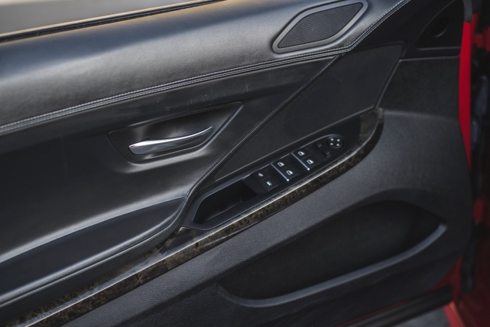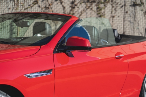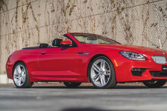 This 2014 BMW 650i convertible is finished in Imola Red II over black Nappa leather and features the M Sport Package, which added M Aerodynamic Bodywork, high-gloss Shadowline trim, and black-finished exhaust outlets. Power is from a twin-turbocharged 4.4-liter V8 paired with a paddle-shifted eight-speed automatic transmission, and other equipment includes a black convertible top, adaptive LED headlights, 20? M double-spoke wheels, Dynamic Damper Control, dual-zone automatic climate control, heated and ventilated front seats, a Hi-Fi audio system, a head-up display, Surround View, and a navigation system. The car has been registered in California since new, and it was acquired by the current owner in October 2019. This F12 6-Series convertible has 44k miles and is offered on dealer consignment with factory literature, a tool kit, a clean Carfax report, and a clean California title.