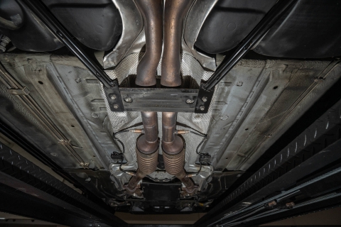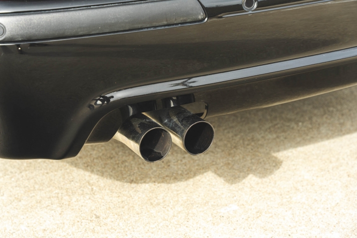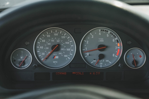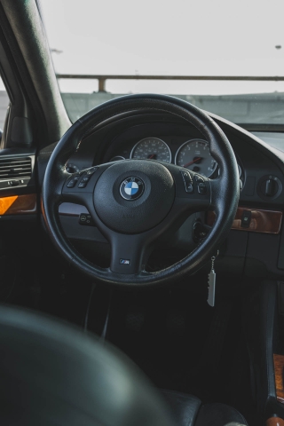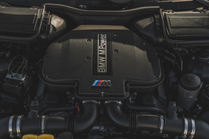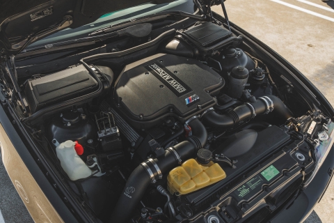 The 4.9-liter S62 V8 is equipped with individual throttle bodies and double-VANOS continuously variable valve timing for a factory-rated output of 394 horsepower and 369 lb-ft of torque. It was modified with a Dinan air intake system under previous ownership. Work in June 2023 is said to have consisted of repairing the VANOS system in addition to replacing the valve cover gaskets. The car passed a California emissions inspection in November 2023.