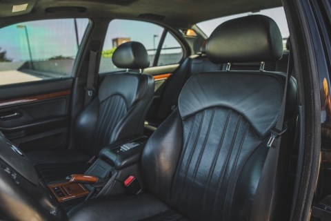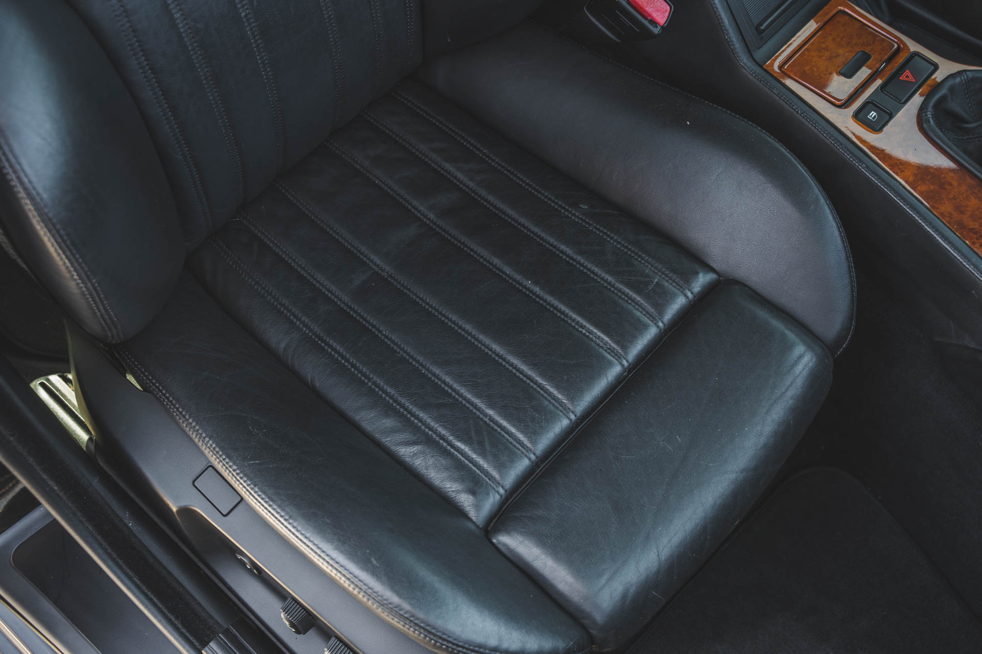 The cabin features black Nappa leather covering the heated power-adjustable front sport seats, door panel inserts, center console, and dashboard, while wood trim accents the upper dashboard, center console, and upper doors. Amenities include dual-zone automatic climate control, driver-seat position memory settings, cruise control, and navigation. The trunk lid struts were replaced in February 2024, and a BlueBus Bluetooth module has been added per the selling dealer. The wiring for the car phone has been wrapped, and a phone tray will accompany the car.
