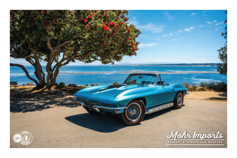 This 1967 Chevrolet Corvette convertible was delivered new to Connell Chevrolet of Costa Mesa, California and was registered in the state until moving to Michigan in 2005. It underwent a body-off refurbishment in the late 2000s and subsequently received an NCRS Second Flight award. The car is powered by a 427ci L36 V8 paired with a four-speed manual transmission and is finished in Marina Blue over black vinyl upholstery. Equipment includes a removable hardtop, a black soft top, 15? turbine-style wheels, four-wheel disc brakes, side exhaust pipes, power steering, an AM/FM radio, and retractable headlights. This C2 was acquired by the current owner in 2015 and is now offered on dealer consignment as part of the Mohr Imports Car Week Collection: Postcards from Monterey with a clean Montana title.