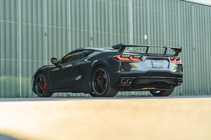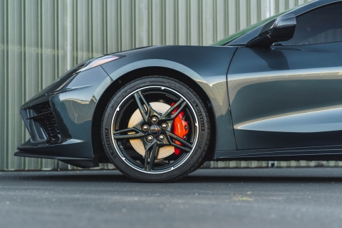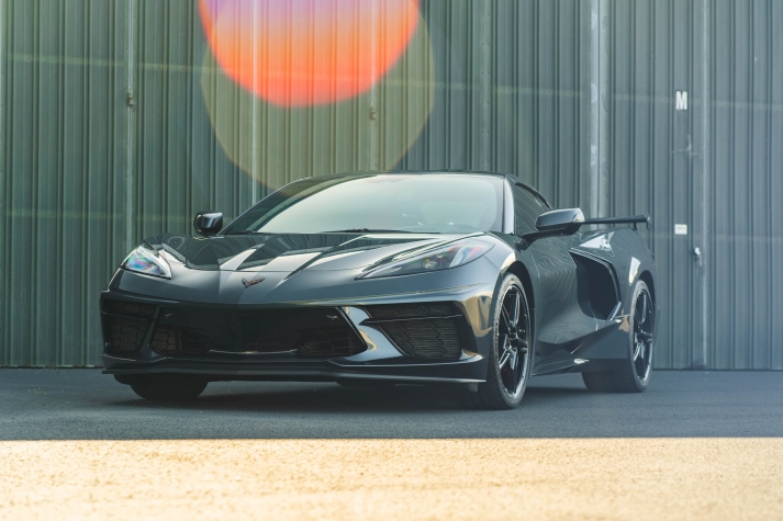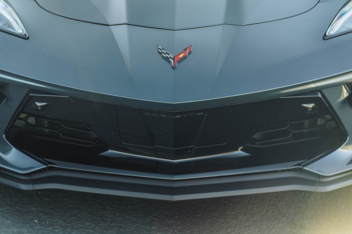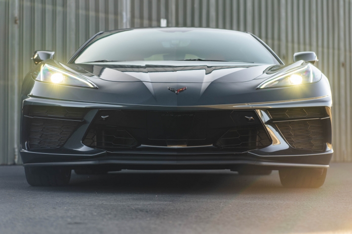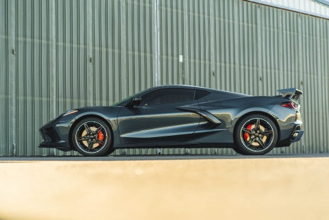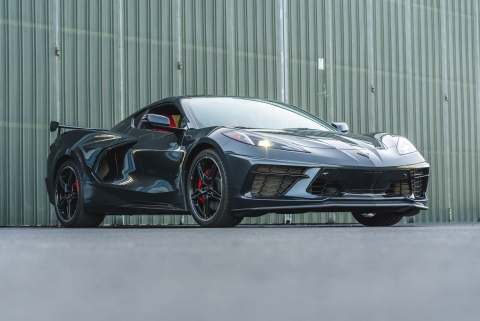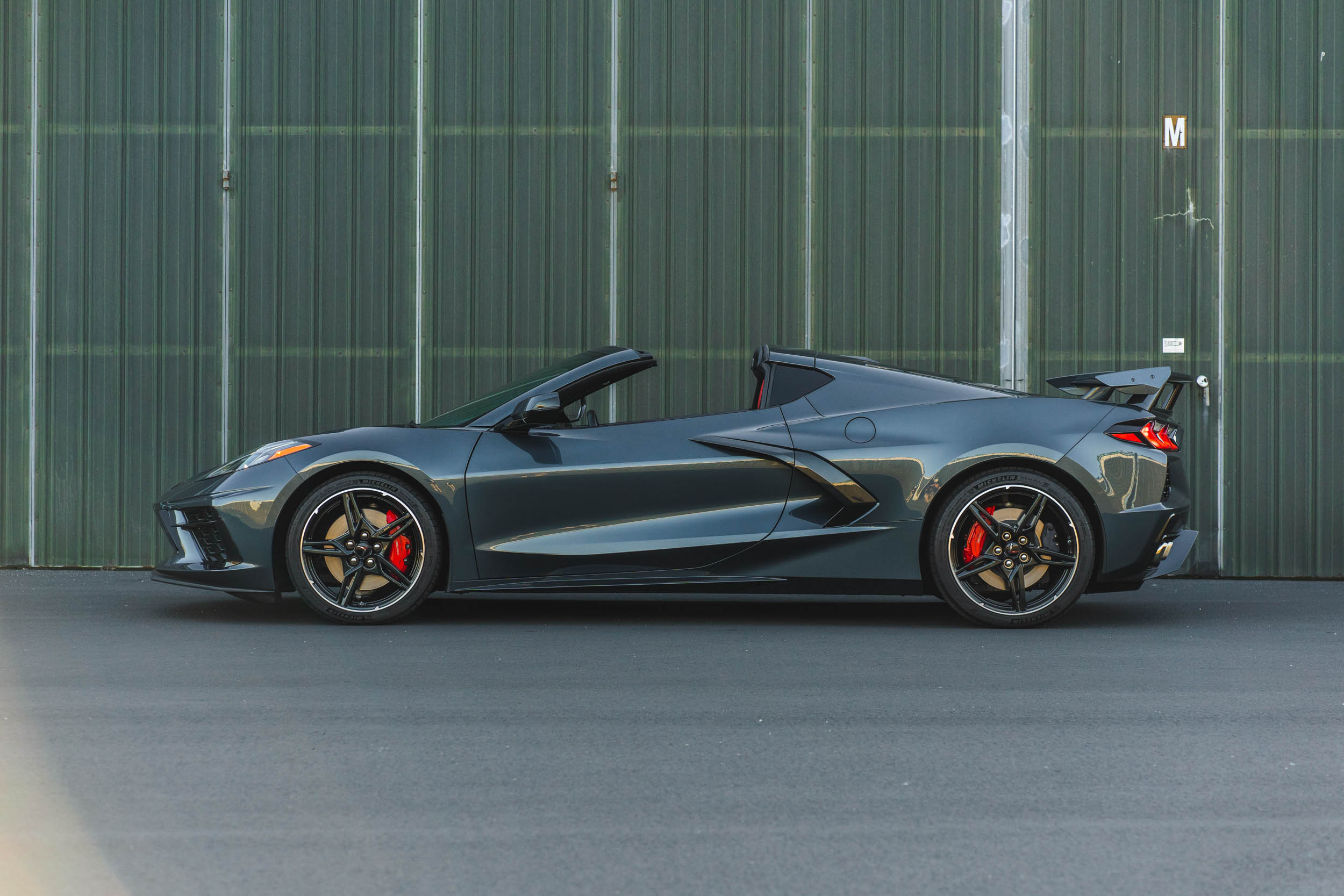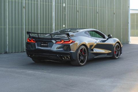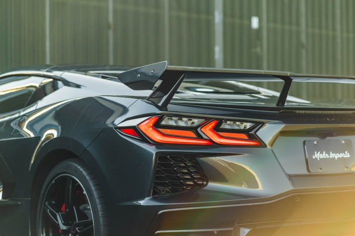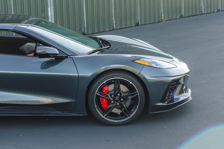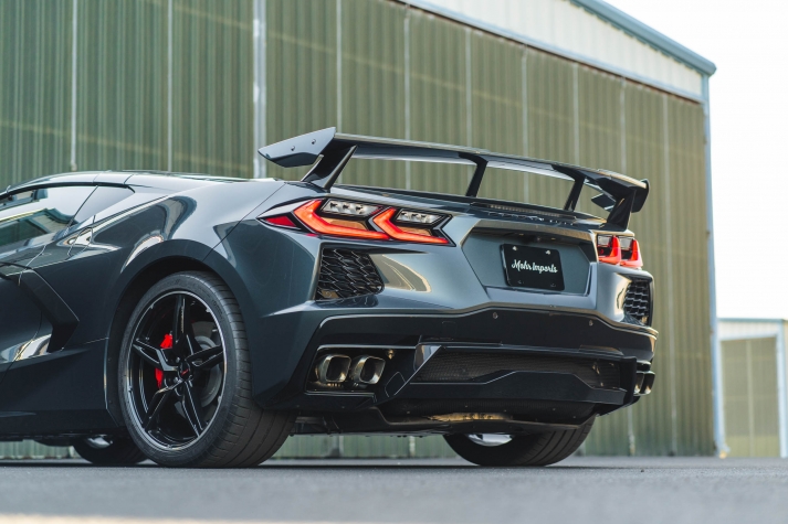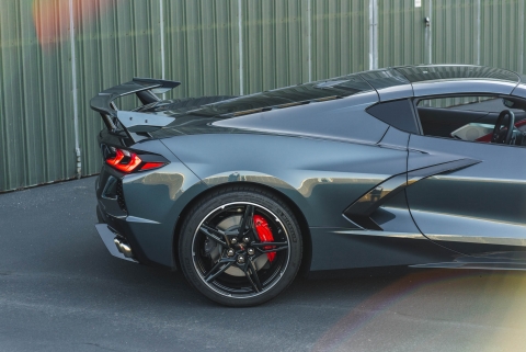 The 2020 model year marked the debut of the eighth-generation Corvette, and this example is finished in Shadow Gray Metallic with a factory-ordered and dealer-installed high wing. Additional exterior details include LED headlights, front and rear cameras, and a removable roof panel with visible carbon fiber.
