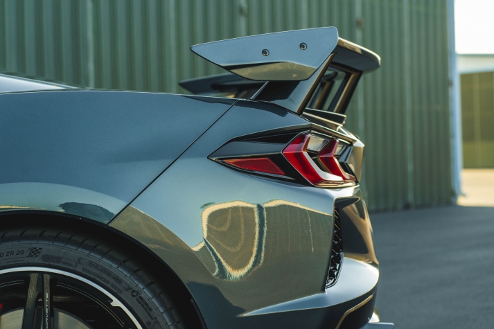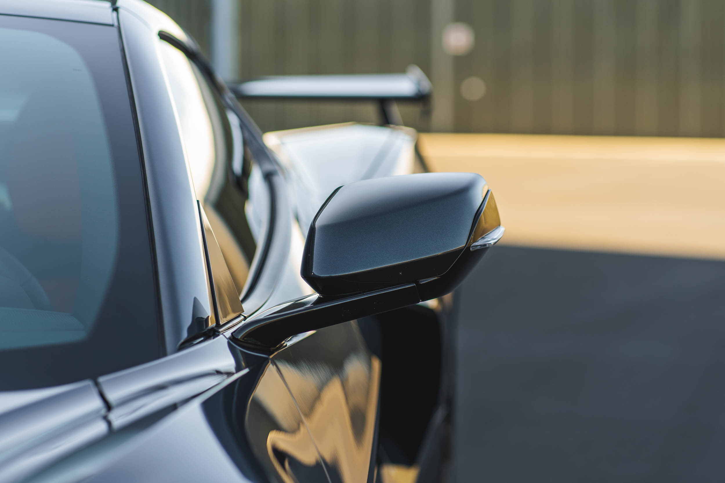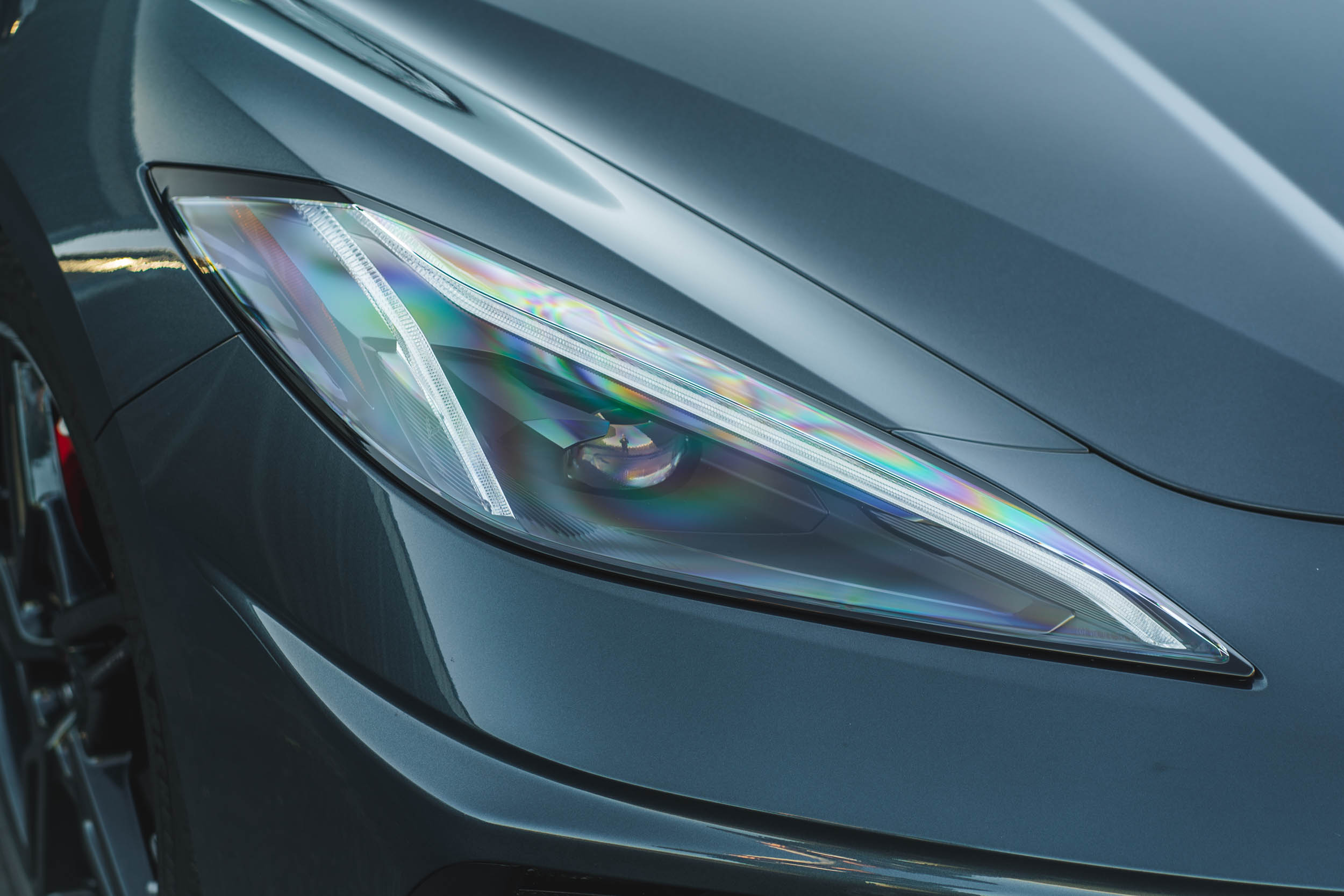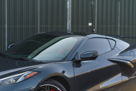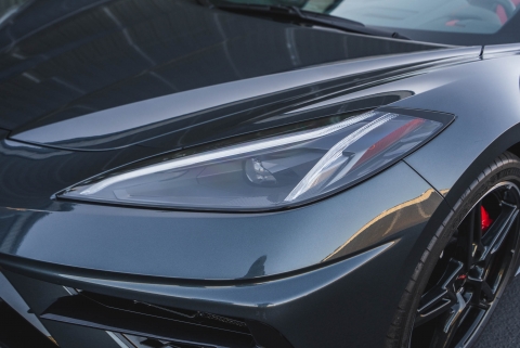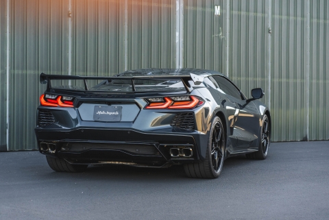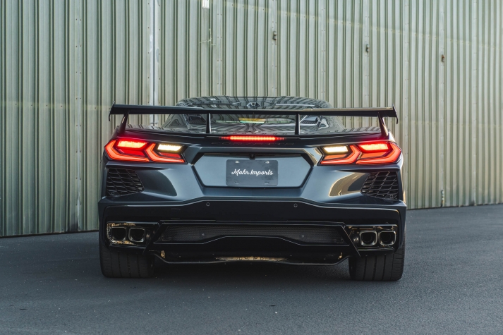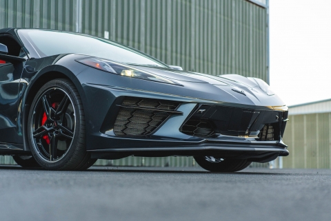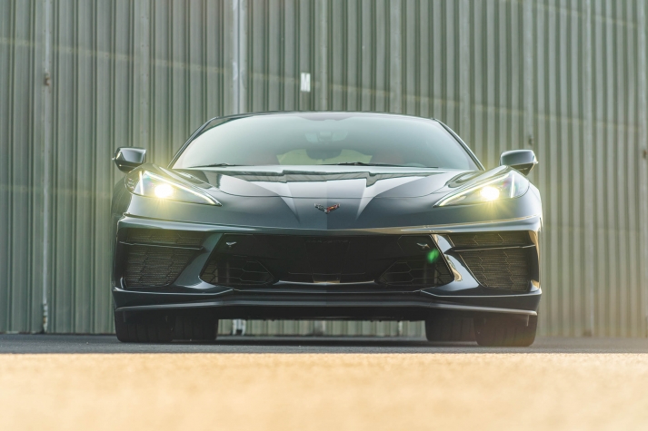 The 2020 model year marked the debut of the eighth-generation Corvette, and this example is finished in Shadow Gray Metallic with a factory-ordered and dealer-installed high wing. Additional exterior details include LED headlights, front and rear cameras, and a removable roof panel with visible carbon fiber.