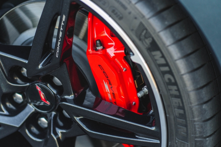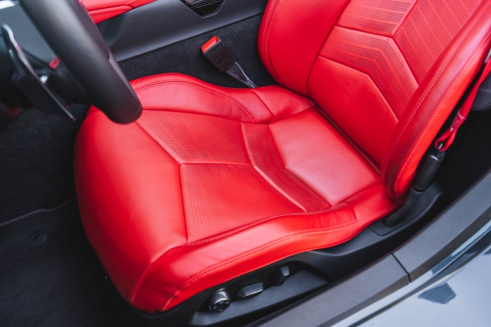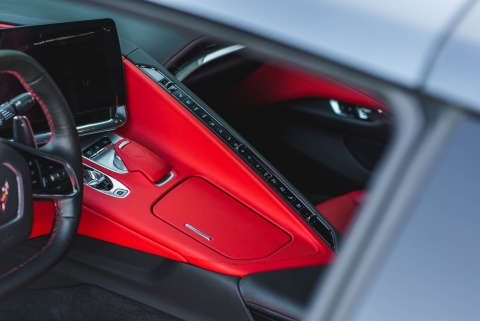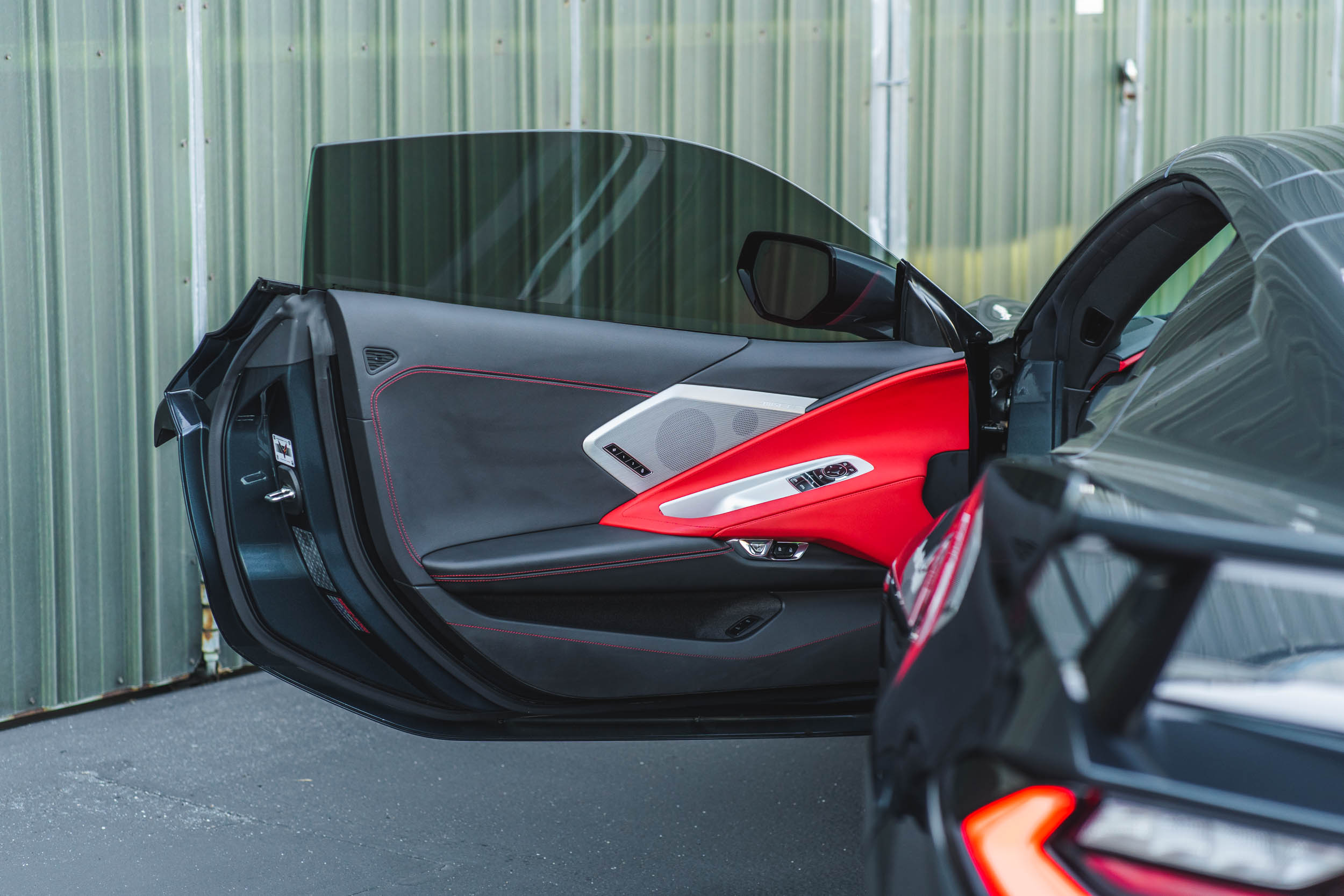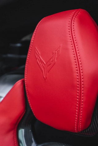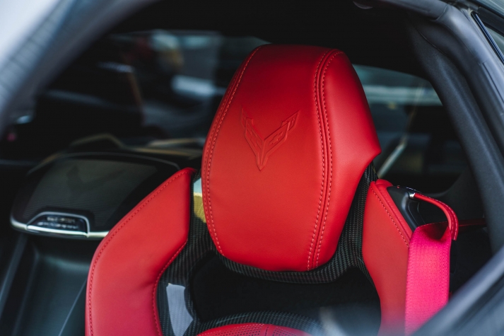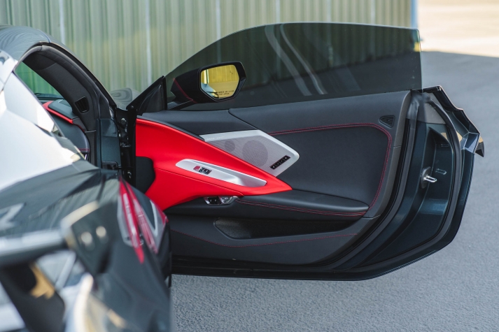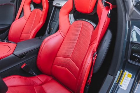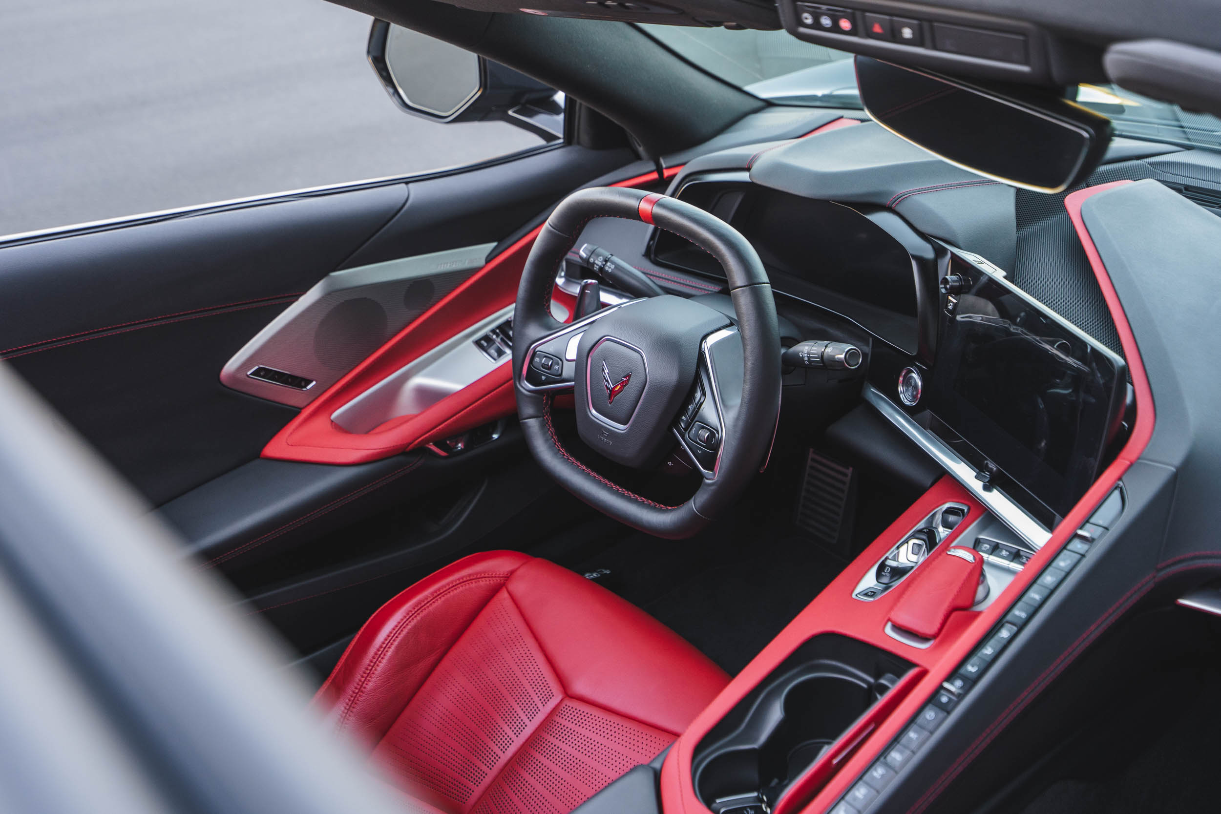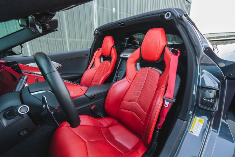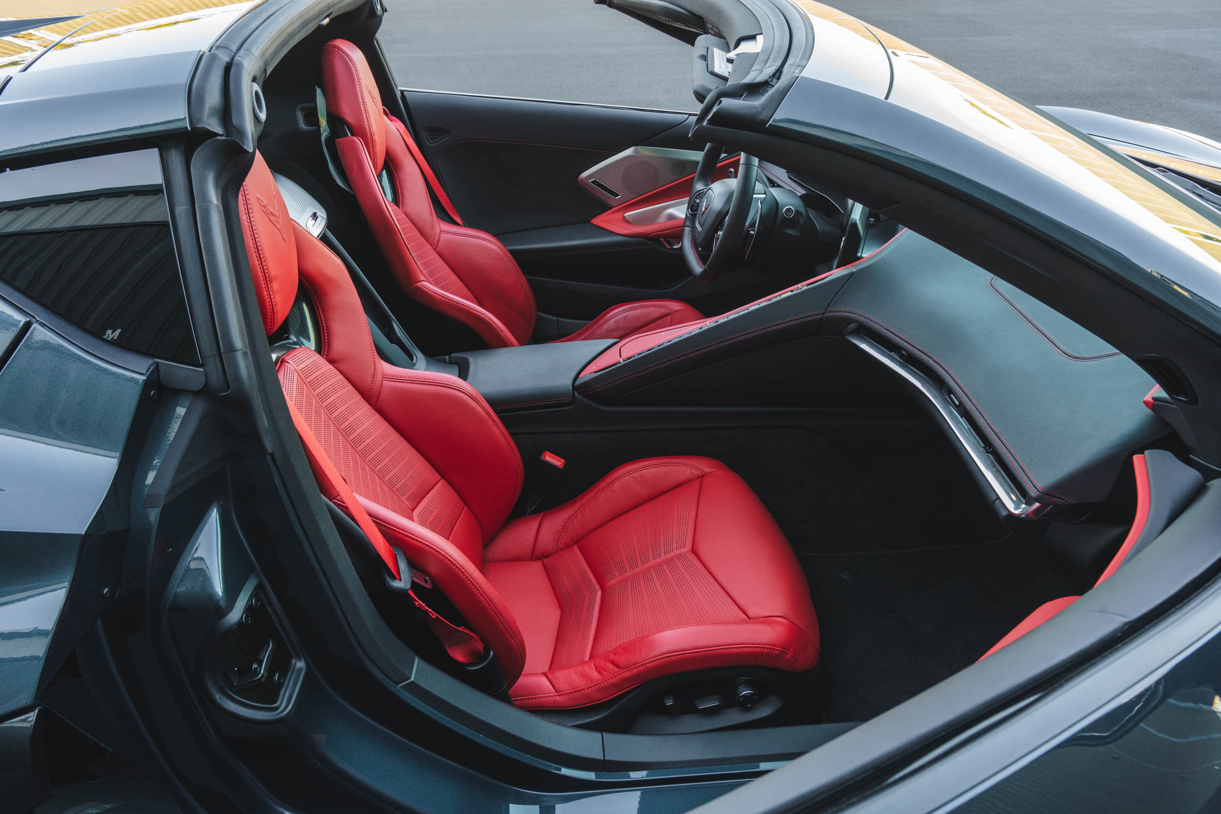 The car was optioned with heated and ventilated GT2 bucket seats, which are trimmed in Adrenaline Red leather upholstery and complemented by Torch Red seat belts. Black leather with red stitching covers other interior surfaces, with red leather accents on the dash and doors. The 2LT package included a Chevrolet Infotainment 3 system with navigation, a Bose 14-speaker sound system, cargo nets, a head-up display, front and rear cameras, a data and video recorder, a heated steering wheel, wireless phone charger, a universal remote, and blind-spot and rear cross-traffic alerts. The car is also equipped with dual-zone automatic climate control, power windows and mirrors, Apple CarPlay/Android Auto, Bluetooth connectivity, and an adjustable steering column.