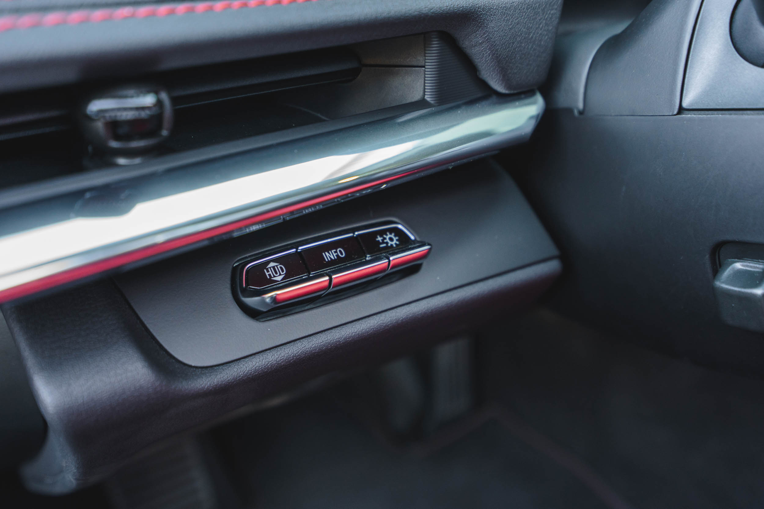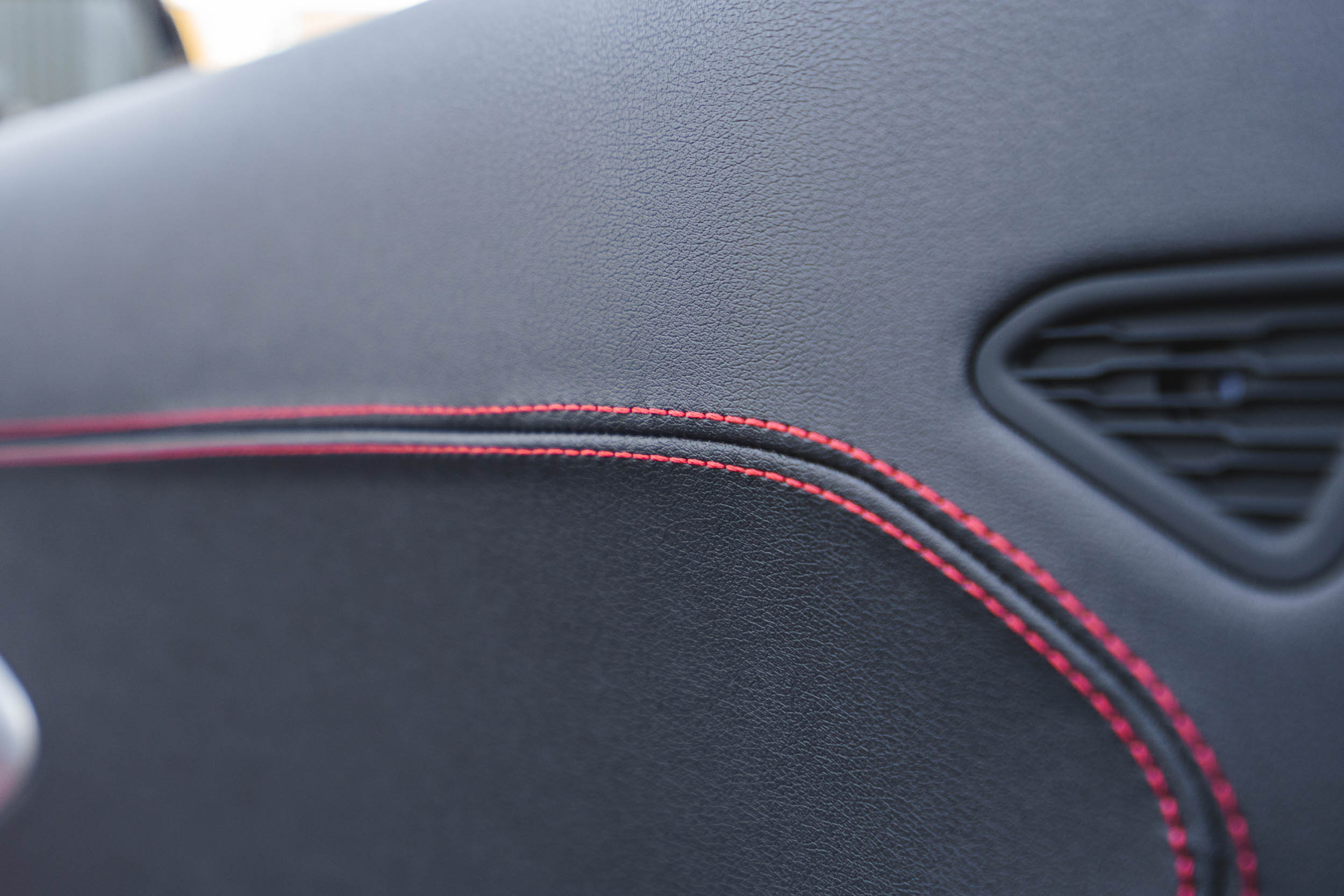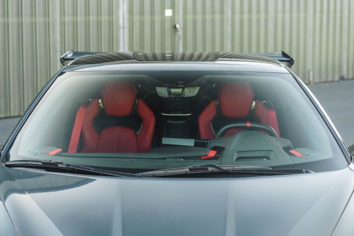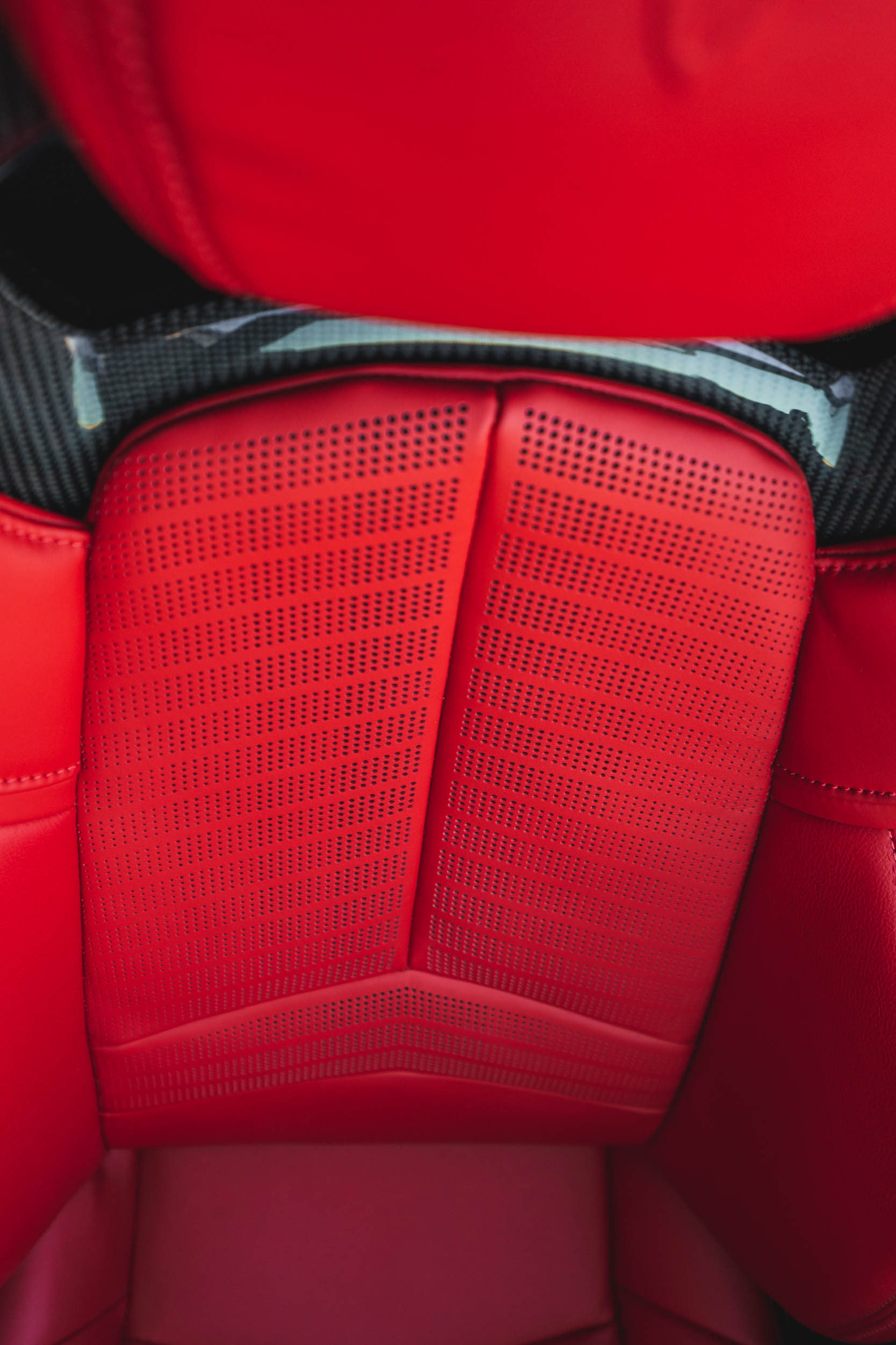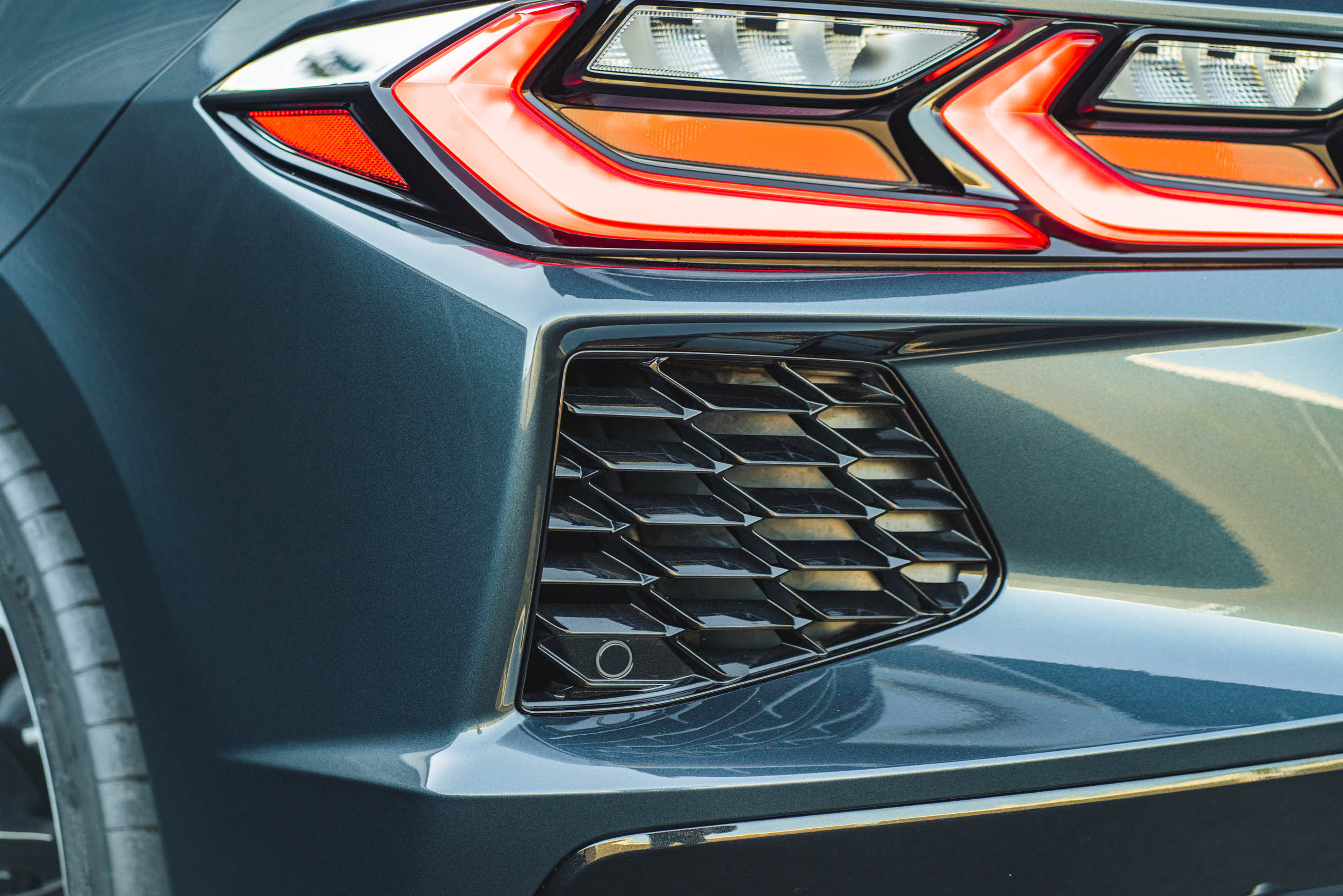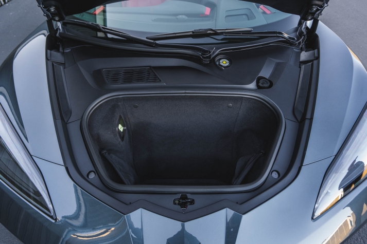 The car was optioned with heated and ventilated GT2 bucket seats, which are trimmed in Adrenaline Red leather upholstery and complemented by Torch Red seat belts. Black leather with red stitching covers other interior surfaces, with red leather accents on the dash and doors. The 2LT package included a Chevrolet Infotainment 3 system with navigation, a Bose 14-speaker sound system, cargo nets, a head-up display, front and rear cameras, a data and video recorder, a heated steering wheel, wireless phone charger, a universal remote, and blind-spot and rear cross-traffic alerts. The car is also equipped with dual-zone automatic climate control, power windows and mirrors, Apple CarPlay/Android Auto, Bluetooth connectivity, and an adjustable steering column.