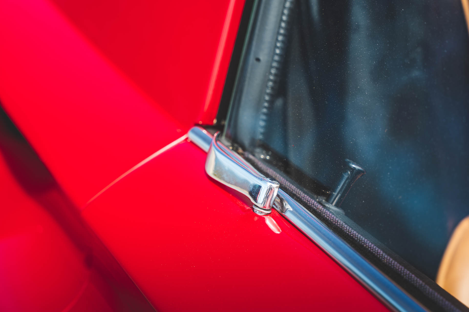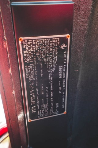 The Scaglietti-built bodywork is said to have been delivered from the factory in Blu Dino Metalizzato, and it was repainted in its current red under previous ownership. Exterior features include US-market lighting, split chrome bumpers with rubber inserts, dual side-view mirrors, a power antenna, quad ANSA exhaust outlets, and a black roof panel.