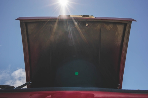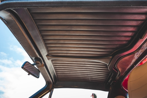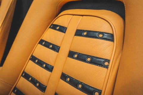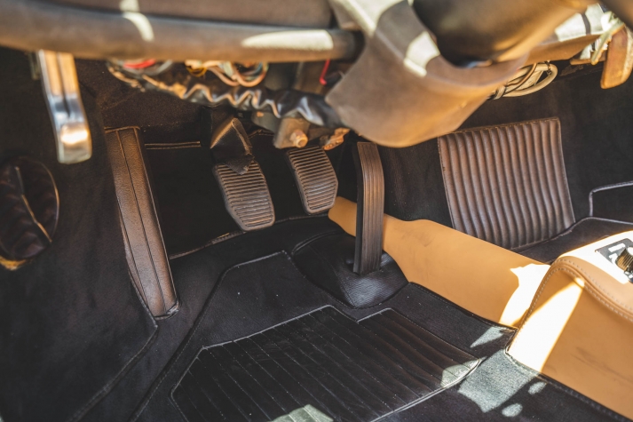 The cabin houses Daytona-style seats that are said to have been retrimmed in beige leather with black accents in 2014. Beige leather also covers the door panels and center console. Black carpets line the floors, and additional features include gray “mouse hair” dash trim, Borletti air conditioning, a Becker Mexico cassette player, power windows, shoulder belts, and a gated shifter.