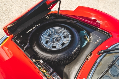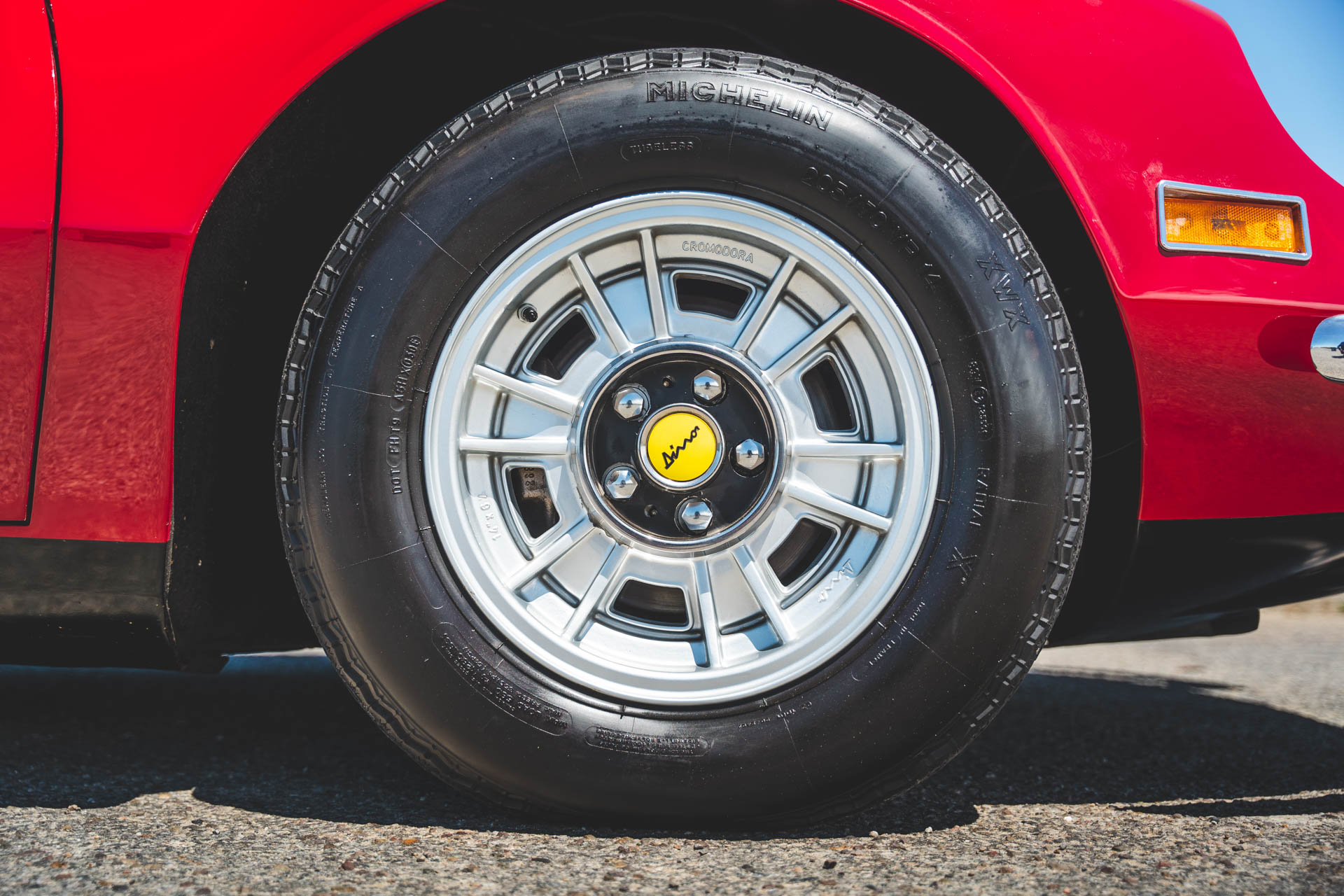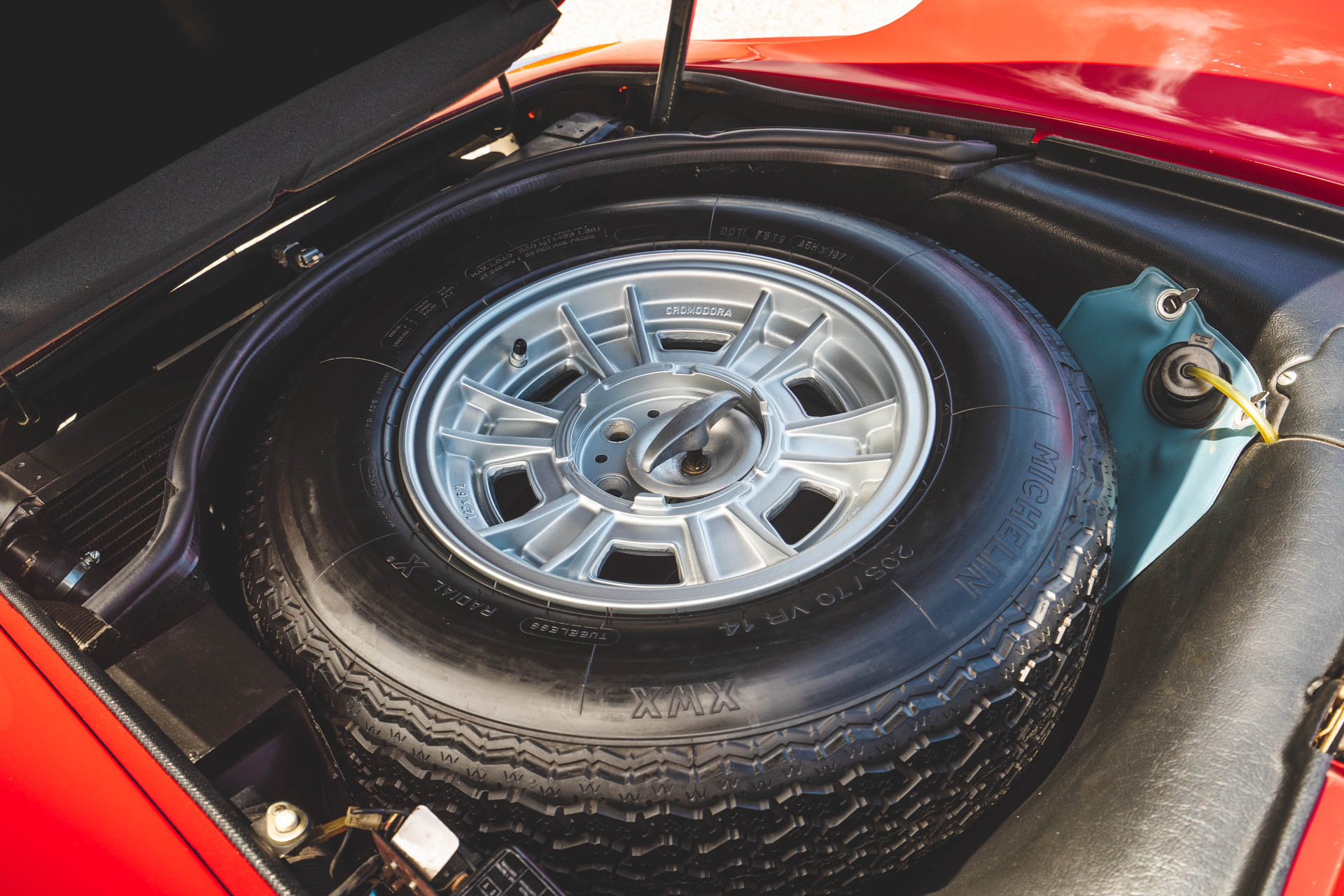 Cromodora alloy wheels wear Dino-branded center caps and are wrapped in 205/70VR14 Michelin XWX tires. A matching spare wheel and tire are fitted in the front trunk. Stopping power is provided by ventilated disc brakes at all four corners.