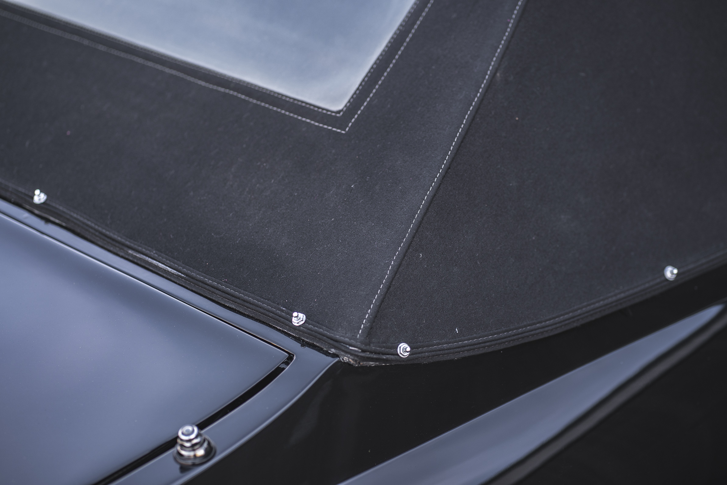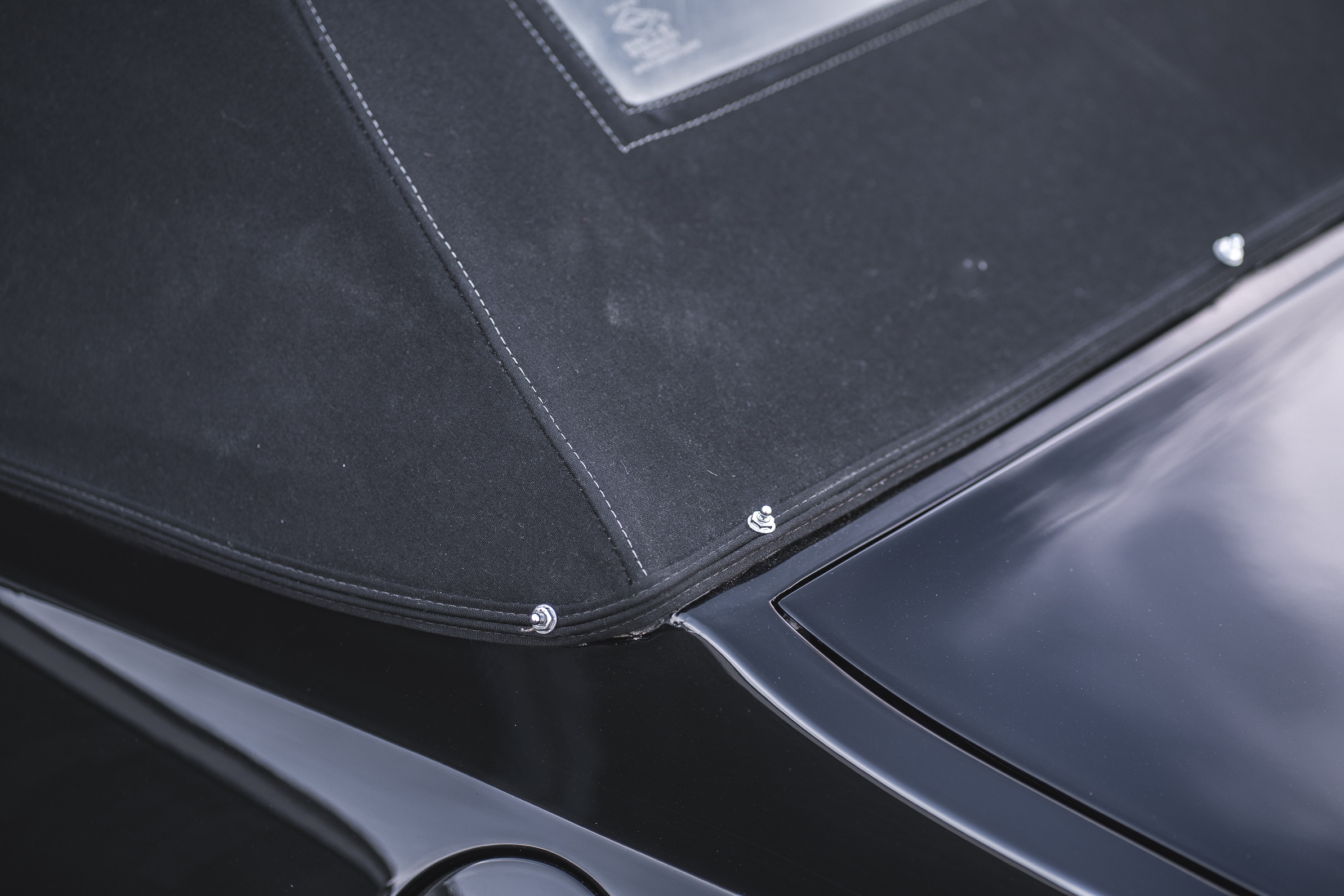The car is finished in black with a black soft top and a matching boot cover. Dings on the front and rear bumpers are noted, and the paintwork and exterior trim are shown up close in the photo gallery below.