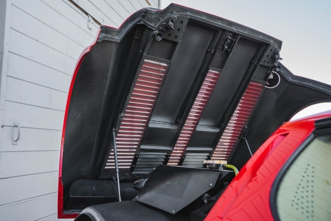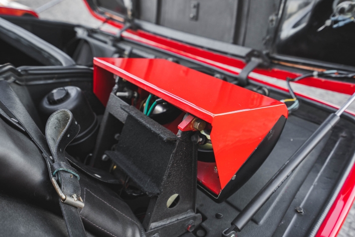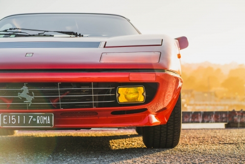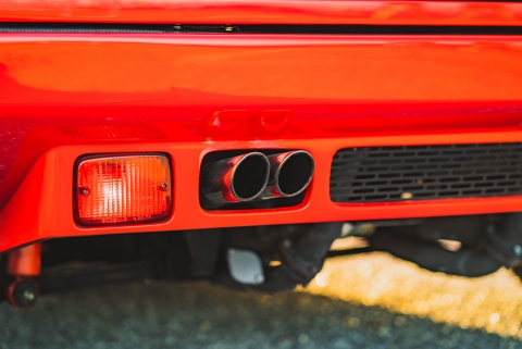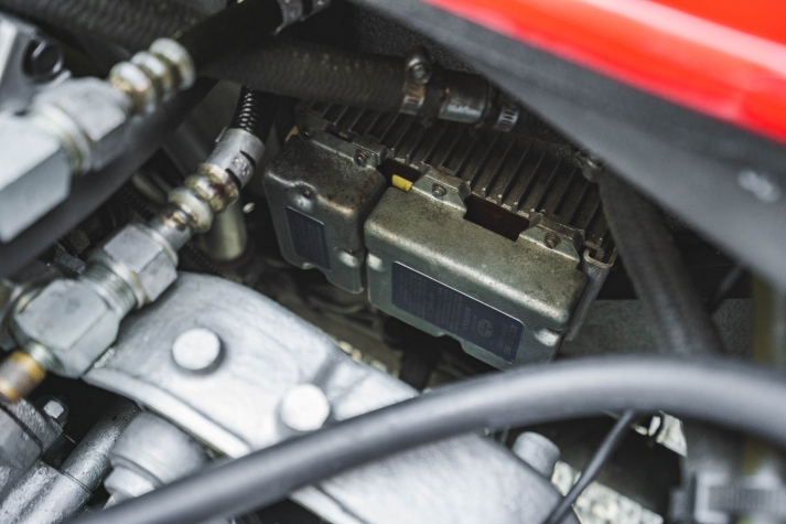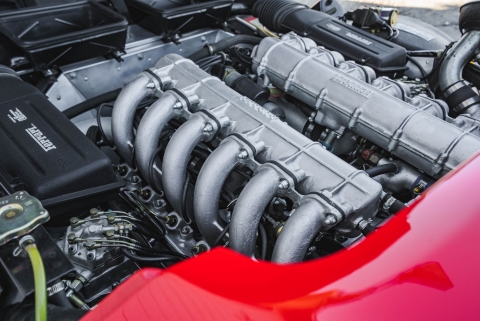 The Pininfarina-designed bodywork was executed by Scaglietti, and construction consists of a steel semi-monocoque with front and rear subframes, aluminum doors and clamshells, and lower panels in fiber-reinforced plastic. This example is finished in Rosso Corsa, and features include pop-up headlights, fog lights, a front spoiler, and NACA side ducts. The car is not equipped with side-marker lights. Paint-meter readings are provided toward the end of the gallery.