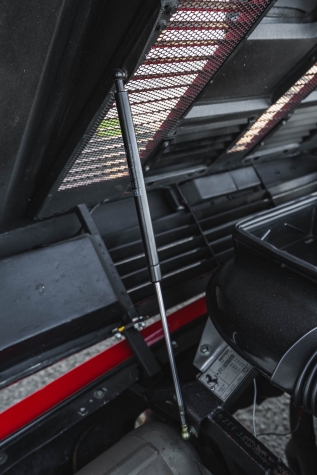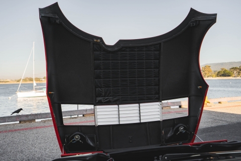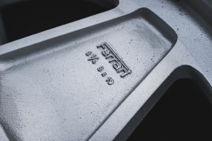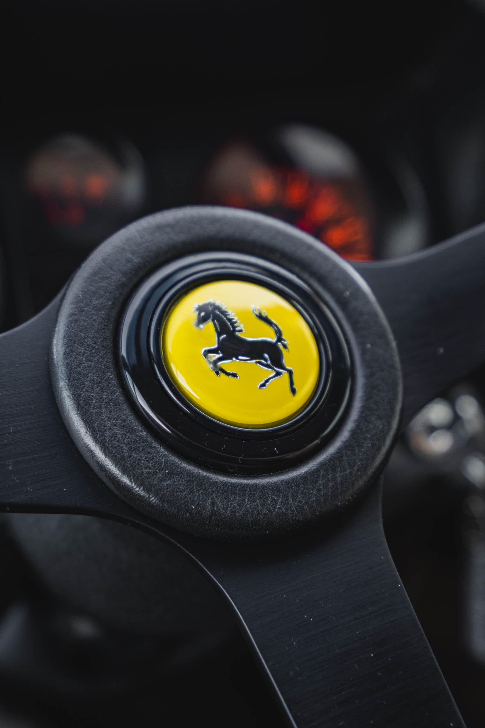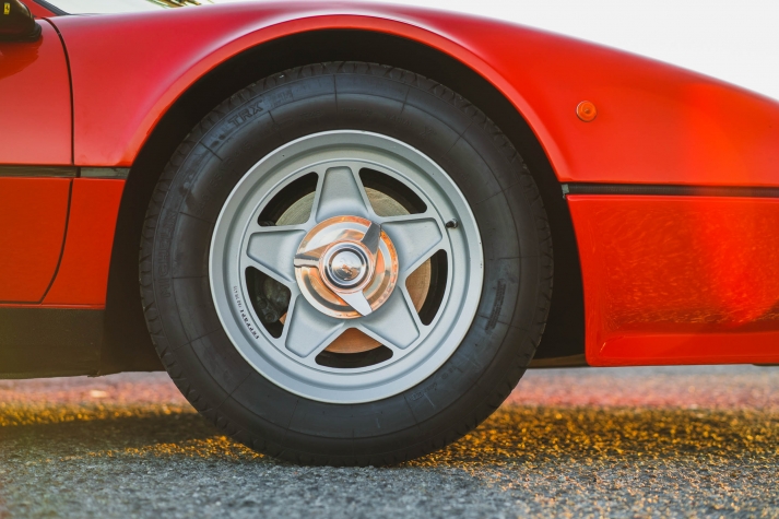 Five-spoke center-lock metric wheels with Ferrari etchings are mounted with three-ear chrome knockoffs and wear 240/55VR415 Michelin TRX tires, which were installed in May 2022. Each corner is equipped with disc brakes.