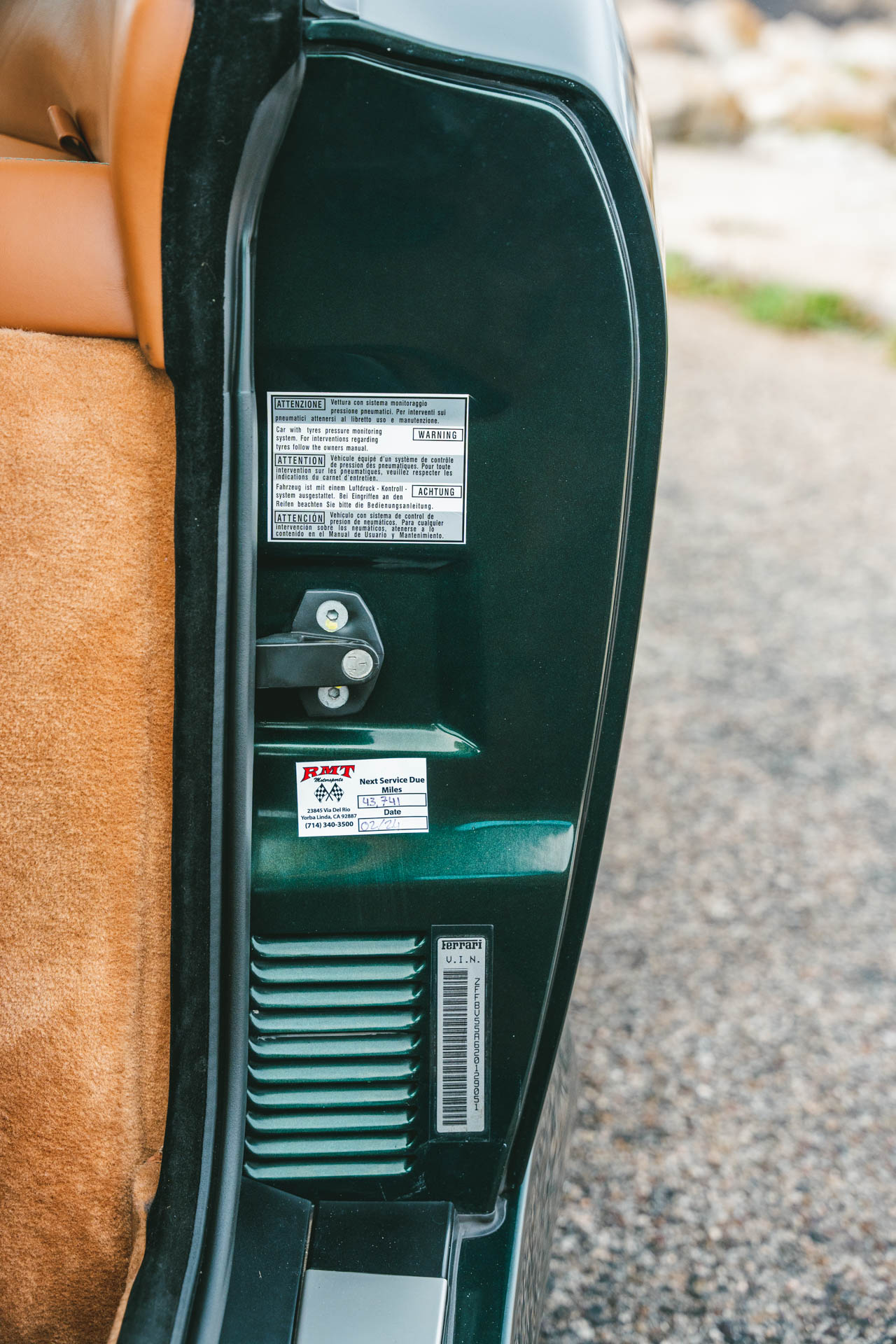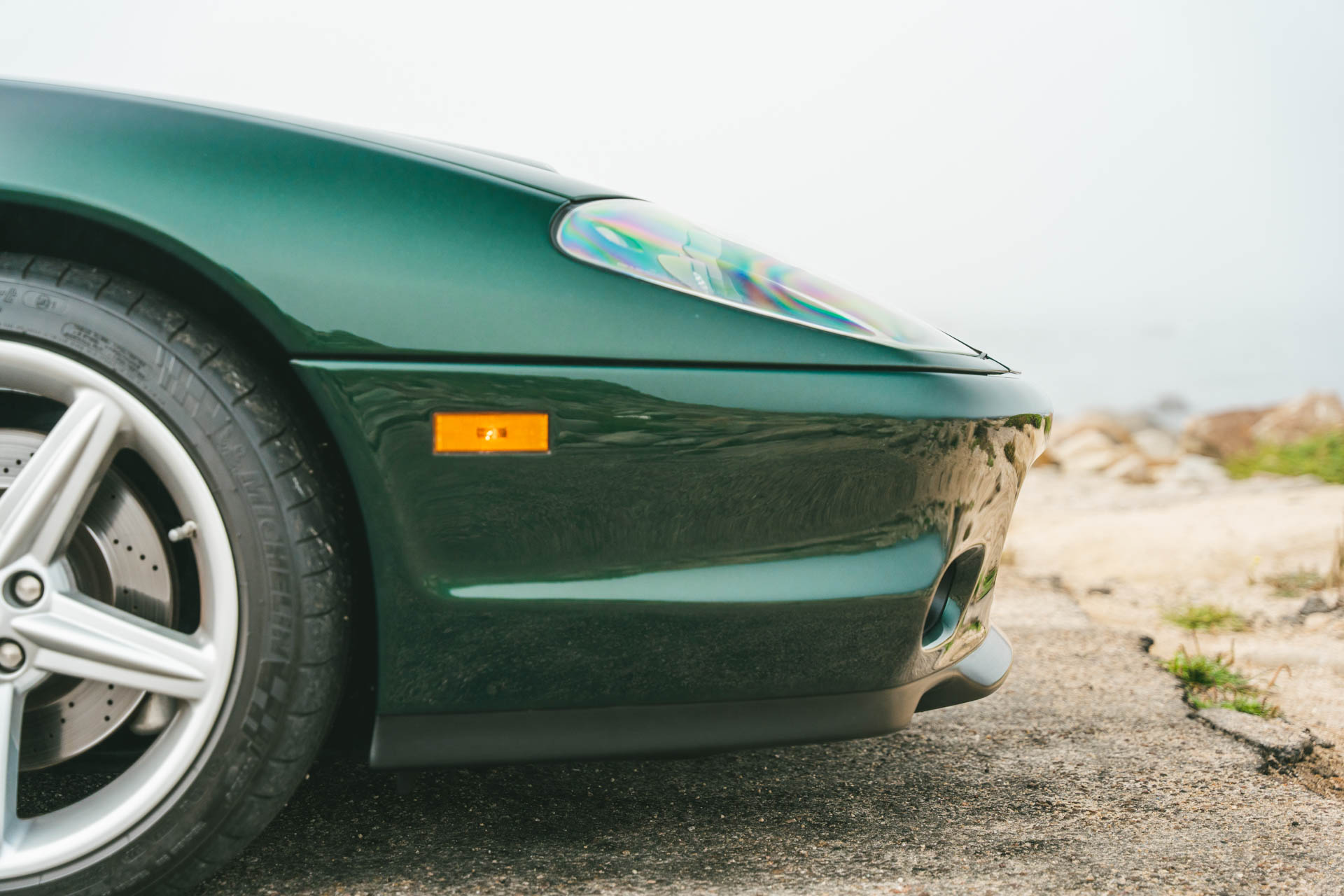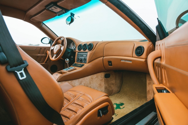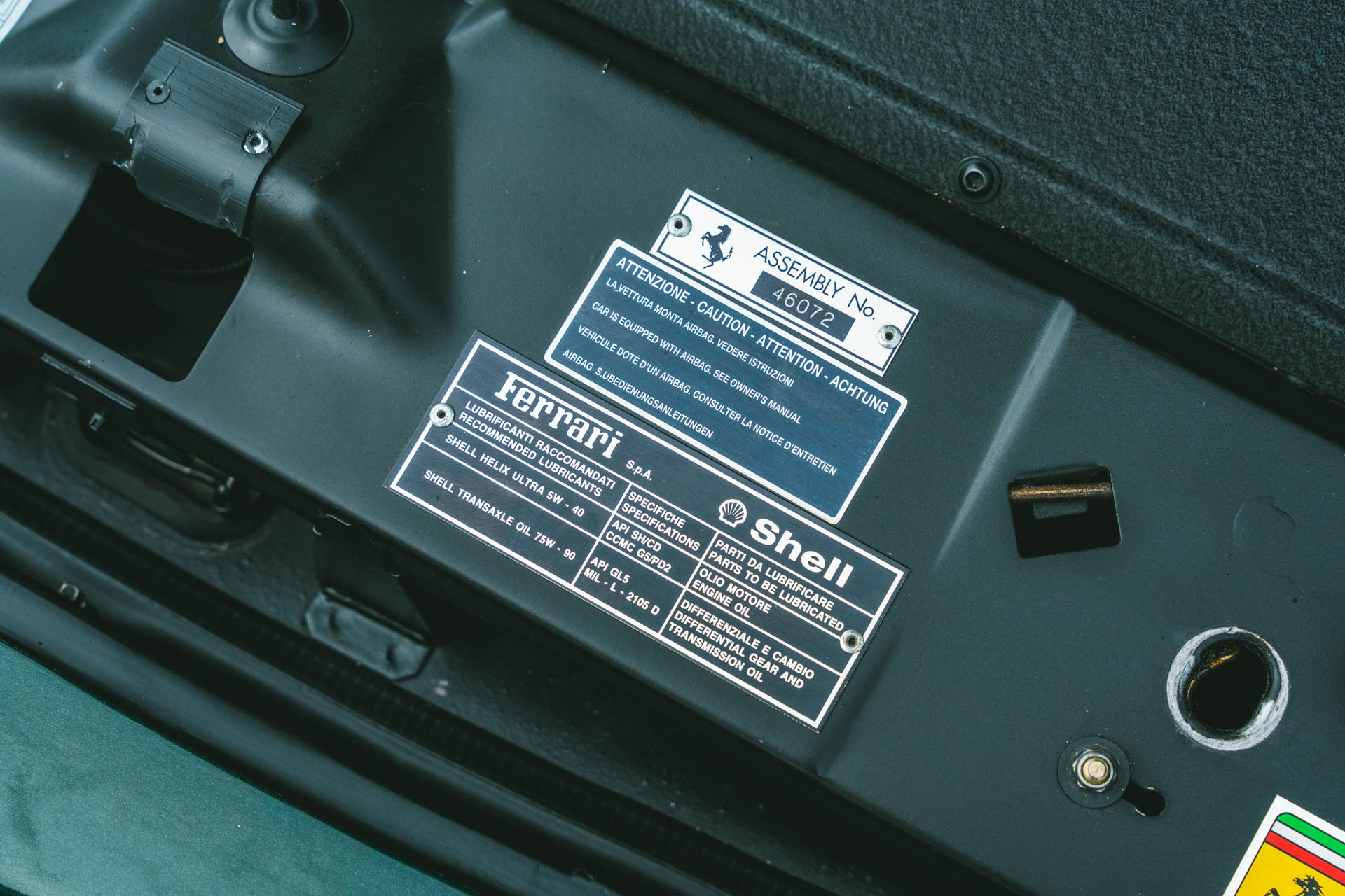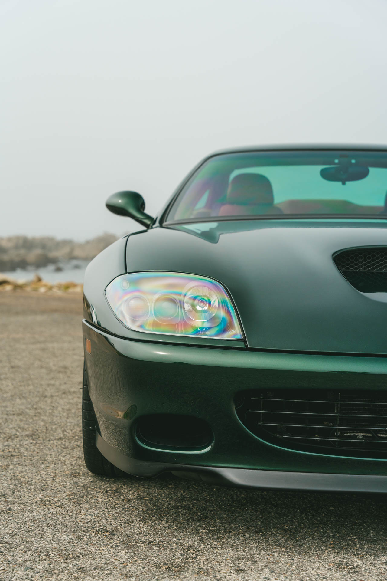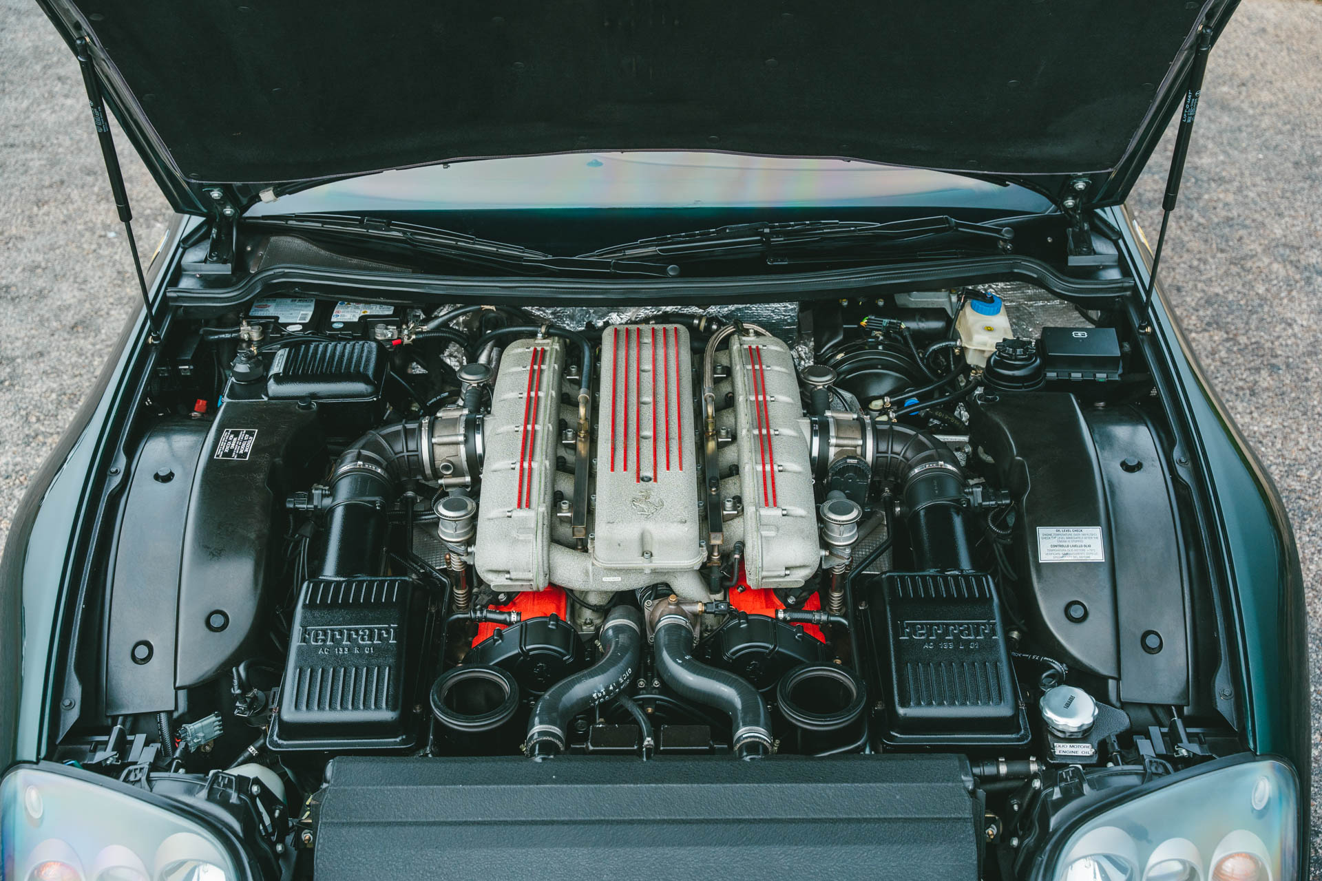 The Pininfarina-designed aluminum bodywork is finished in Verde Zeltweg (610). A Scud Ing LED light kit for the front and rear lights was installed in September 2022, and equipment also includes xenon headlights, fog lights, a hood scoop, a front spoiler, front fender vents, Scuderia Ferrari fender shields, and quad exhaust tips exiting through the rear bumper cover. The Carfax report lists an accident that “likely occurred between May 2015 and June 2016.” The front bumper cover was repaired and refinished in March 2023, and the rocker panels were refinished in June 2002. Photos of paint meter readings are provided in the image gallery below.