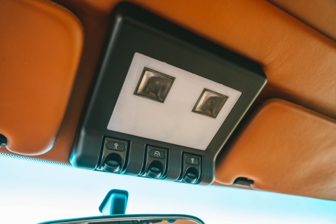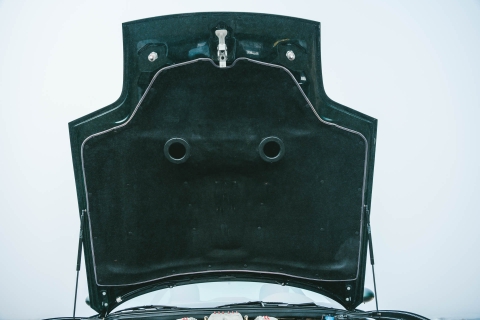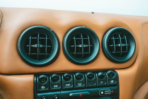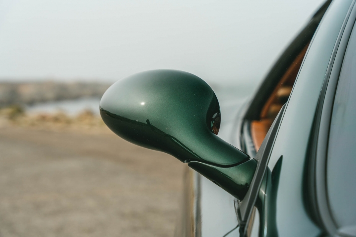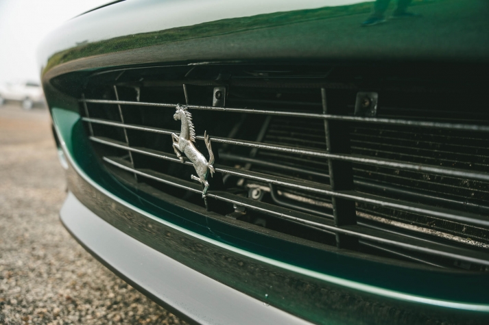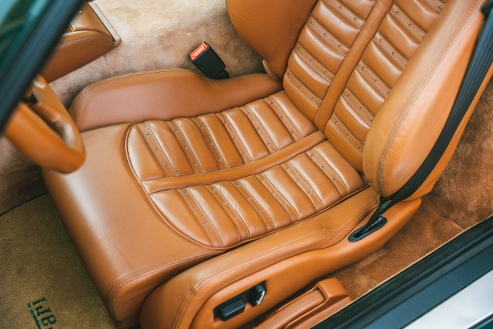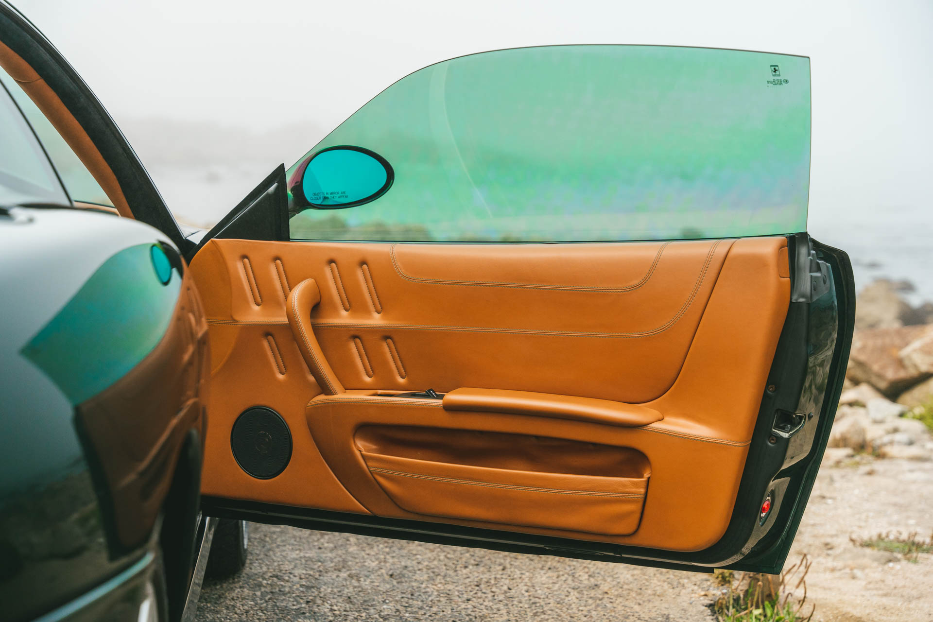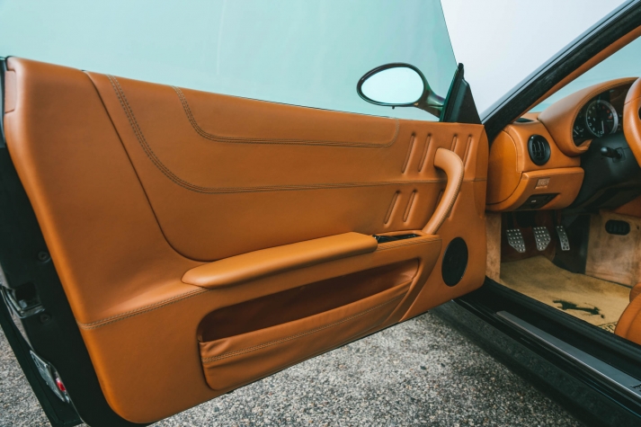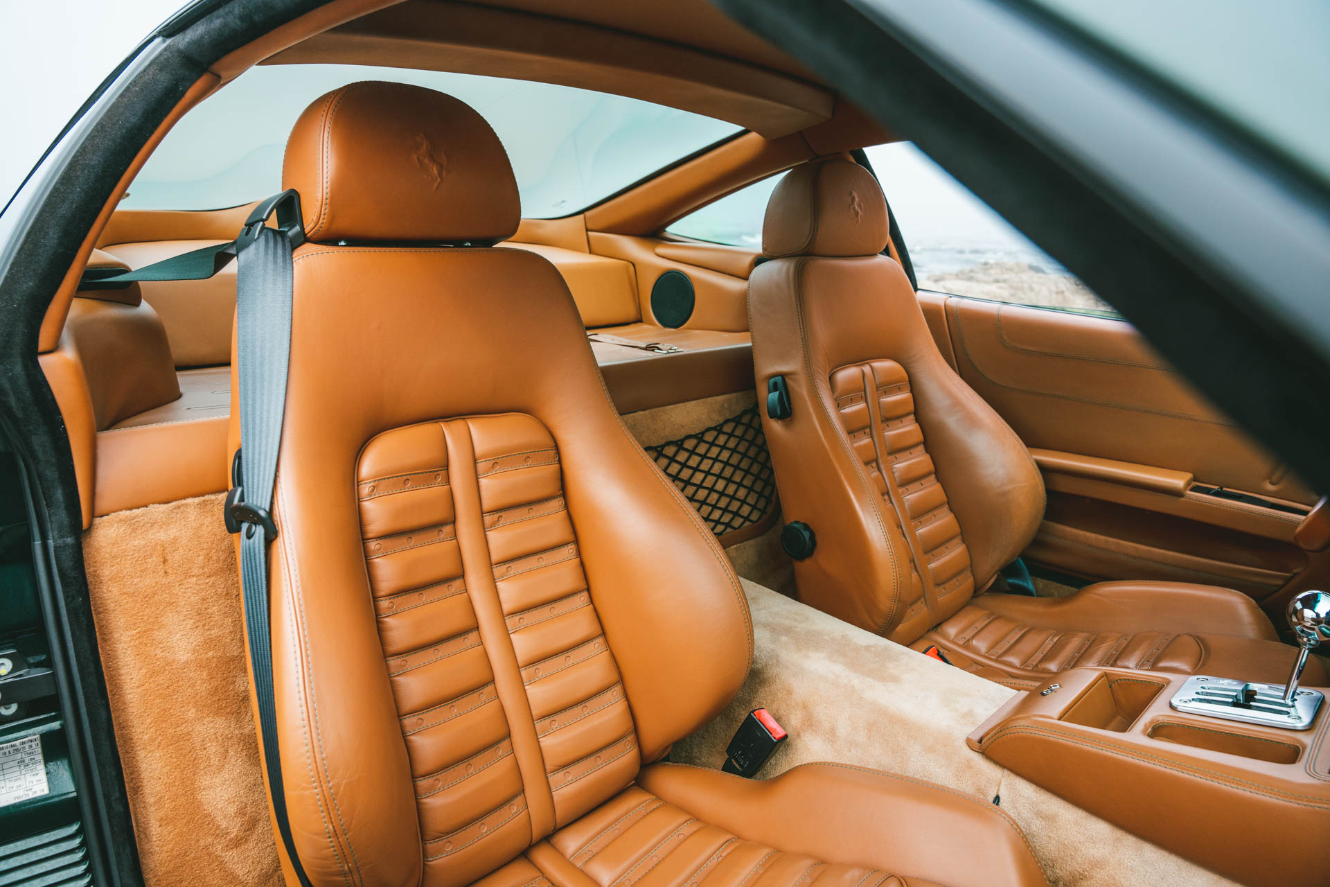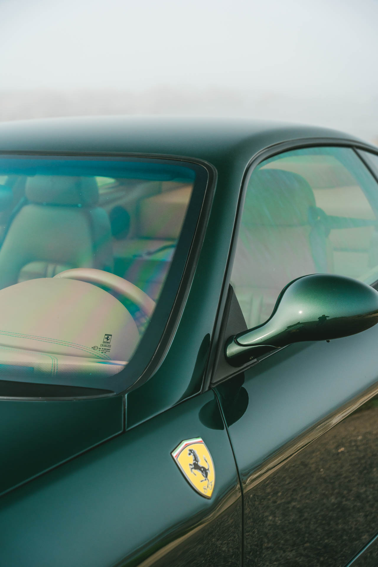 The Pininfarina-designed aluminum bodywork is finished in Verde Zeltweg (610). A Scud Ing LED light kit for the front and rear lights was installed in September 2022, and equipment also includes xenon headlights, fog lights, a hood scoop, a front spoiler, front fender vents, Scuderia Ferrari fender shields, and quad exhaust tips exiting through the rear bumper cover. The Carfax report lists an accident that “likely occurred between May 2015 and June 2016.” The front bumper cover was repaired and refinished in March 2023, and the rocker panels were refinished in June 2002. Photos of paint meter readings are provided in the image gallery below.