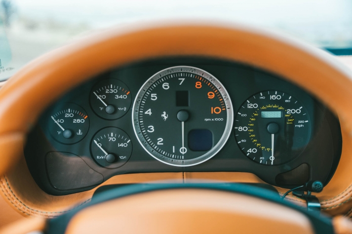 Instrumentation includes a 220-mph speedometer, a tachometer with a 7,600-rpm redline, and auxiliary gauges. The digital odometer indicates 41k miles. A November 2019 invoice from Ferrari Electronics LLC in Costa Mesa, California, indicates that the odometer was switched from kilometers to miles at that time. Roughly 5,500 miles have been added under current ownership.