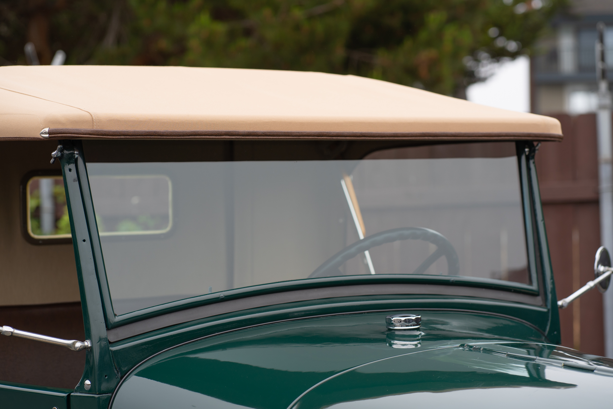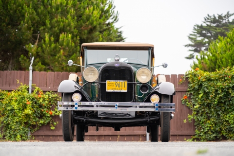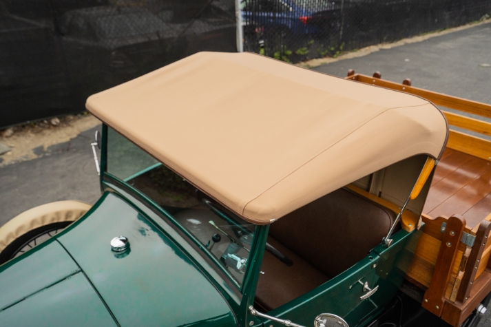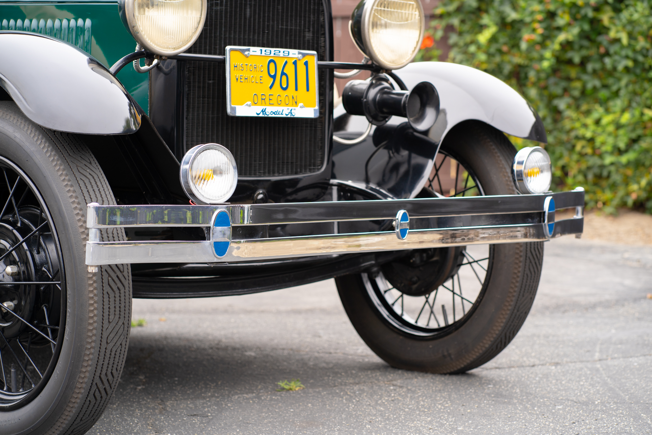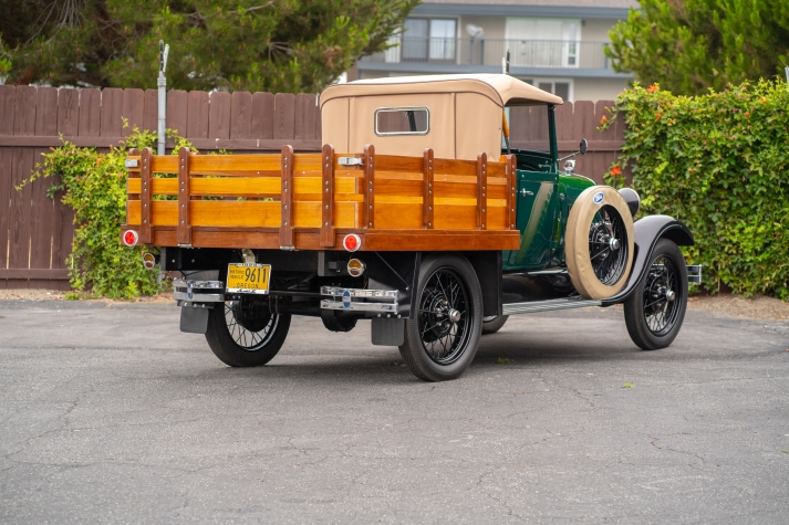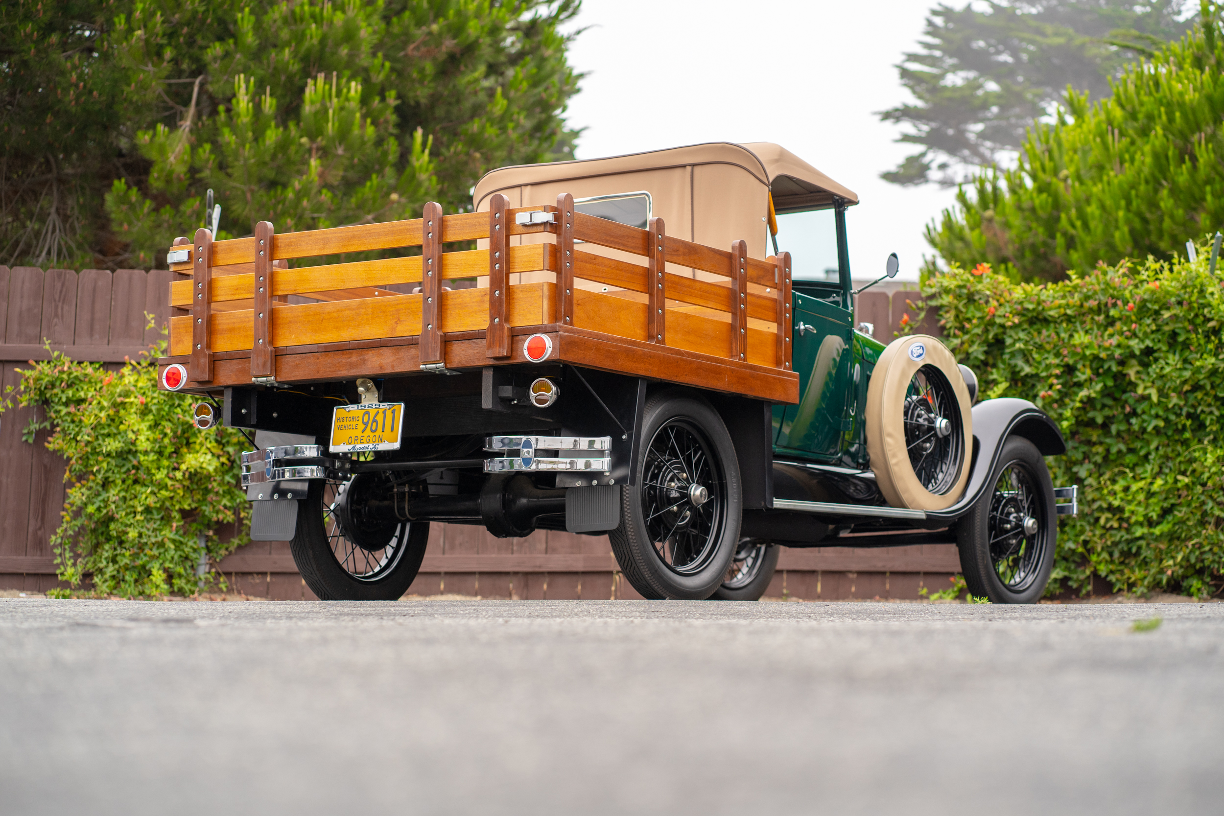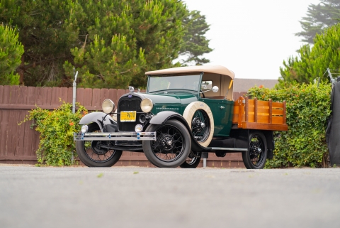 This 1929 Ford Model A is an open-cab pickup that was refurbished around 1995 with a repaint in green and black and construction of a stake-side wooden flatbed. Power comes from a 201ci inline-four paired with a three-speed manual transmission, and features include a tan soft top, 21? wire wheels, dual side-mount spares, polished bumpers, turn signals, and a brown-trimmed bench seat. The current owner acquired the car in April 2022. This Model A roadster pickup is now offered at no reserve on dealership consignment in California with a clean Oregon title.