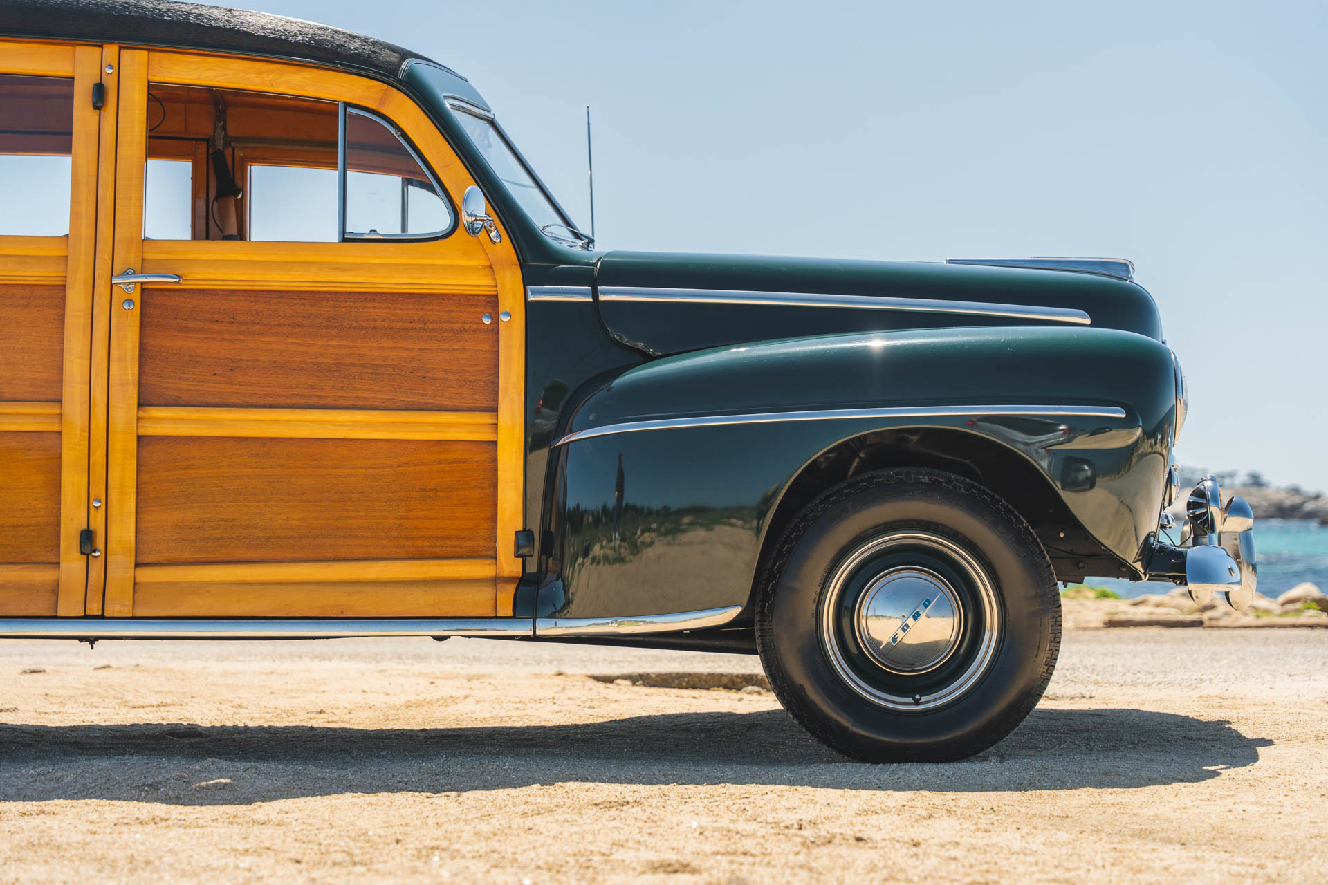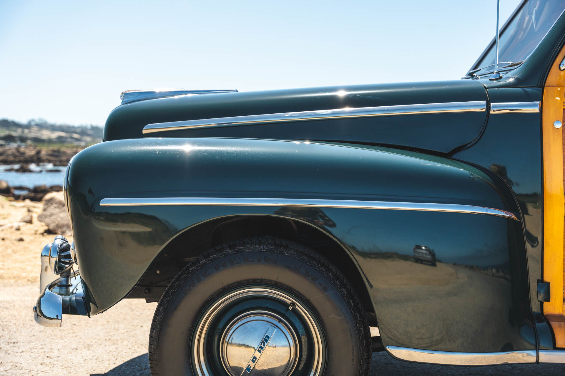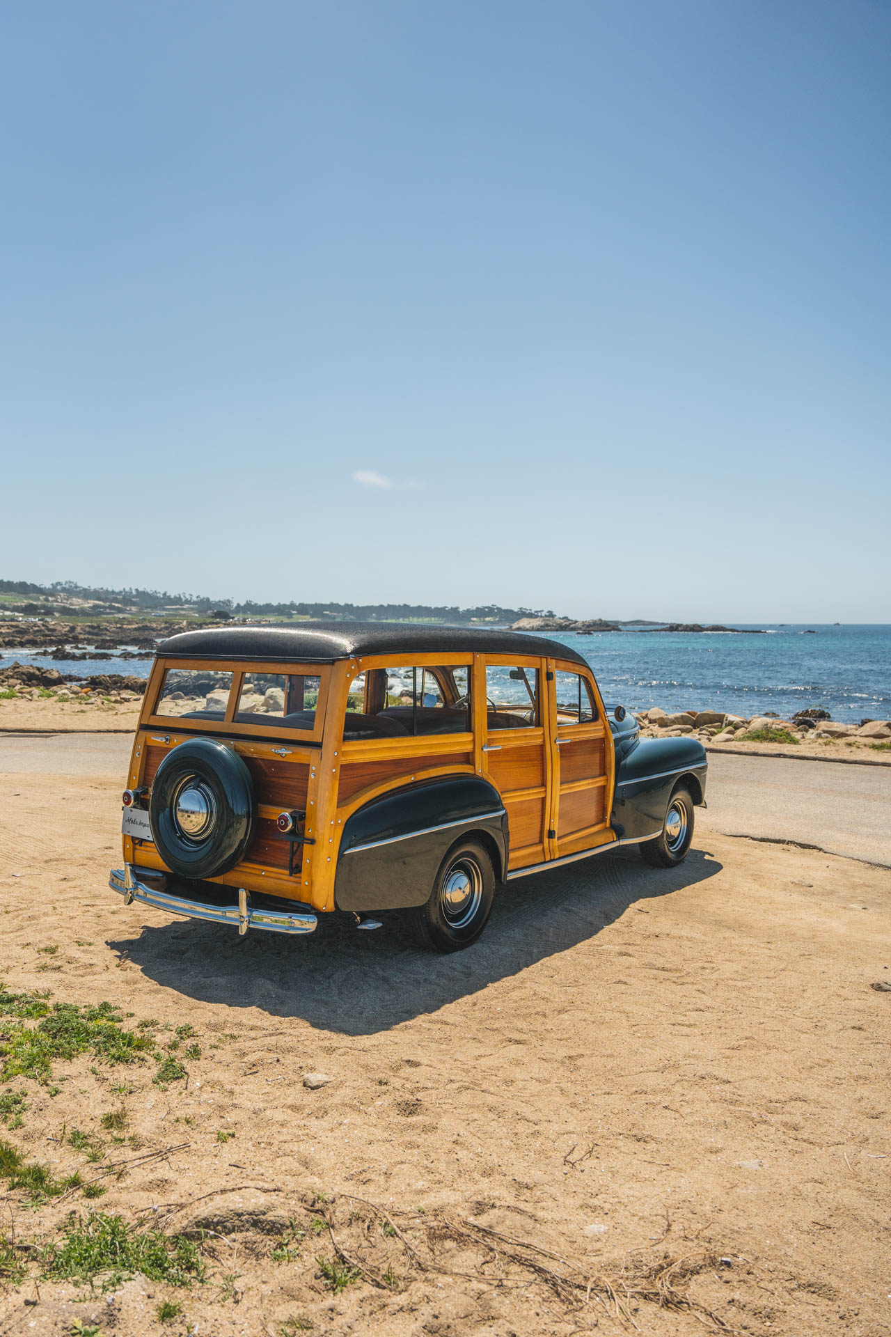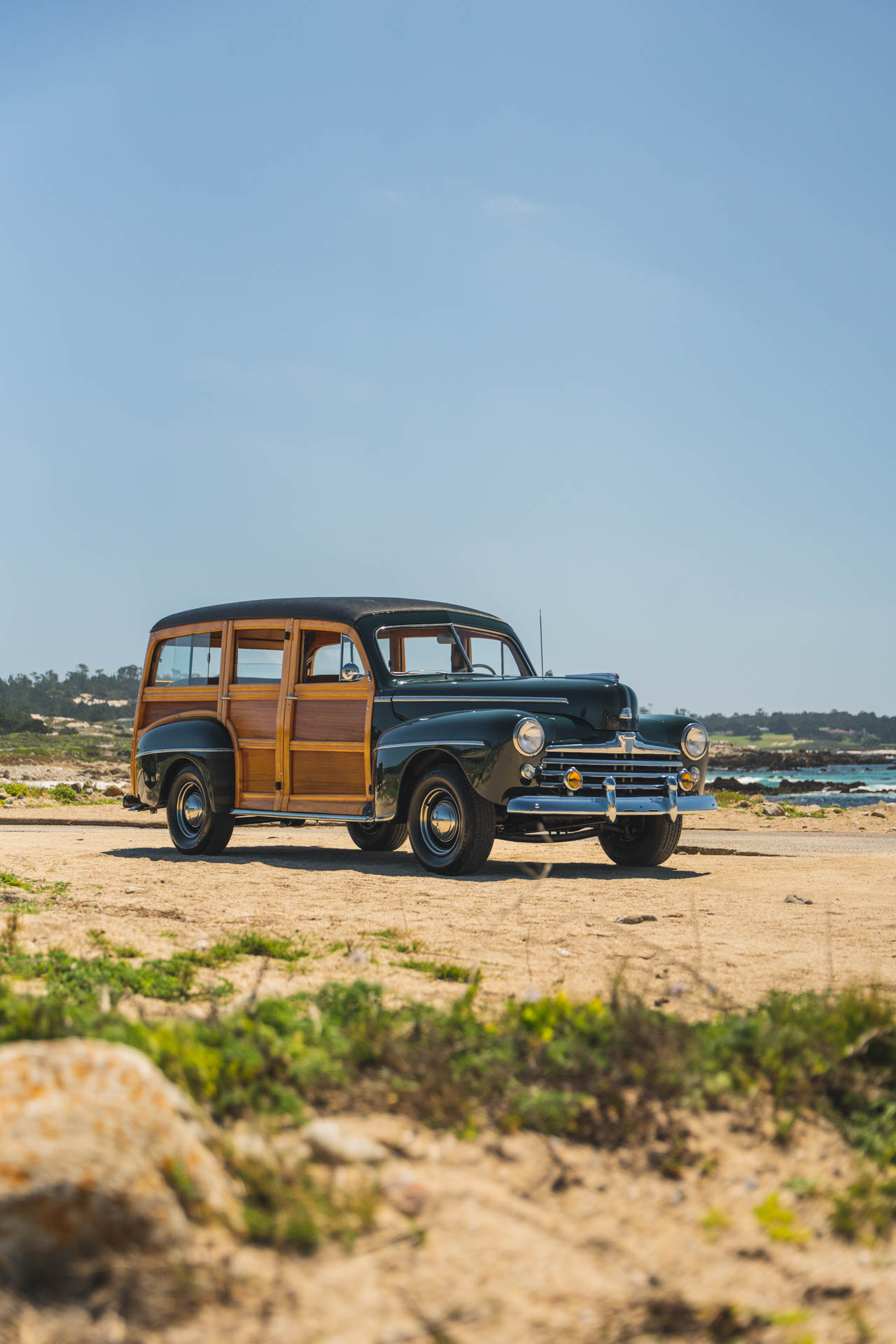 This 1948 Ford Super Deluxe is one of 8,912 station wagons produced for the model year and was refurbished under prior ownership. It is powered by a 239ci flathead V8 linked with a three-speed manual transmission and is finished in Glade Green over tan leather. Equipment includes chrome bumpers, 16” steel wheels with polished hubcaps, three rows of bench seating, a 12-volt electric system, lap belts, and a push-button AM radio. The current owner purchased the car in 2017 and has since added approximately 1k miles. This Super Deluxe is now offered on dealer consignment in California with a Washington title. The car is finished in Glade Green, and the doors and side panels are constructed of wood framing and paneling. Additional exterior equipment includes a black roof, dual side mirrors, a downturned exhaust tip, turn signals, and a chrome grille, bumpers, and trim. The body-color 15” steel wheels feature polished hubcaps and trim rings, and they are mounted with Michelin XW4 tires measuring 205/75. The car was factory equipped with front and rear transverse leaf springs, and stopping power is provided by hydraulic front and rear drums. The cabin features three rows of bench seats upholstered in tan leather, and interior amenities include three-point front seatbelts, second-row lap belts, vent windows, a push-button AM radio, and chrome dashboard trim. The two-spoke steering wheel features a chrome horn ring and fronts a 100-mph speedometer and gauges for fuel level, oil pressure, battery, and coolant temperature. The five-digit odometer shows 57k miles, approximately 1k of which were added under current ownership. Total mileage is unknown. An auxiliary fuel-level gauge has been added beneath the dashboard. The 239ci flathead V8 was factory rated at 100 horsepower and is topped with a Holley carburetor. The electrical system has been converted to 12 volts with an alternator, and the fuel pump is said to have been recently replaced. An engine kill switch has been added. Power is routed to the rear wheels through a column-shifted three-speed manual transmission. Additional photos of the underside are presented in the gallery. The Washington title lists an Antique brand.