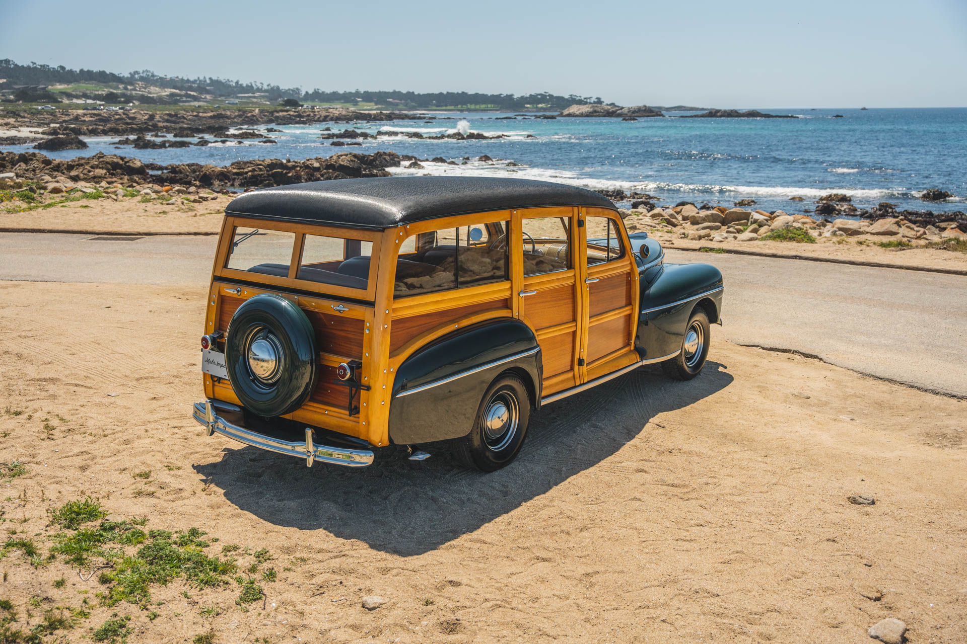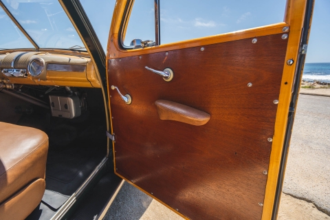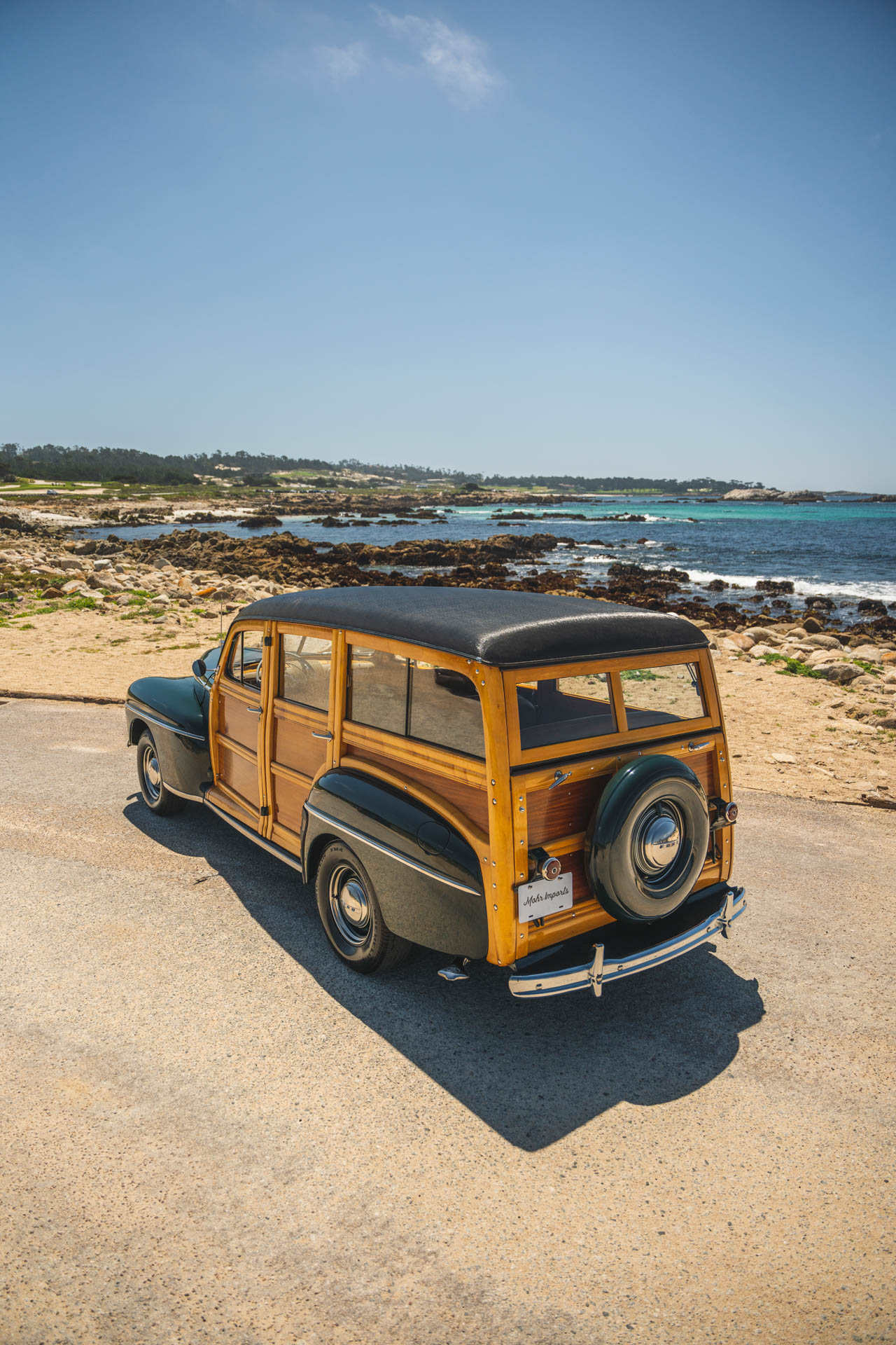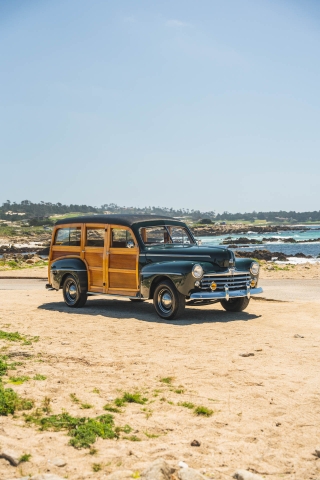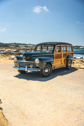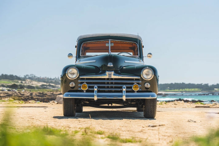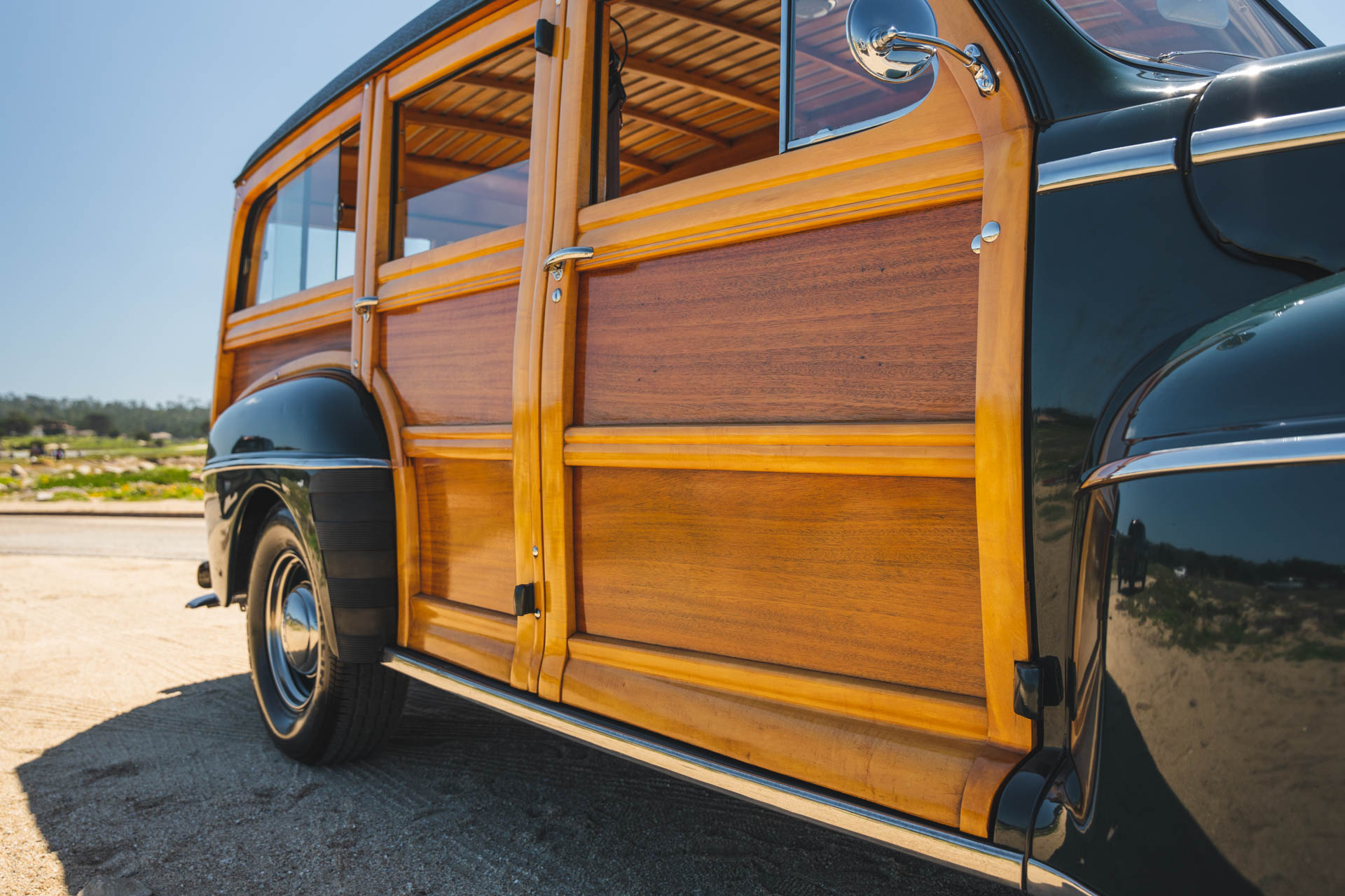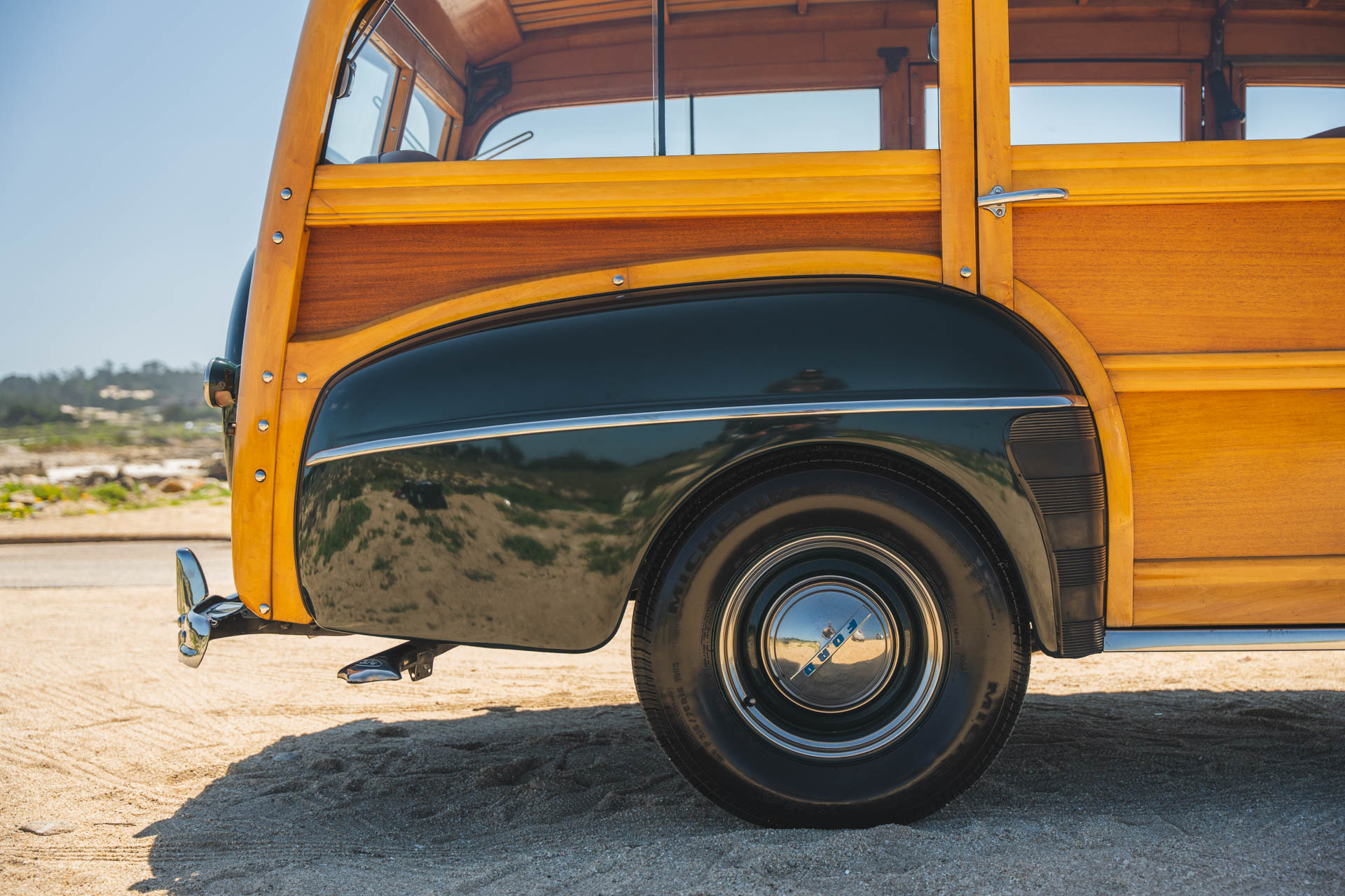 This 1948 Ford Super Deluxe is one of 8,912 station wagons produced for the model year and was refurbished under prior ownership. It is powered by a 239ci flathead V8 linked with a three-speed manual transmission and is finished in Glade Green over tan leather. Equipment includes chrome bumpers, 16” steel wheels with polished hubcaps, three rows of bench seating, a 12-volt electric system, lap belts, and a push-button AM radio. The current owner purchased the car in 2017 and has since added approximately 1k miles. This Super Deluxe is now offered on dealer consignment in California with a Washington title. The car is finished in Glade Green, and the doors and side panels are constructed of wood framing and paneling. Additional exterior equipment includes a black roof, dual side mirrors, a downturned exhaust tip, turn signals, and a chrome grille, bumpers, and trim. The body-color 15” steel wheels feature polished hubcaps and trim rings, and they are mounted with Michelin XW4 tires measuring 205/75. The car was factory equipped with front and rear transverse leaf springs, and stopping power is provided by hydraulic front and rear drums. The cabin features three rows of bench seats upholstered in tan leather, and interior amenities include three-point front seatbelts, second-row lap belts, vent windows, a push-button AM radio, and chrome dashboard trim. The two-spoke steering wheel features a chrome horn ring and fronts a 100-mph speedometer and gauges for fuel level, oil pressure, battery, and coolant temperature. The five-digit odometer shows 57k miles, approximately 1k of which were added under current ownership. Total mileage is unknown. An auxiliary fuel-level gauge has been added beneath the dashboard. The 239ci flathead V8 was factory rated at 100 horsepower and is topped with a Holley carburetor. The electrical system has been converted to 12 volts with an alternator, and the fuel pump is said to have been recently replaced. An engine kill switch has been added. Power is routed to the rear wheels through a column-shifted three-speed manual transmission. Additional photos of the underside are presented in the gallery. The Washington title lists an Antique brand.