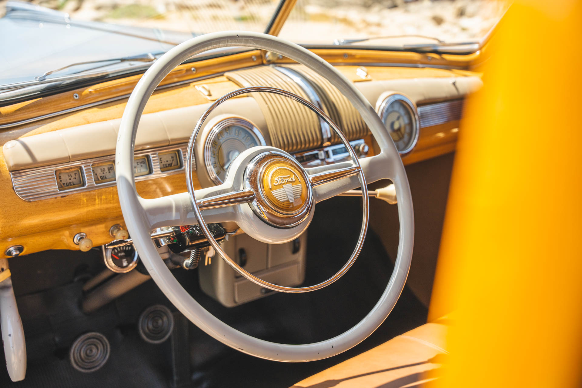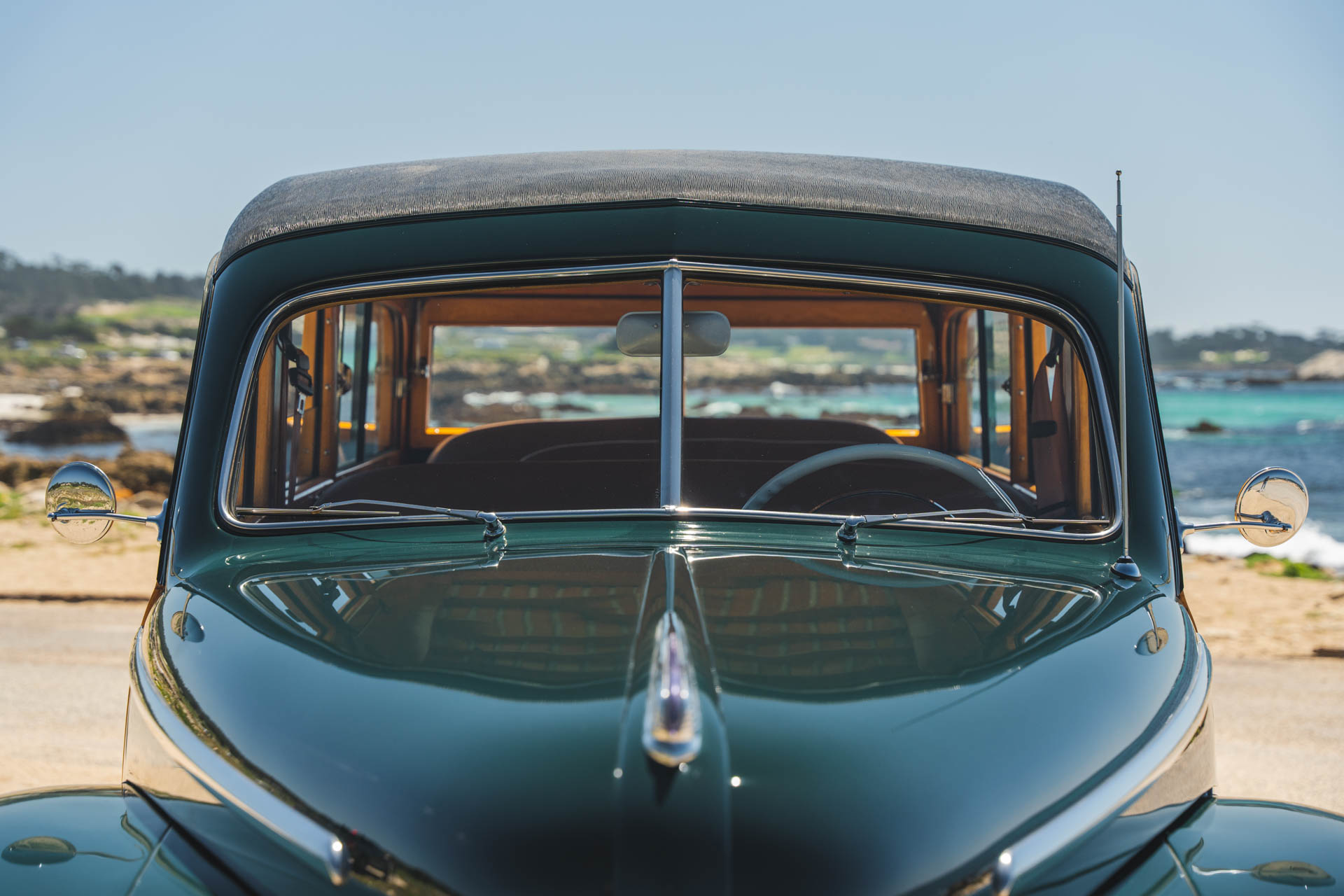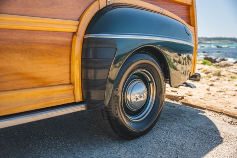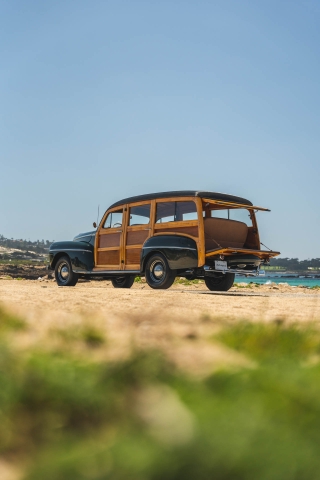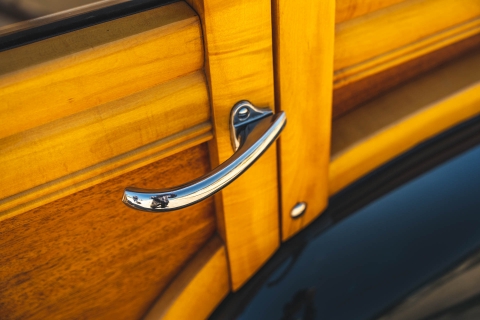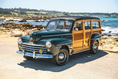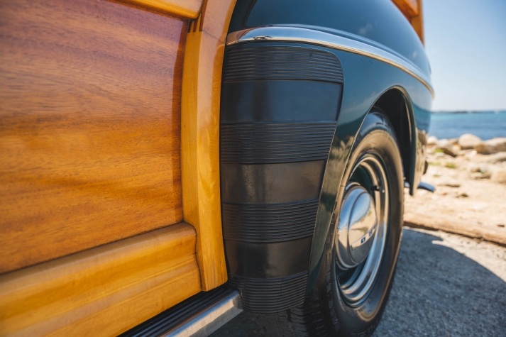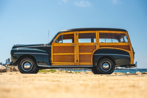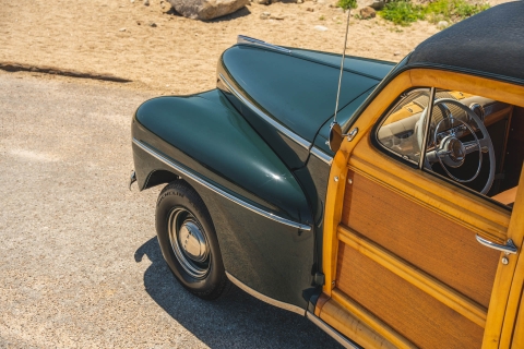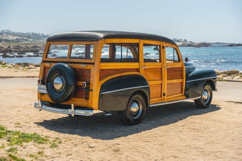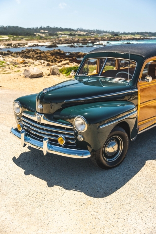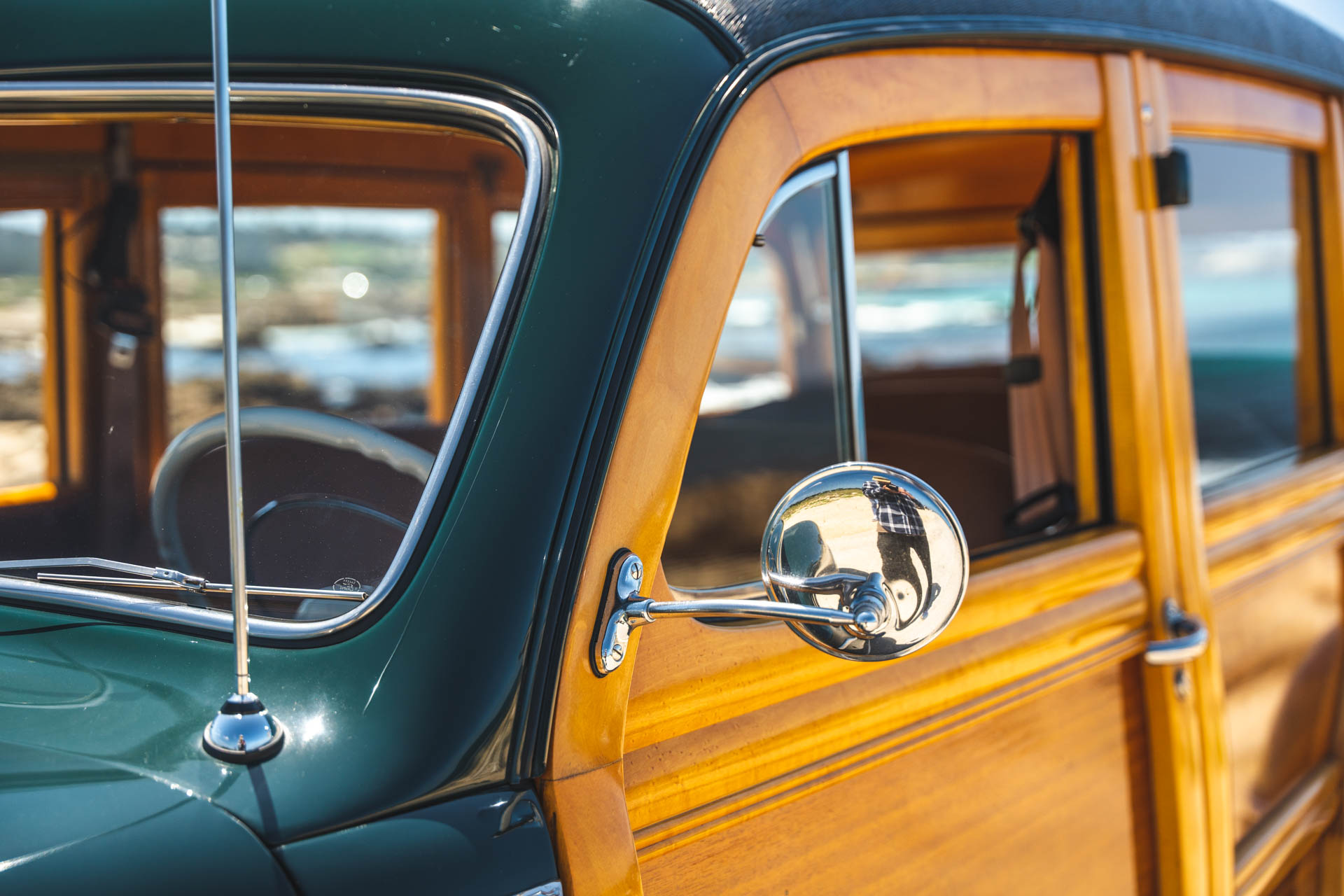 This 1948 Ford Super Deluxe is one of 8,912 station wagons produced for the model year and was refurbished under prior ownership. It is powered by a 239ci flathead V8 linked with a three-speed manual transmission and is finished in Glade Green over tan leather. Equipment includes chrome bumpers, 16” steel wheels with polished hubcaps, three rows of bench seating, a 12-volt electric system, lap belts, and a push-button AM radio. The current owner purchased the car in 2017 and has since added approximately 1k miles. This Super Deluxe is now offered on dealer consignment in California with a Washington title. The car is finished in Glade Green, and the doors and side panels are constructed of wood framing and paneling. Additional exterior equipment includes a black roof, dual side mirrors, a downturned exhaust tip, turn signals, and a chrome grille, bumpers, and trim. The body-color 15” steel wheels feature polished hubcaps and trim rings, and they are mounted with Michelin XW4 tires measuring 205/75. The car was factory equipped with front and rear transverse leaf springs, and stopping power is provided by hydraulic front and rear drums. The cabin features three rows of bench seats upholstered in tan leather, and interior amenities include three-point front seatbelts, second-row lap belts, vent windows, a push-button AM radio, and chrome dashboard trim. The two-spoke steering wheel features a chrome horn ring and fronts a 100-mph speedometer and gauges for fuel level, oil pressure, battery, and coolant temperature. The five-digit odometer shows 57k miles, approximately 1k of which were added under current ownership. Total mileage is unknown. An auxiliary fuel-level gauge has been added beneath the dashboard. The 239ci flathead V8 was factory rated at 100 horsepower and is topped with a Holley carburetor. The electrical system has been converted to 12 volts with an alternator, and the fuel pump is said to have been recently replaced. An engine kill switch has been added. Power is routed to the rear wheels through a column-shifted three-speed manual transmission. Additional photos of the underside are presented in the gallery. The Washington title lists an Antique brand.