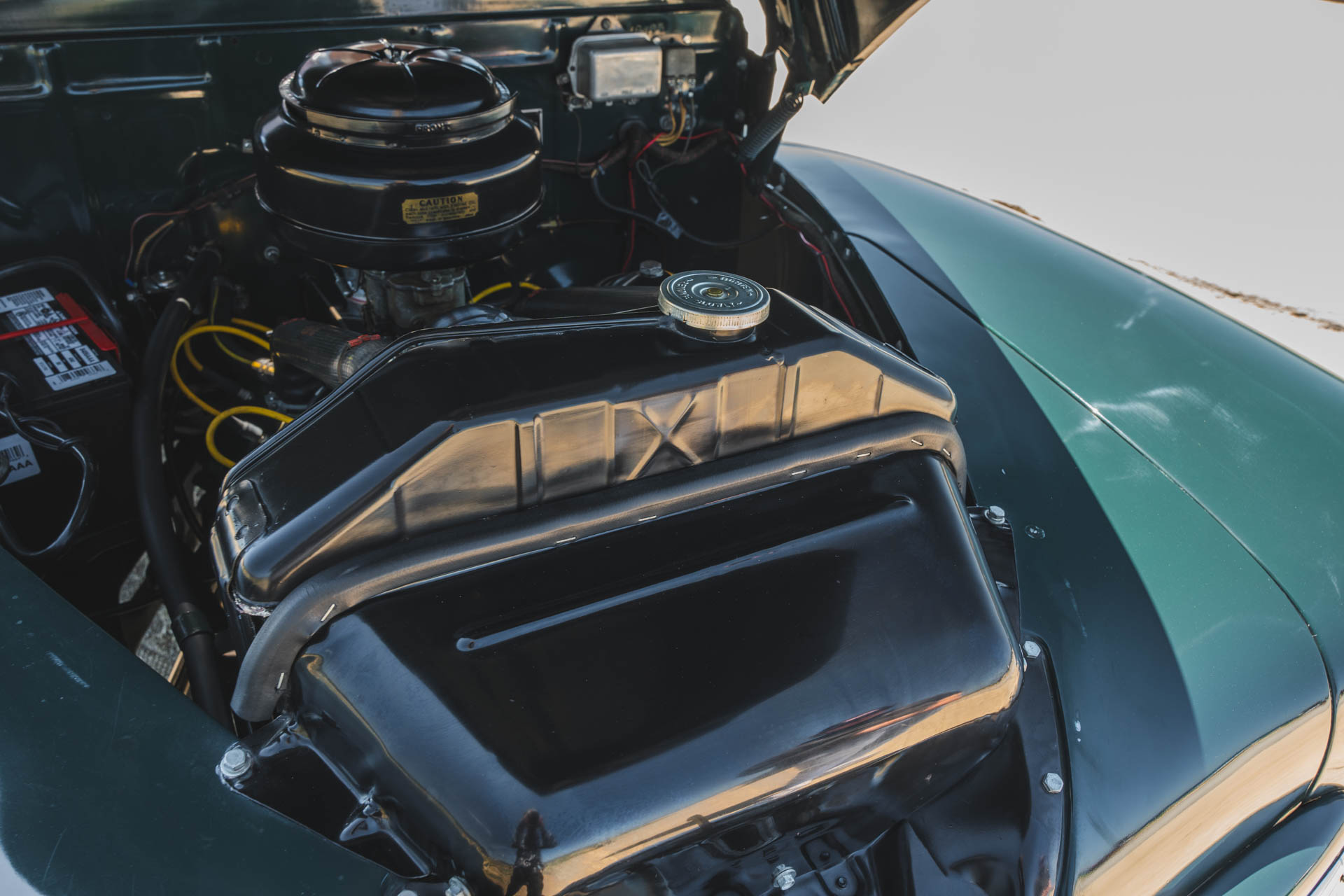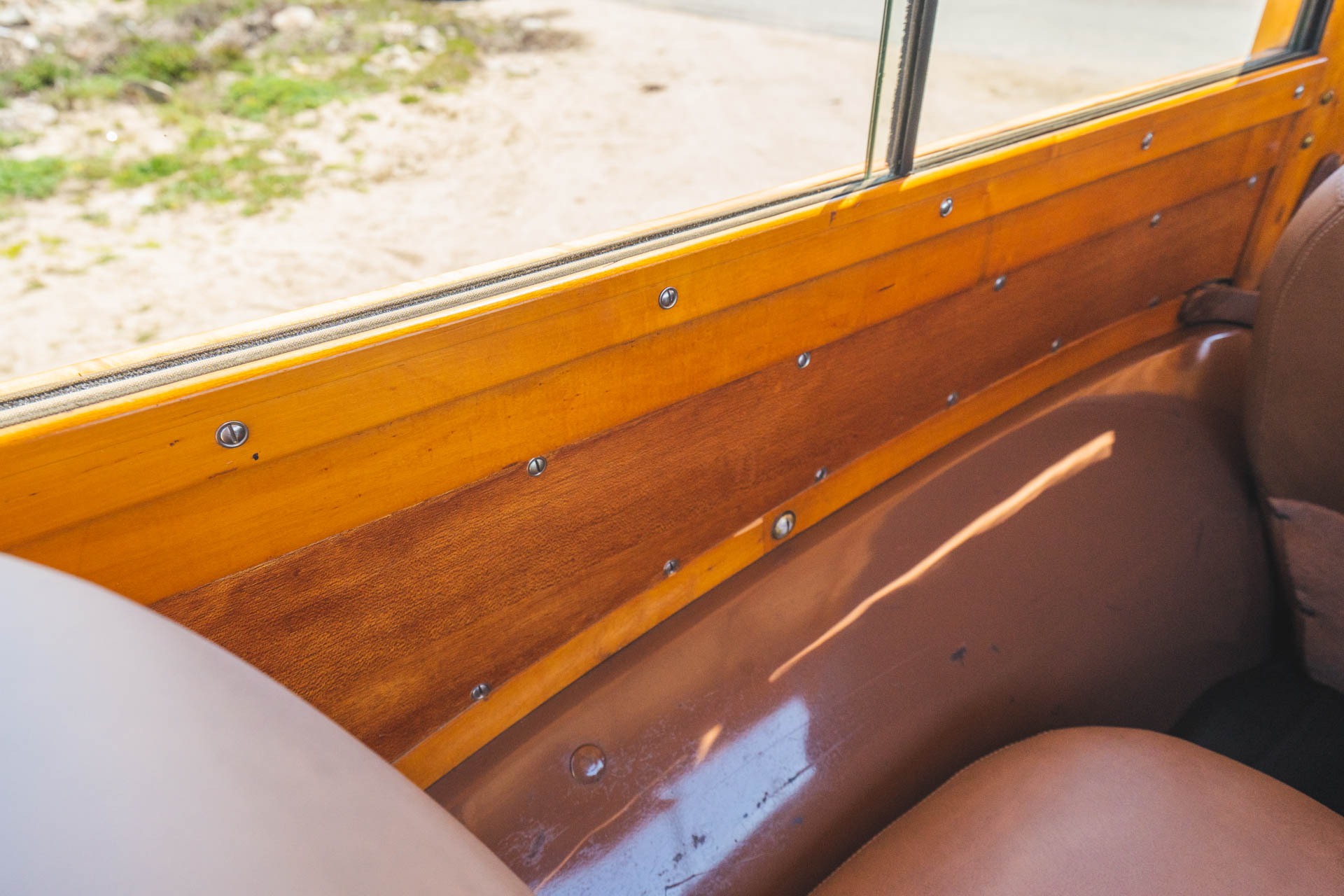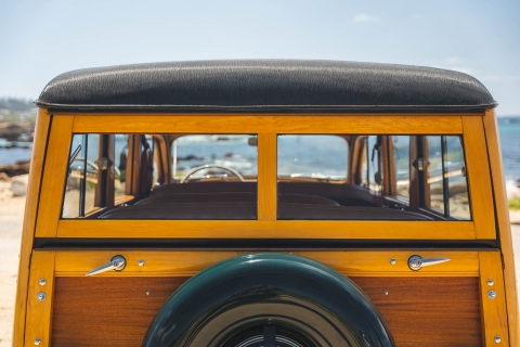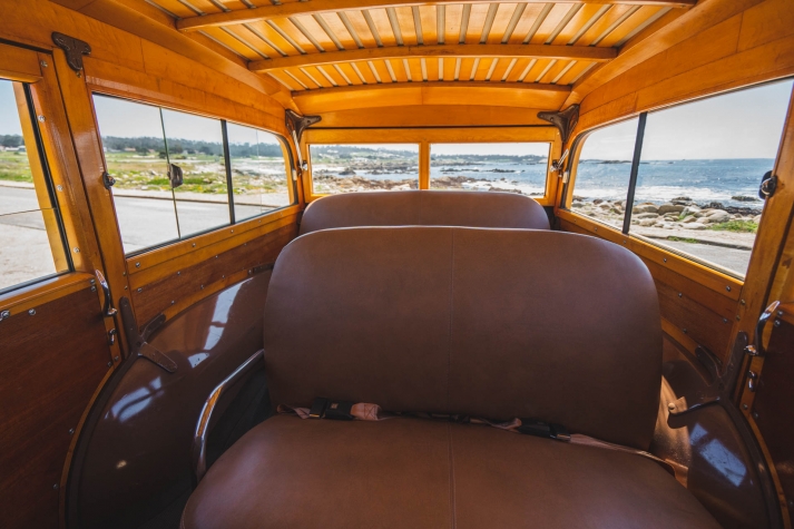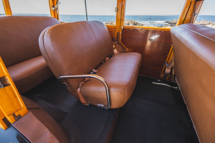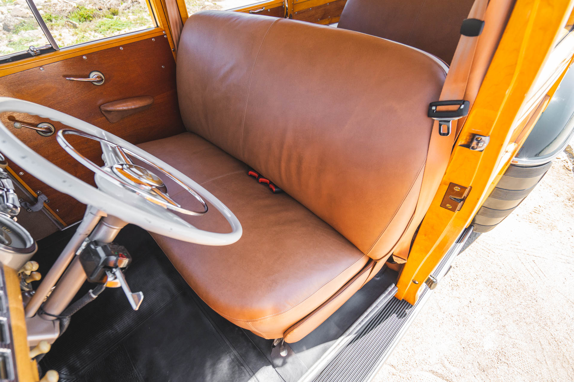 This 1948 Ford Super Deluxe is one of 8,912 station wagons produced for the model year and was refurbished under prior ownership. It is powered by a 239ci flathead V8 linked with a three-speed manual transmission and is finished in Glade Green over tan leather. Equipment includes chrome bumpers, 16” steel wheels with polished hubcaps, three rows of bench seating, a 12-volt electric system, lap belts, and a push-button AM radio. The current owner purchased the car in 2017 and has since added approximately 1k miles. This Super Deluxe is now offered on dealer consignment in California with a Washington title. The car is finished in Glade Green, and the doors and side panels are constructed of wood framing and paneling. Additional exterior equipment includes a black roof, dual side mirrors, a downturned exhaust tip, turn signals, and a chrome grille, bumpers, and trim. The body-color 15” steel wheels feature polished hubcaps and trim rings, and they are mounted with Michelin XW4 tires measuring 205/75. The car was factory equipped with front and rear transverse leaf springs, and stopping power is provided by hydraulic front and rear drums. The cabin features three rows of bench seats upholstered in tan leather, and interior amenities include three-point front seatbelts, second-row lap belts, vent windows, a push-button AM radio, and chrome dashboard trim. The two-spoke steering wheel features a chrome horn ring and fronts a 100-mph speedometer and gauges for fuel level, oil pressure, battery, and coolant temperature. The five-digit odometer shows 57k miles, approximately 1k of which were added under current ownership. Total mileage is unknown. An auxiliary fuel-level gauge has been added beneath the dashboard. The 239ci flathead V8 was factory rated at 100 horsepower and is topped with a Holley carburetor. The electrical system has been converted to 12 volts with an alternator, and the fuel pump is said to have been recently replaced. An engine kill switch has been added. Power is routed to the rear wheels through a column-shifted three-speed manual transmission. Additional photos of the underside are presented in the gallery. The Washington title lists an Antique brand.
