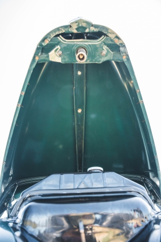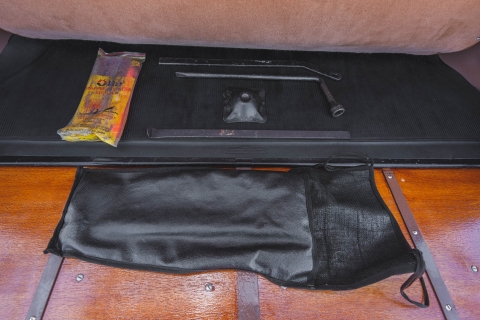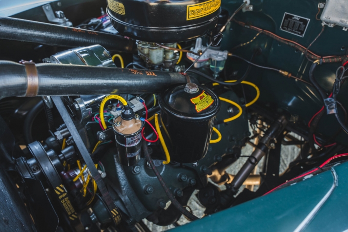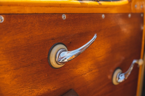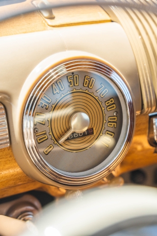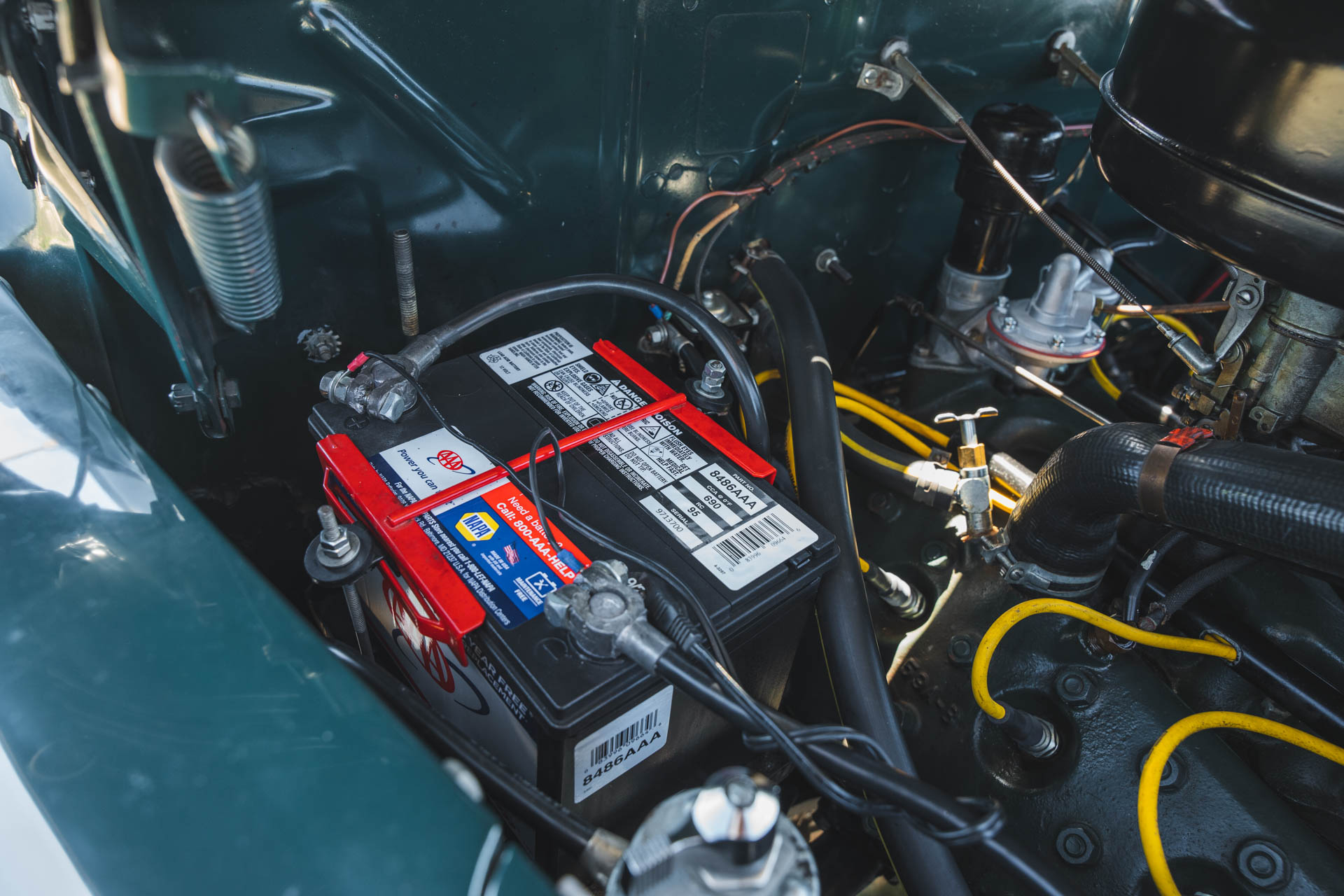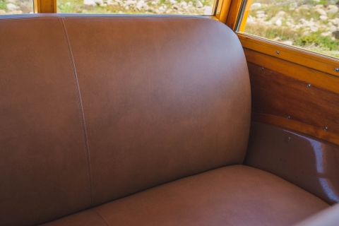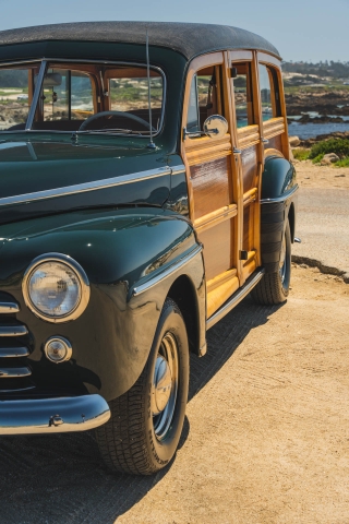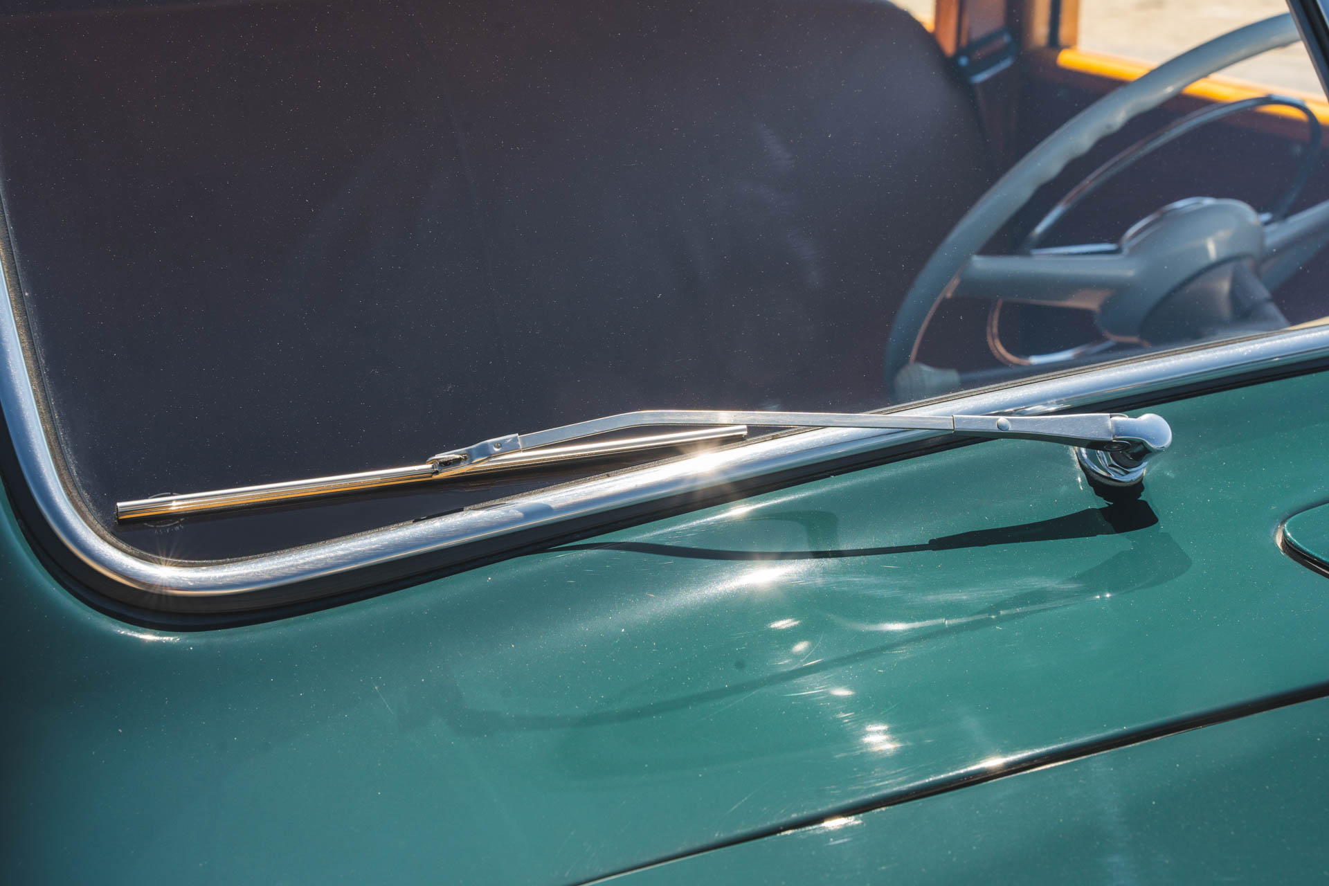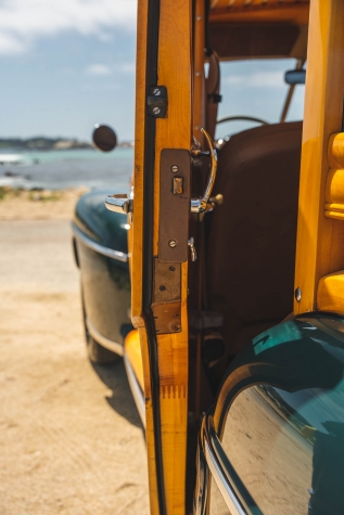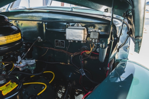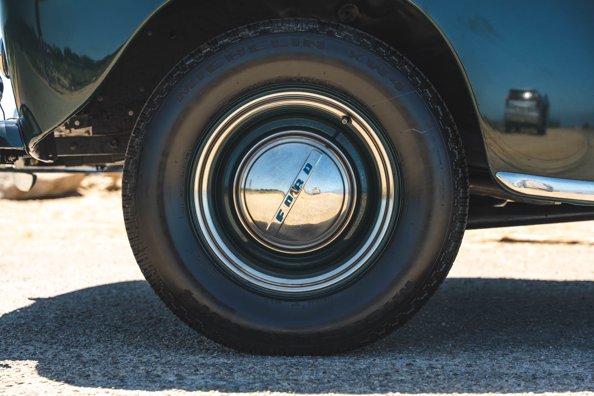 This 1948 Ford Super Deluxe is one of 8,912 station wagons produced for the model year and was refurbished under prior ownership. It is powered by a 239ci flathead V8 linked with a three-speed manual transmission and is finished in Glade Green over tan leather. Equipment includes chrome bumpers, 16” steel wheels with polished hubcaps, three rows of bench seating, a 12-volt electric system, lap belts, and a push-button AM radio. The current owner purchased the car in 2017 and has since added approximately 1k miles. This Super Deluxe is now offered on dealer consignment in California with a Washington title. The car is finished in Glade Green, and the doors and side panels are constructed of wood framing and paneling. Additional exterior equipment includes a black roof, dual side mirrors, a downturned exhaust tip, turn signals, and a chrome grille, bumpers, and trim. The body-color 15” steel wheels feature polished hubcaps and trim rings, and they are mounted with Michelin XW4 tires measuring 205/75. The car was factory equipped with front and rear transverse leaf springs, and stopping power is provided by hydraulic front and rear drums. The cabin features three rows of bench seats upholstered in tan leather, and interior amenities include three-point front seatbelts, second-row lap belts, vent windows, a push-button AM radio, and chrome dashboard trim. The two-spoke steering wheel features a chrome horn ring and fronts a 100-mph speedometer and gauges for fuel level, oil pressure, battery, and coolant temperature. The five-digit odometer shows 57k miles, approximately 1k of which were added under current ownership. Total mileage is unknown. An auxiliary fuel-level gauge has been added beneath the dashboard. The 239ci flathead V8 was factory rated at 100 horsepower and is topped with a Holley carburetor. The electrical system has been converted to 12 volts with an alternator, and the fuel pump is said to have been recently replaced. An engine kill switch has been added. Power is routed to the rear wheels through a column-shifted three-speed manual transmission. Additional photos of the underside are presented in the gallery. The Washington title lists an Antique brand.