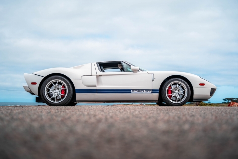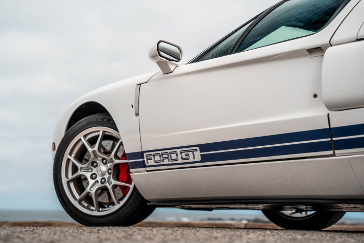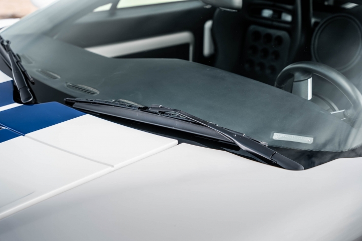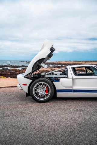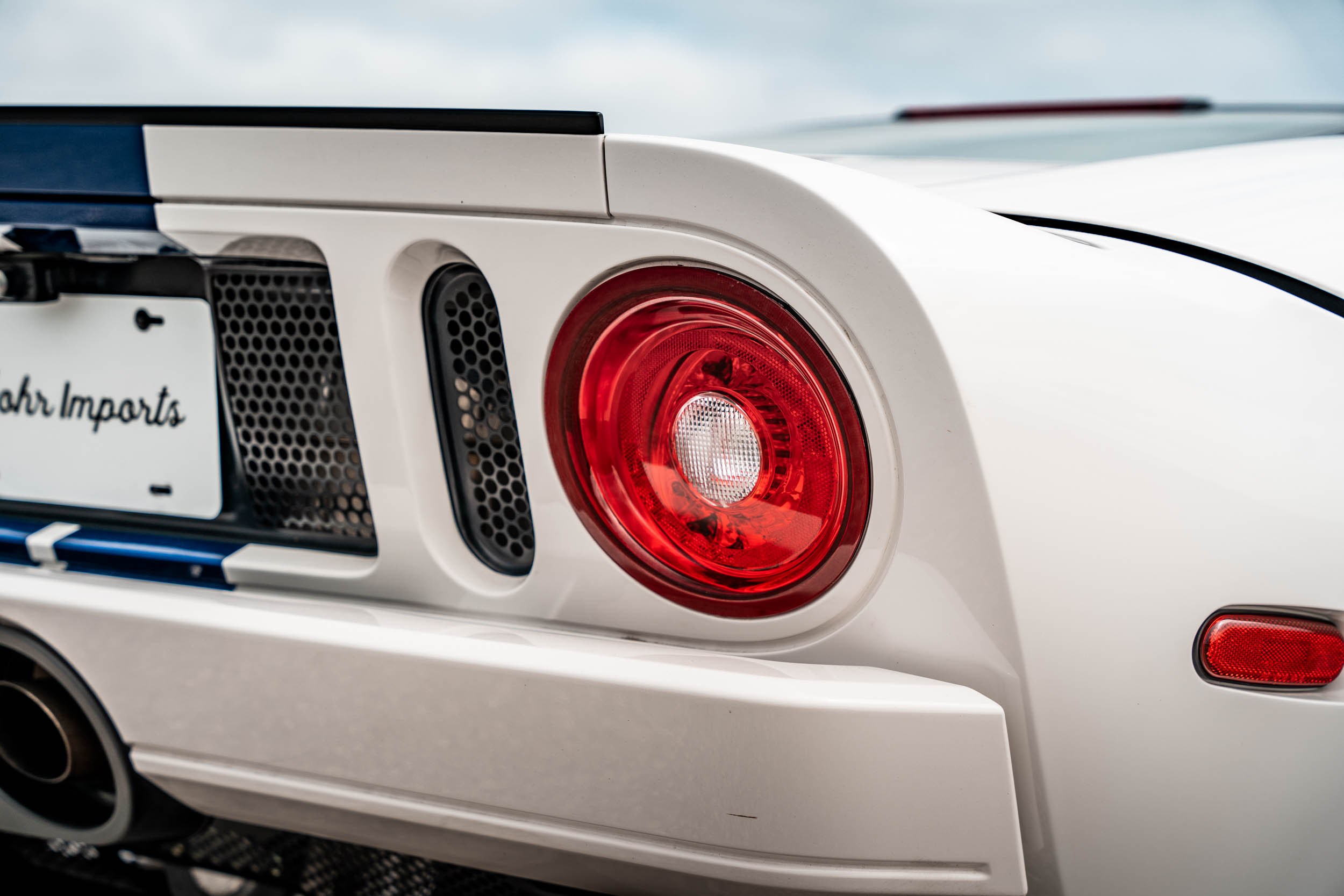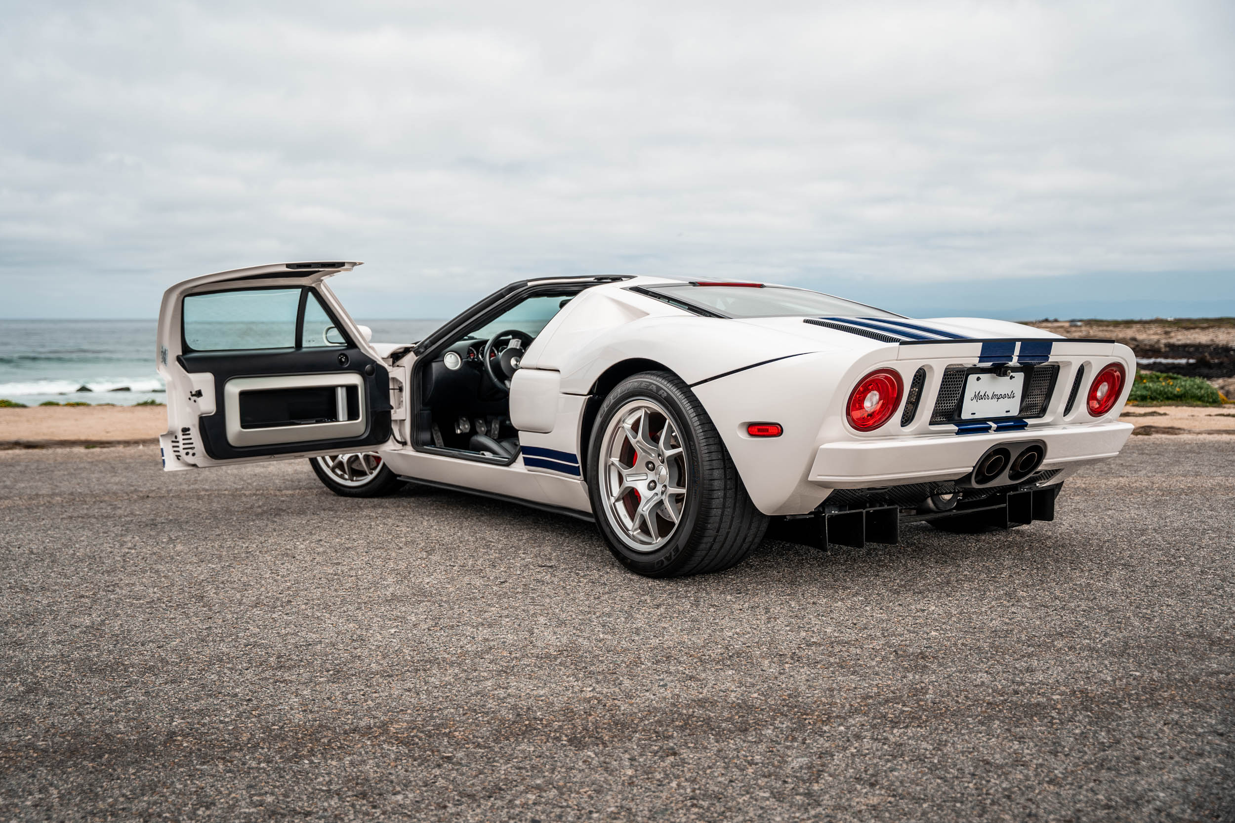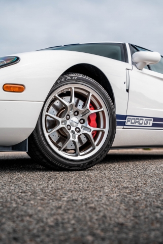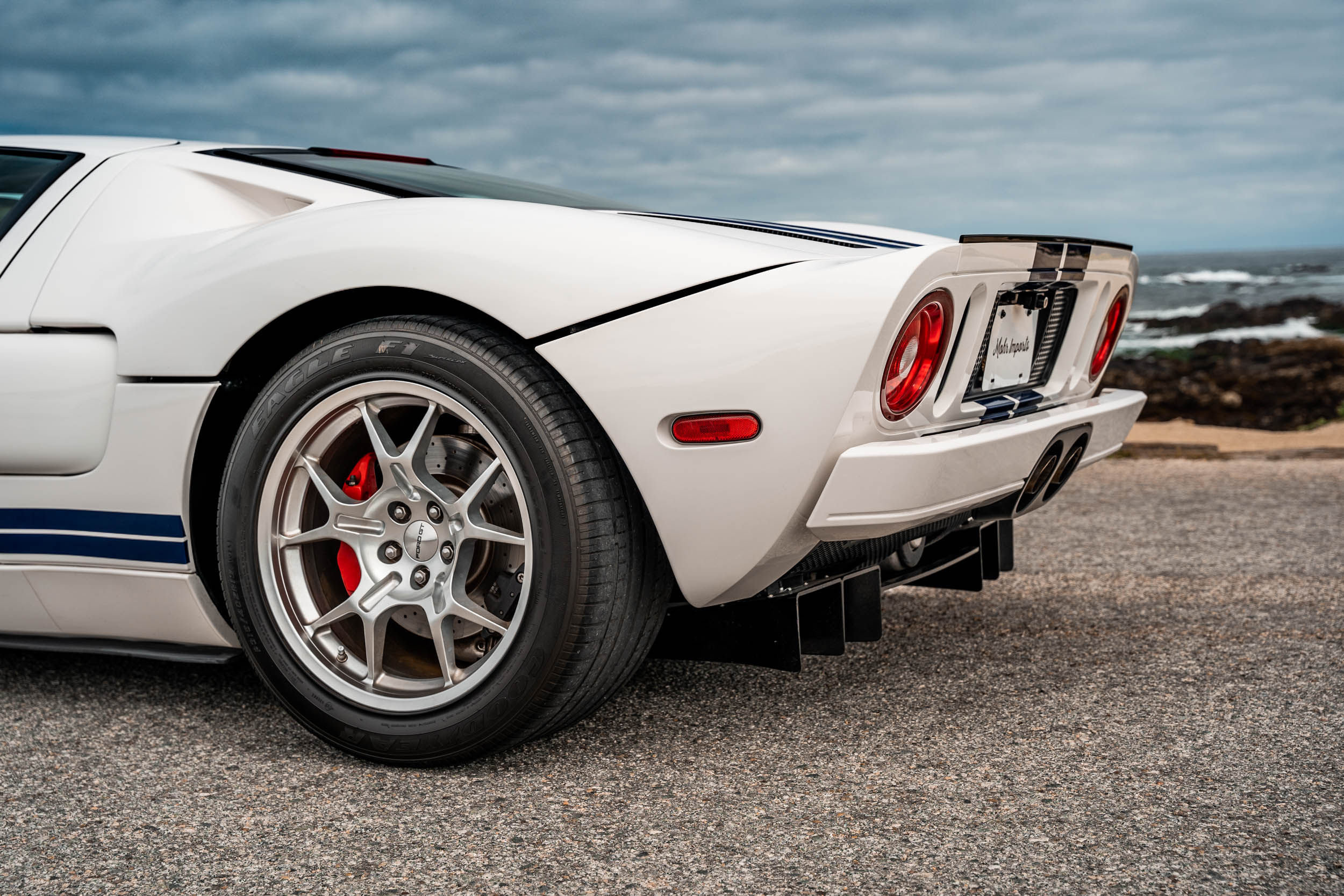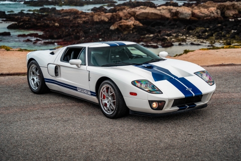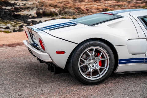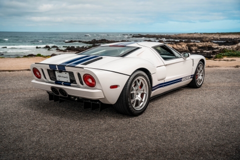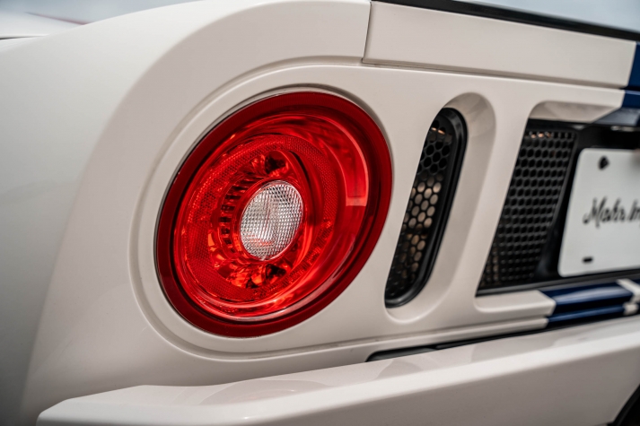 The Camilo Pardo-designed GT was styled as an homage to the Le Mans-winning GT40 racing cars of the 1960s and features aluminum body panels over an extruded-aluminum space frame and roll-bonded floors. This example is one of 503 finished in Centennial White for the model year and features optional over-the-top blue stripes and Ford GT graphics, HID headlights, fog lights, side air intakes, a vented hood, a front splitter, a rear diffuser, and a dual center-exit exhaust system.