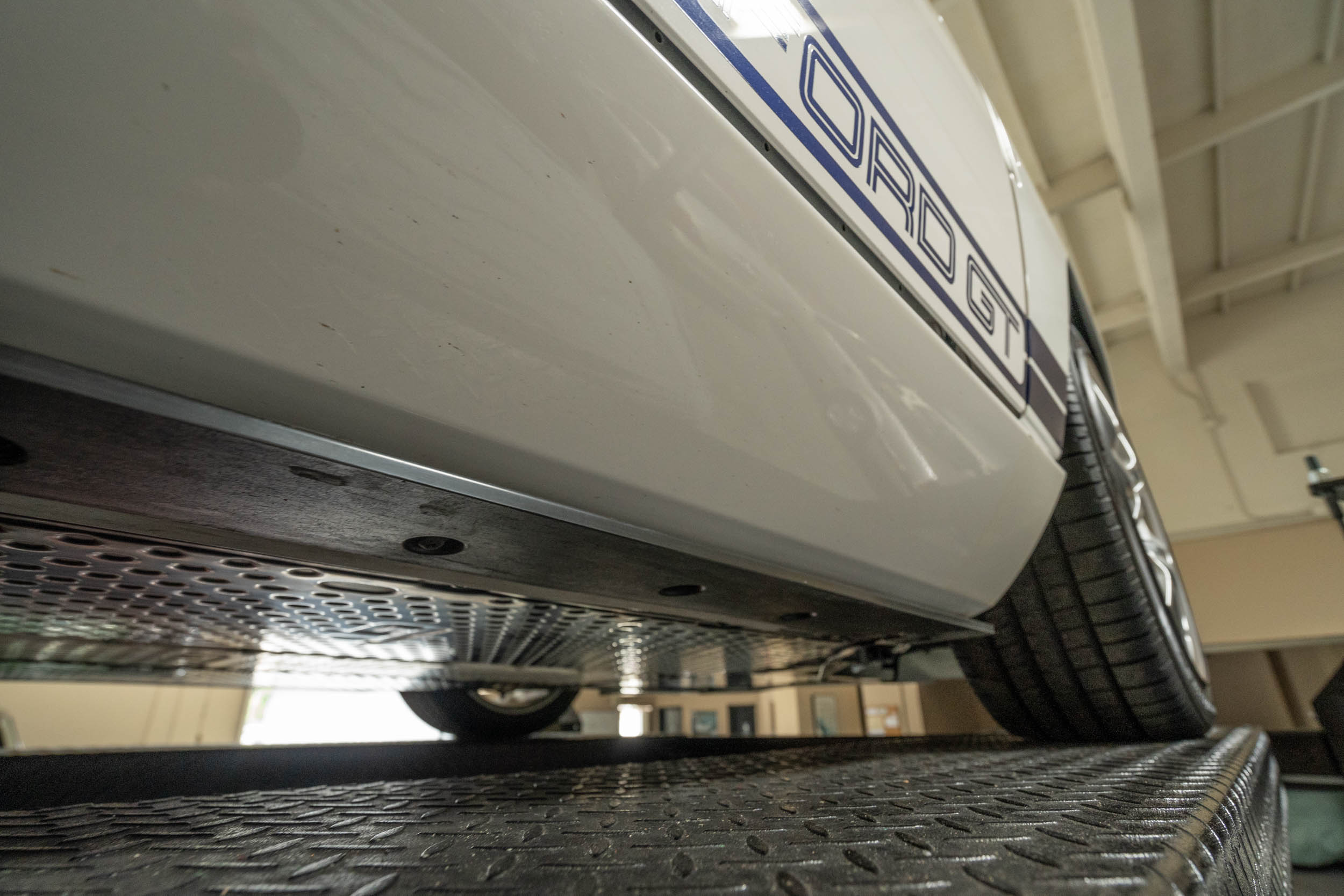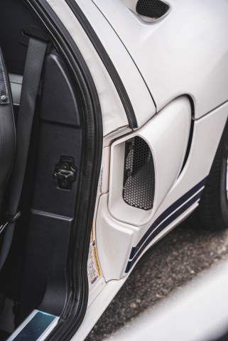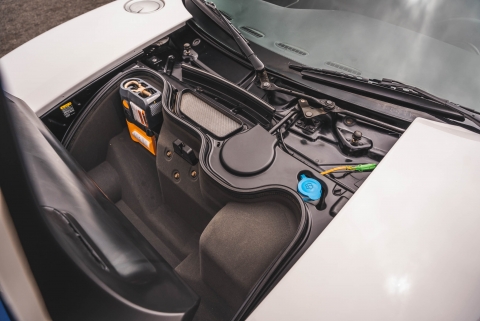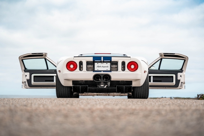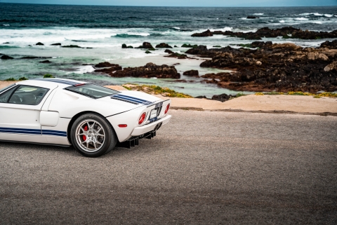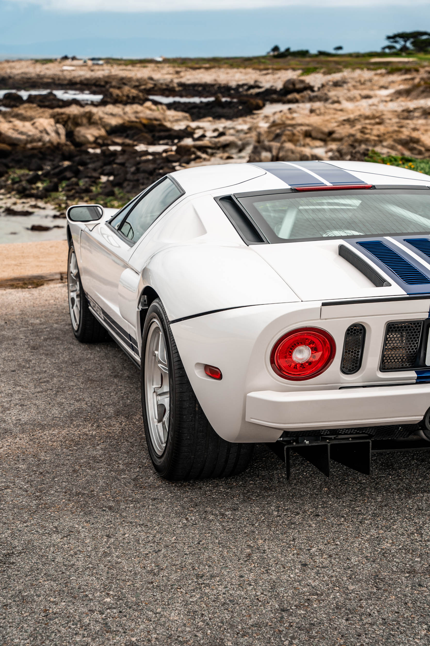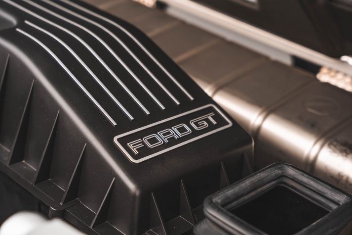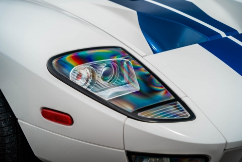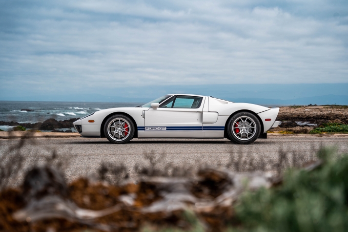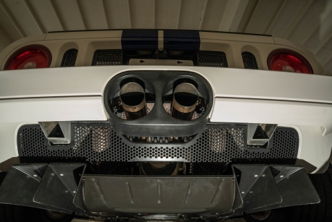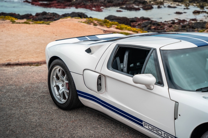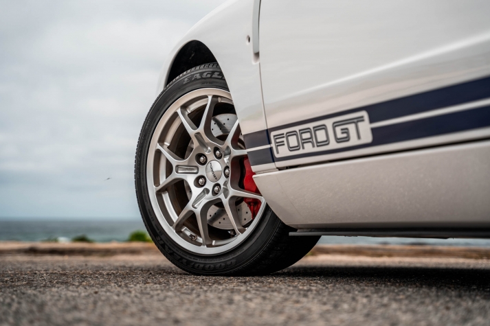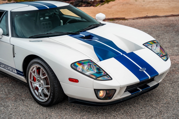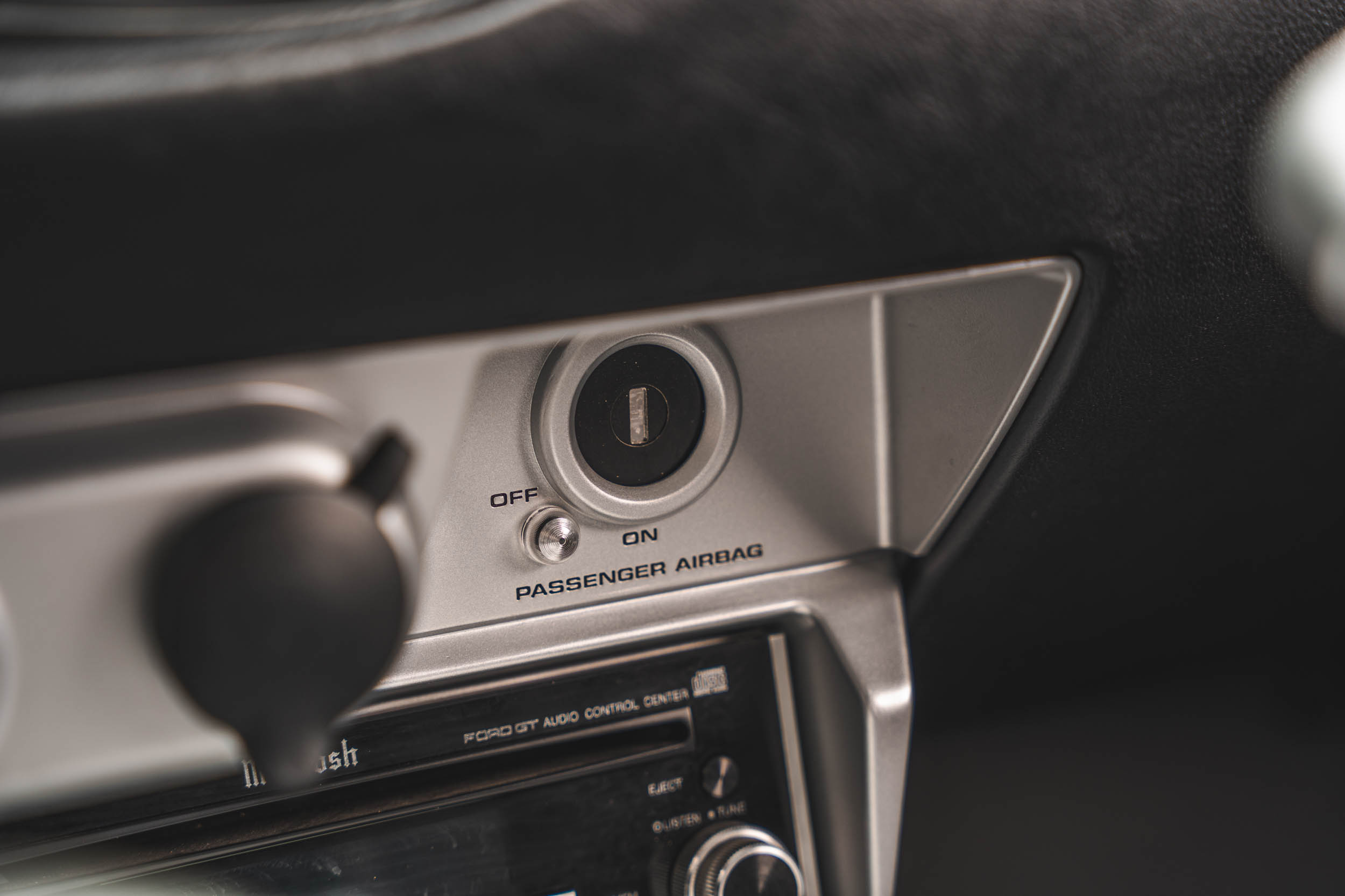 The Camilo Pardo-designed GT was styled as an homage to the Le Mans-winning GT40 racing cars of the 1960s and features aluminum body panels over an extruded-aluminum space frame and roll-bonded floors. This example is one of 503 finished in Centennial White for the model year and features optional over-the-top blue stripes and Ford GT graphics, HID headlights, fog lights, side air intakes, a vented hood, a front splitter, a rear diffuser, and a dual center-exit exhaust system.