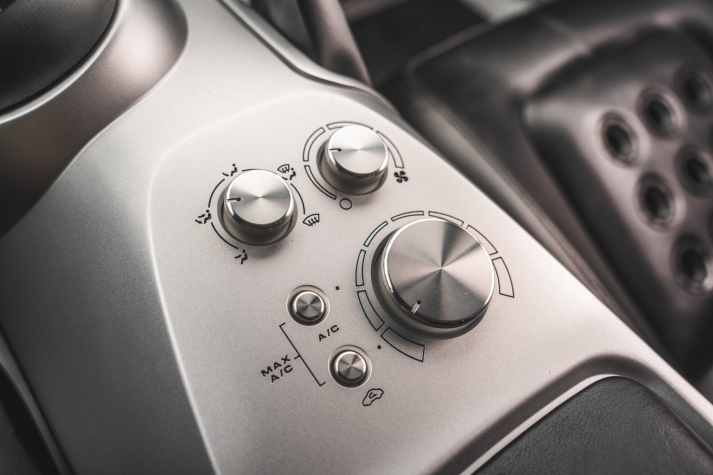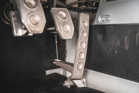 The cockpit is trimmed in Ebony leather, and rubber mats cover bare aluminum floors. Manually adjusted seats were designed by Sparco and feature carbon-fiber shells with GT40-style ventilation grommets and harness slots. The console on the center tunnel houses rotary climate controls, and amenities include a McIntosh CD stereo, air conditioning, remote keyless entry, and push-button ignition. Signs of wear are noted on the seat bolsters and in the footwells.