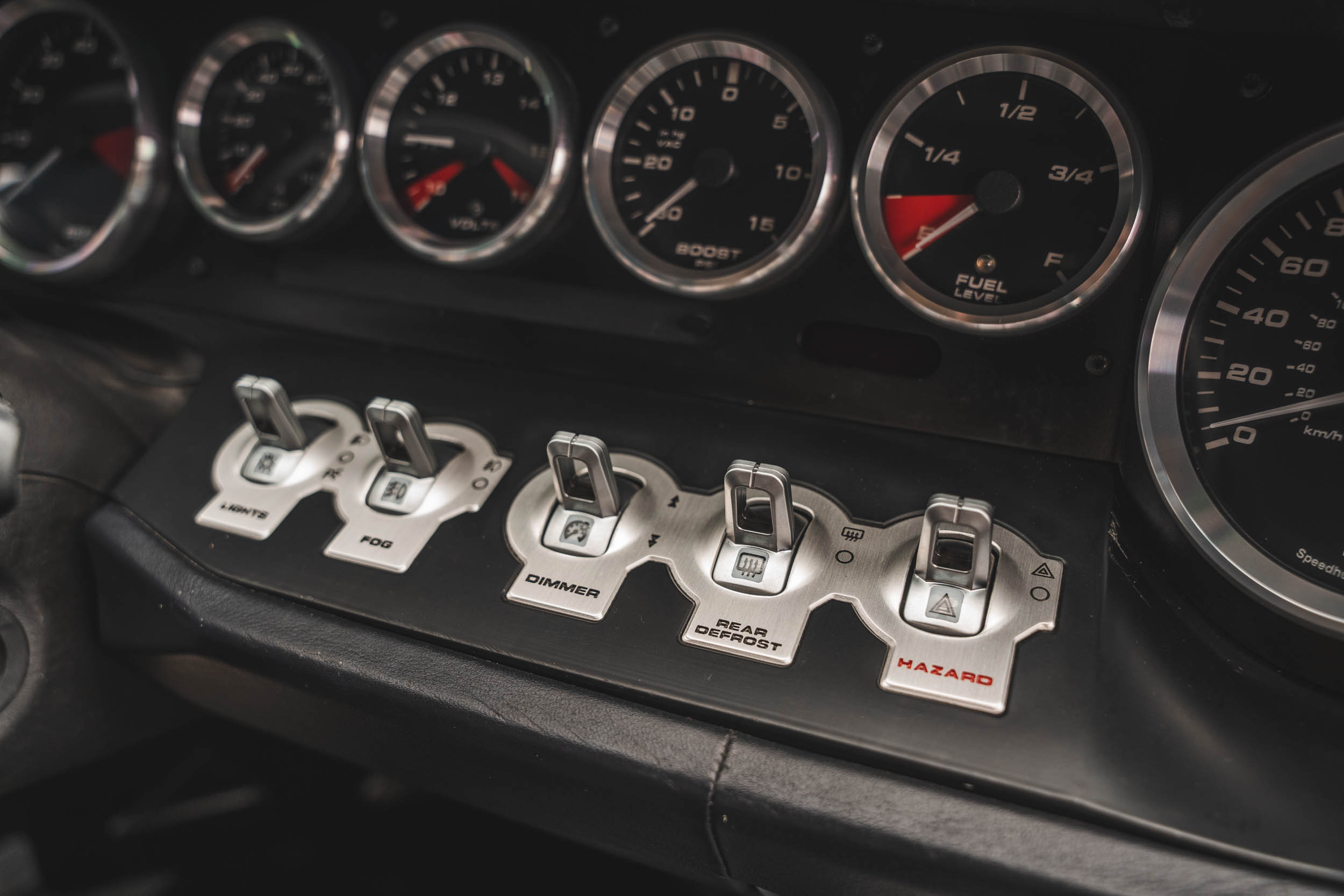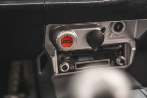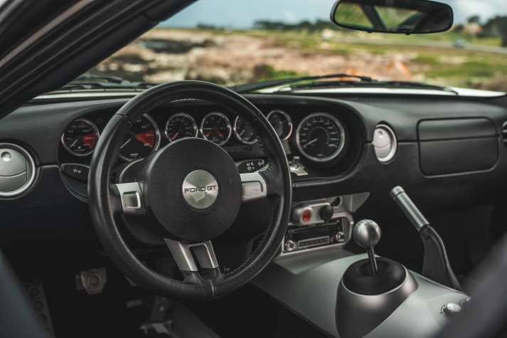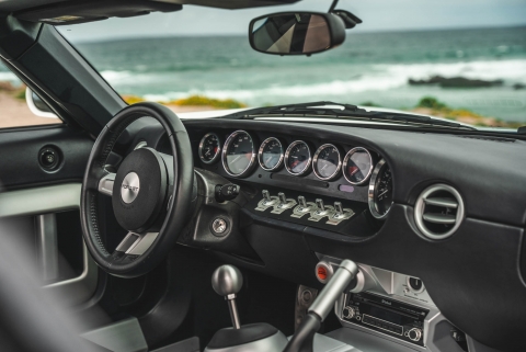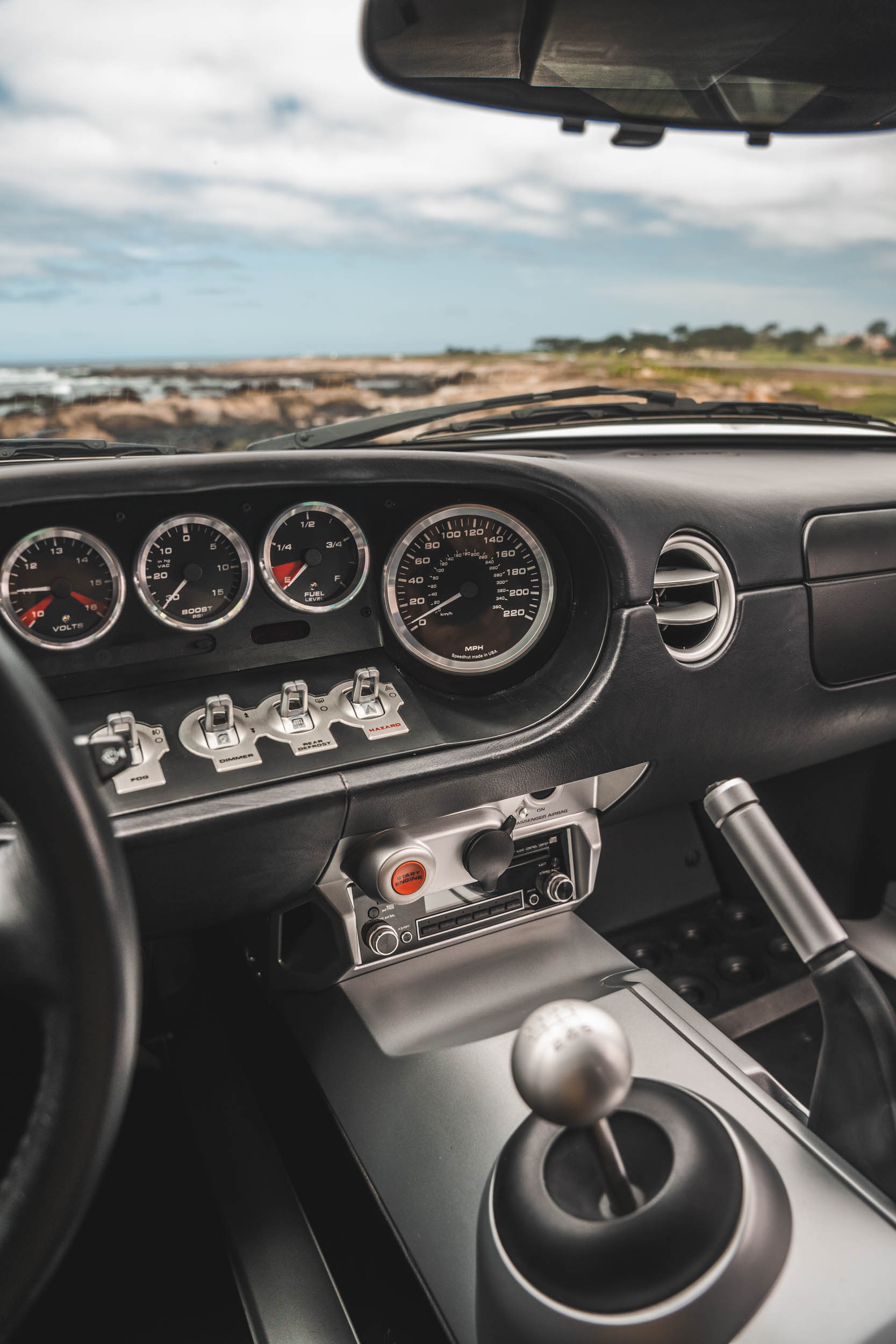 The leather-wrapped steering wheel is affixed to a tilting and telescoping column ahead of the GT40-inspired instrument array, which is a replacement that was installed in February 2021 by Auto House of Clovis, California. Gauges consist of a central tachometer with a 6,500-rpm redline, an offset 220-mph speedometer, and auxiliary gauges. The digital odometer shows 12k miles.