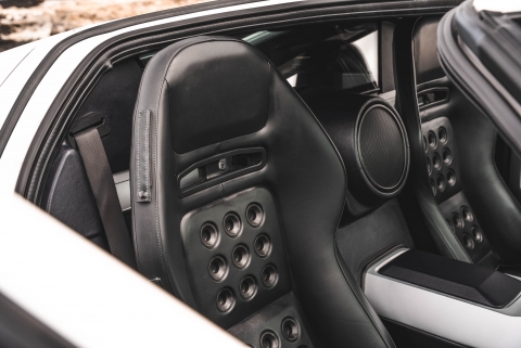 Factory-optional BBS forged lightweight aluminum wheels measure 18” up front and 19” out back and are mounted with Goodyear Eagle F1 Supercar tires. The Brembo braking system features optional red-painted four-piston monoblock calipers with cross-drilled and ventilated rotors that measure 14” up front and 13.2” out back.