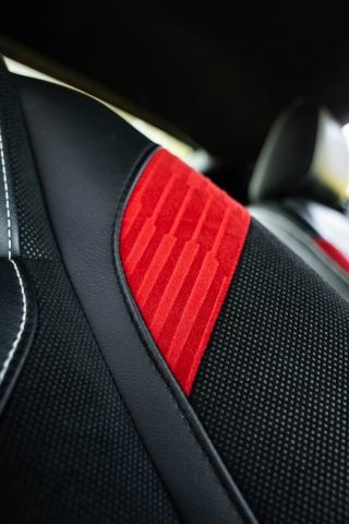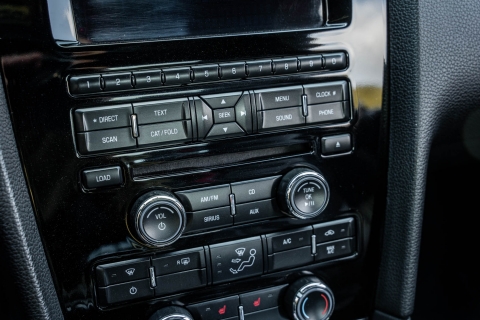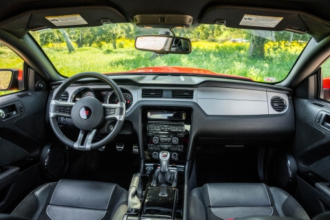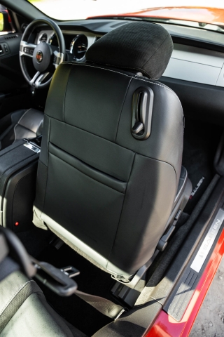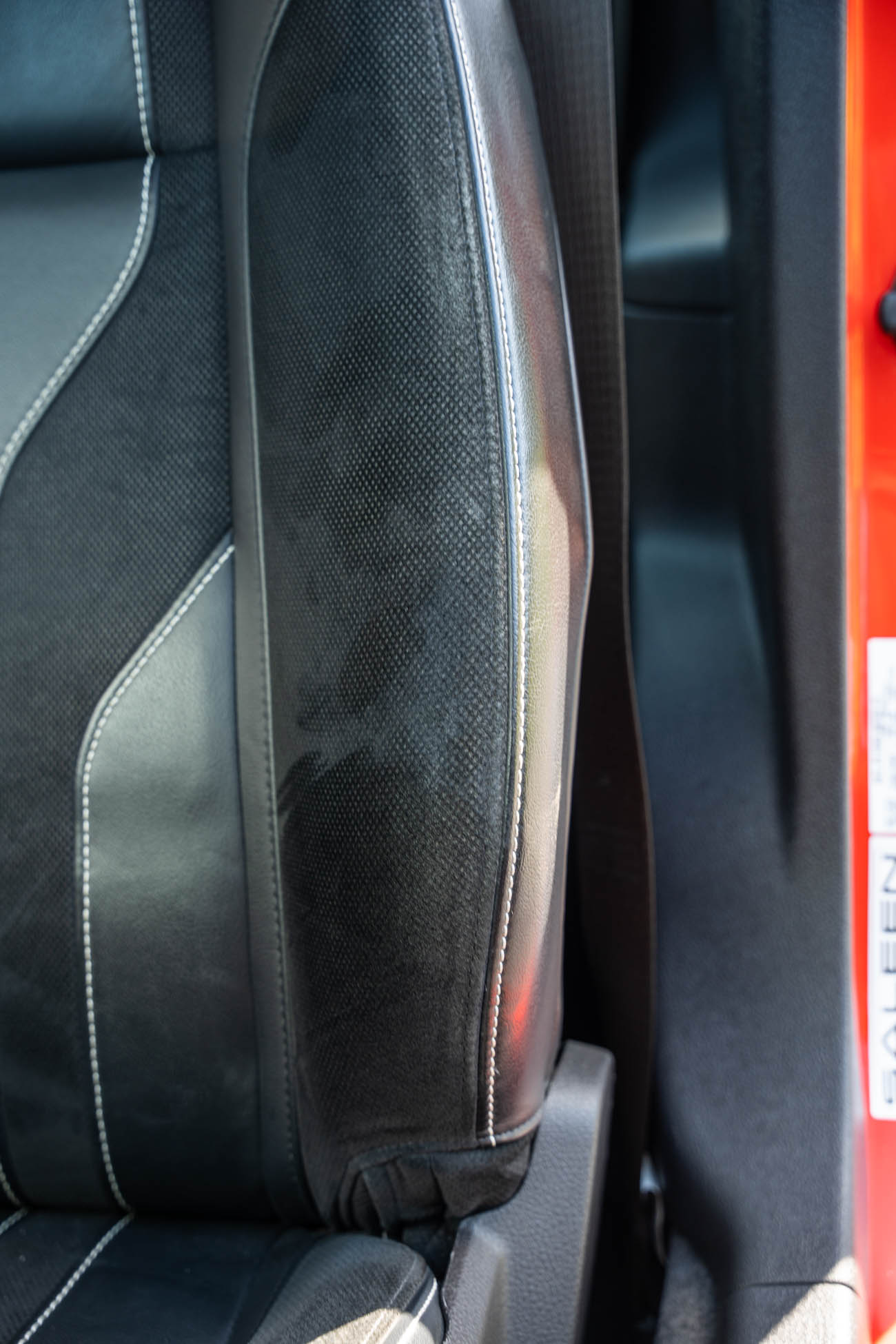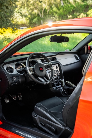 The seats are trimmed in black leather with Ultrasuede inserts, and red accents adorn the inner bolsters of the heated front sport seats. Appointments include air conditioning, cruise control, illuminated sills, gloss black center console trim, Saleen-embroidered headrests, a factory sound system with Sirius connectivity and SYNC mobile phone integration, and a Saleen plaque affixed to the center console.