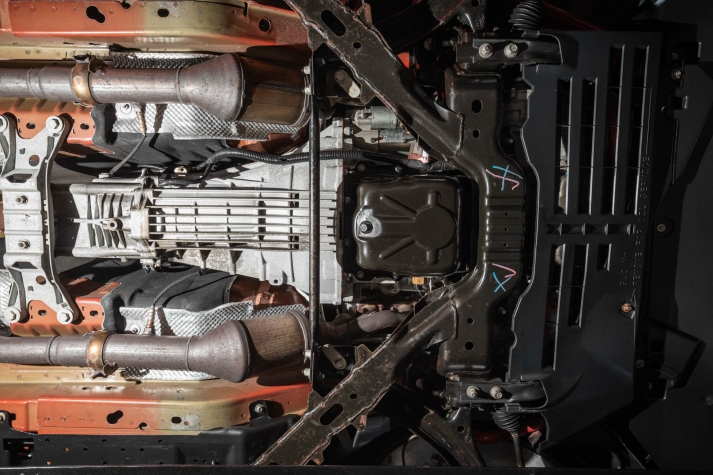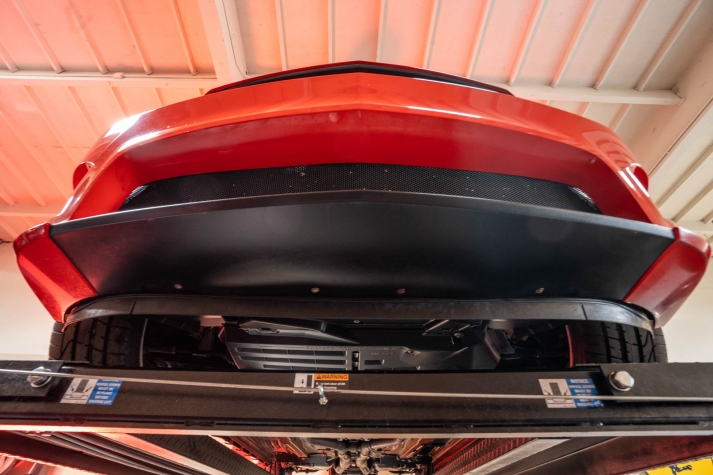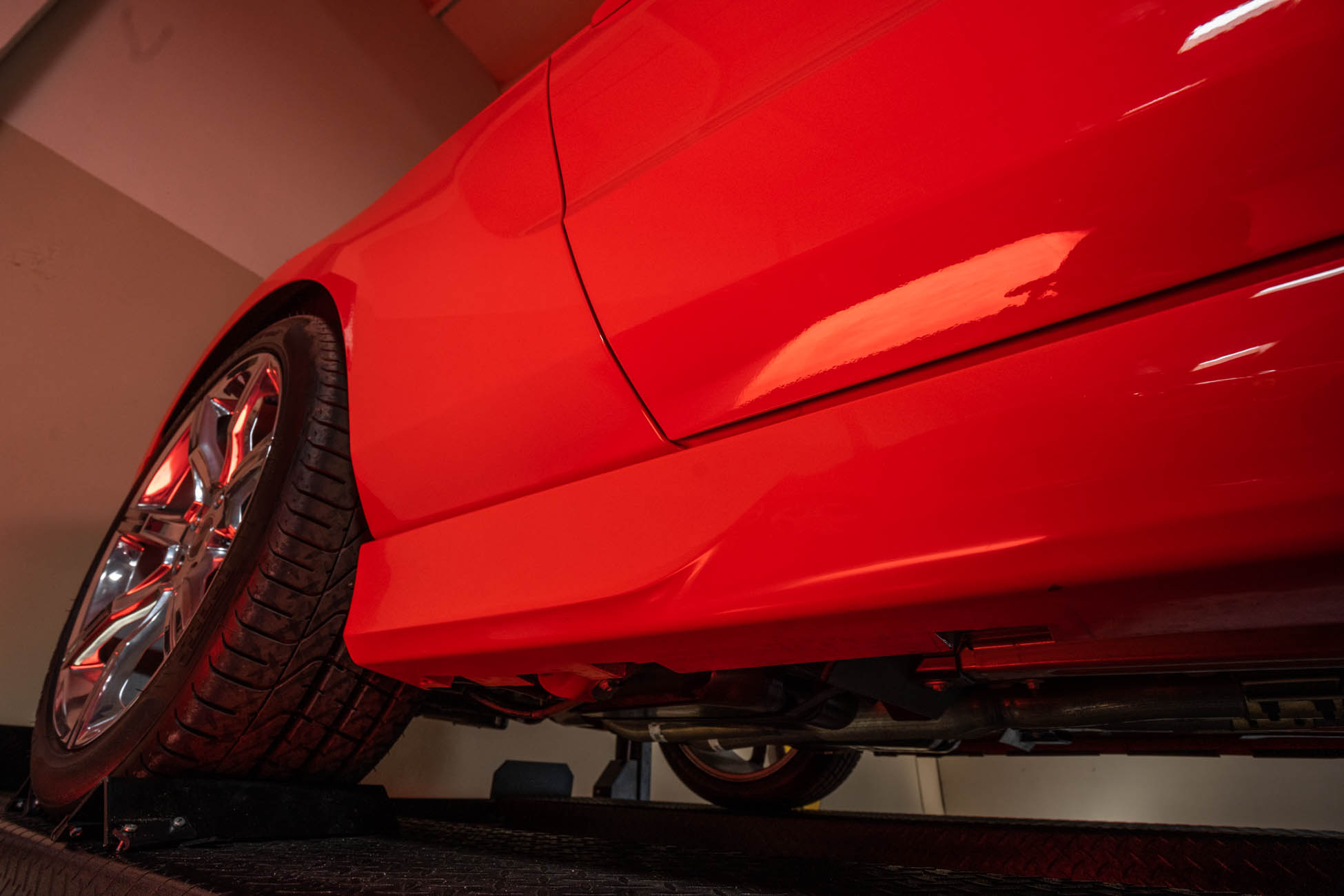 The Saleen dual exhaust system is equipped with Borla mufflers. Additional photos of the underbody are included in the gallery.