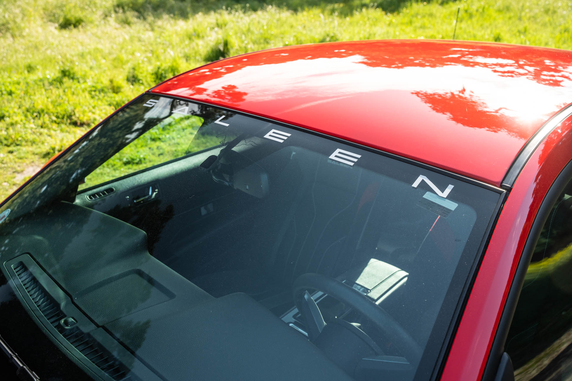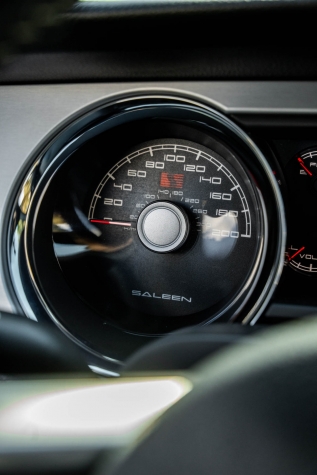 The multifunction steering wheel wears a Saleen badge, and it fronts a Saleen-branded 200-mph speedometer, a matching 8k-rpm tachometer, and a quartet of auxiliary gauges. The digital odometer shows 25k miles, approximately 500 of which were added under current ownership.