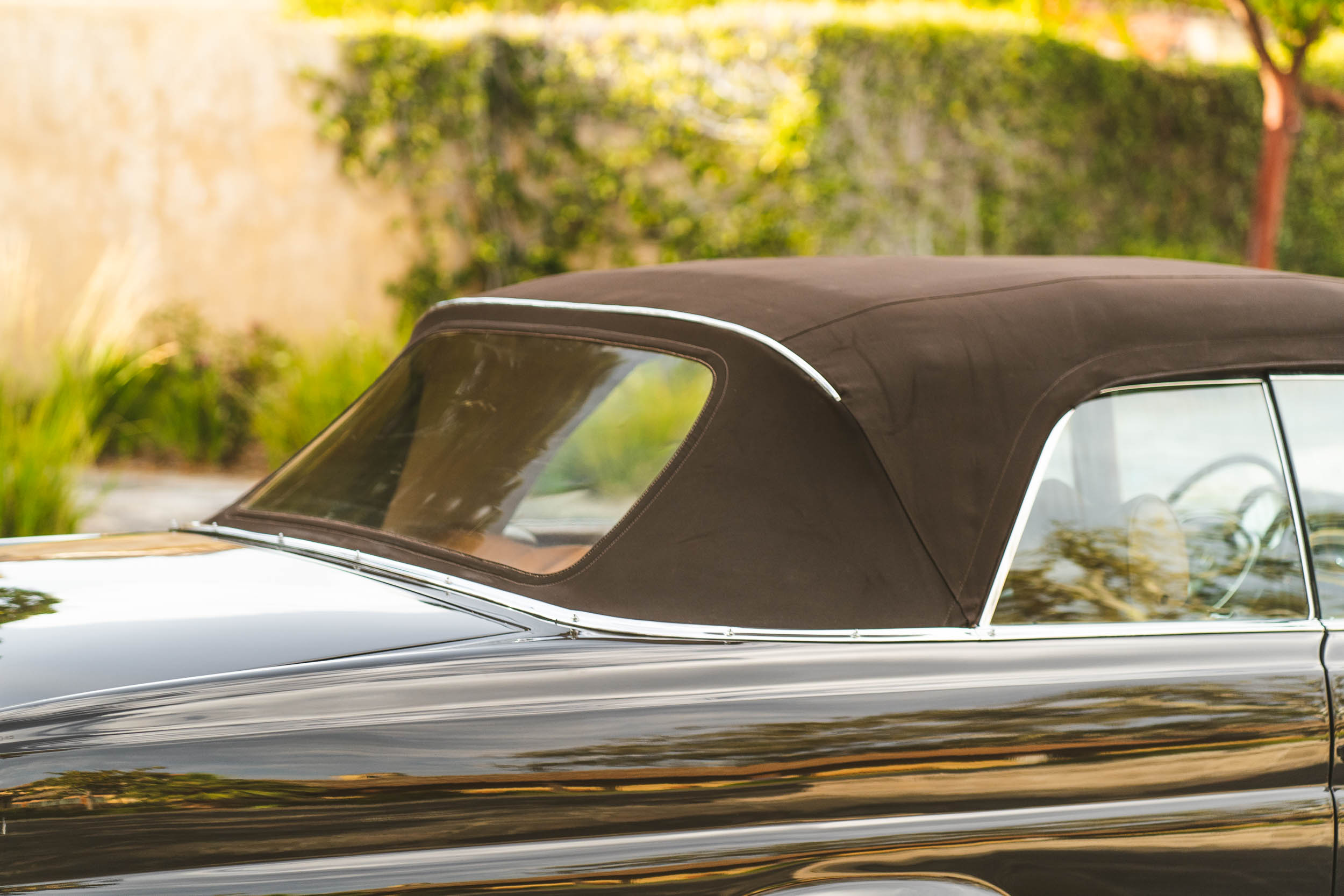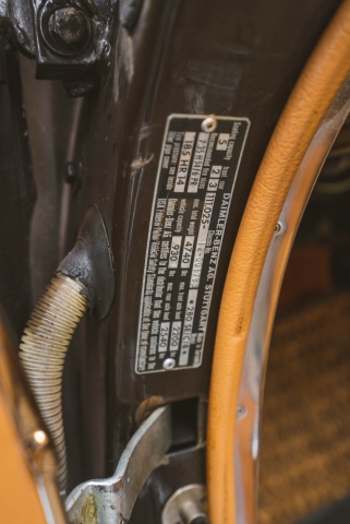 The car was delivered new in Tobacco Brown (423) and was refinished under previous ownership. Features include a brown soft top with a tan boot cover, a chrome-finished grille and bumpers, rocker-panel trim, and side-marker lights. The selling dealer notes cosmetic imperfections, as pictured in the gallery below.