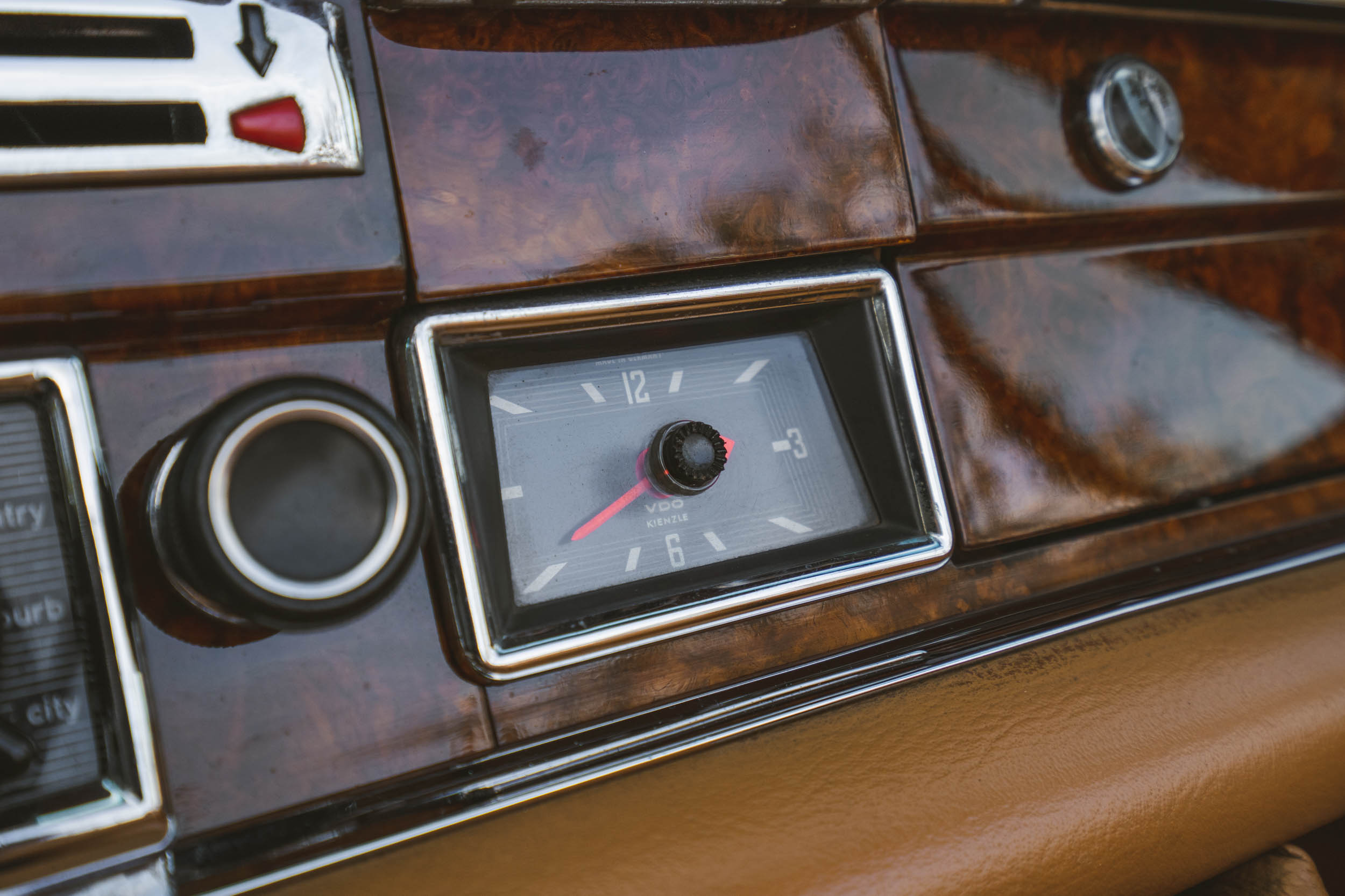 The interior features tan leather upholstery complemented by color-coordinated trim and carpeting. Wood trim adorns the dashboard and console box, and amenities include power windows, a VDO/Kienzle clock, a Becker Grand Prix AM/FM stereo, and Kühlmeister air conditioning. The seller notes that the heater-control levers are inoperable.